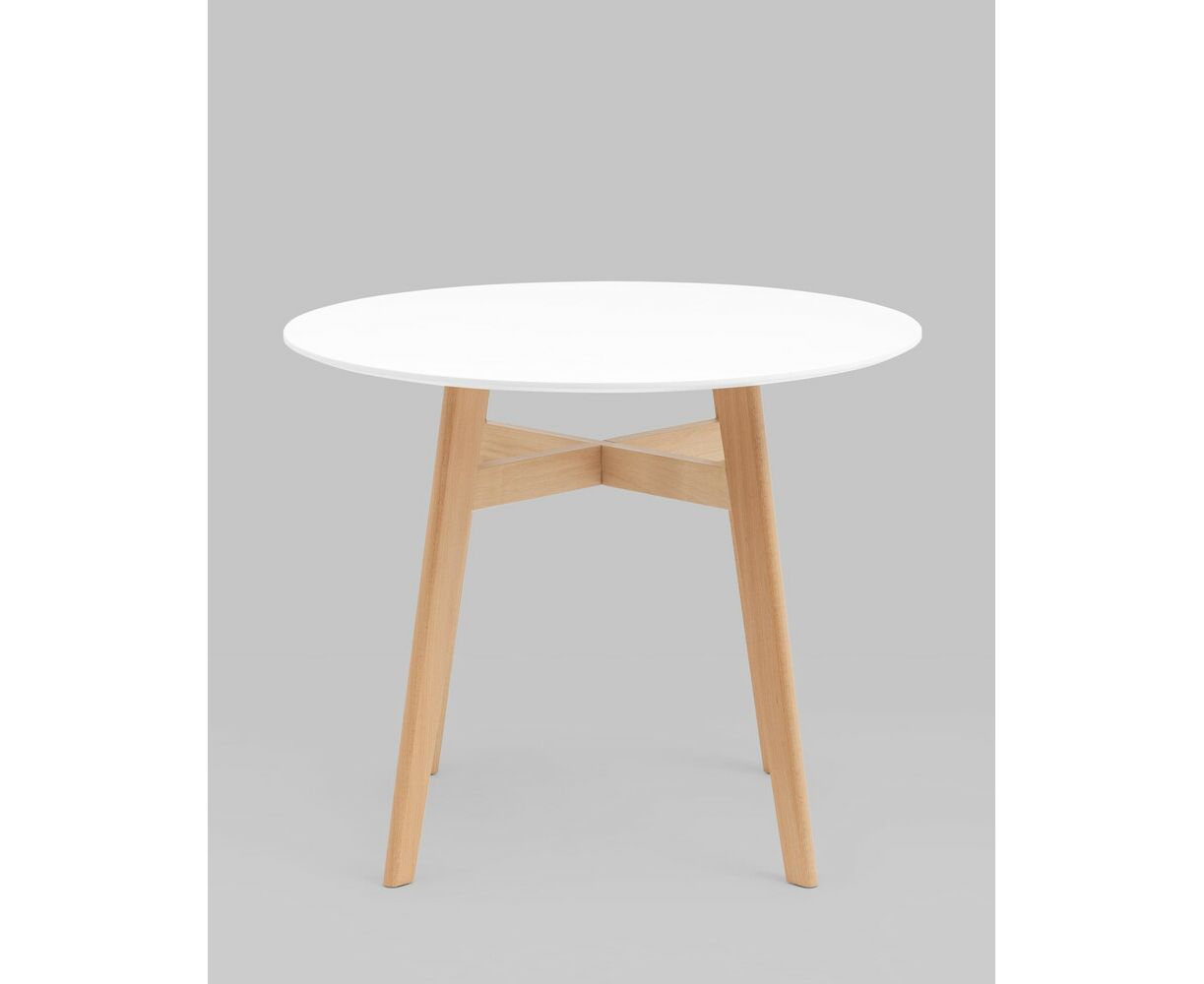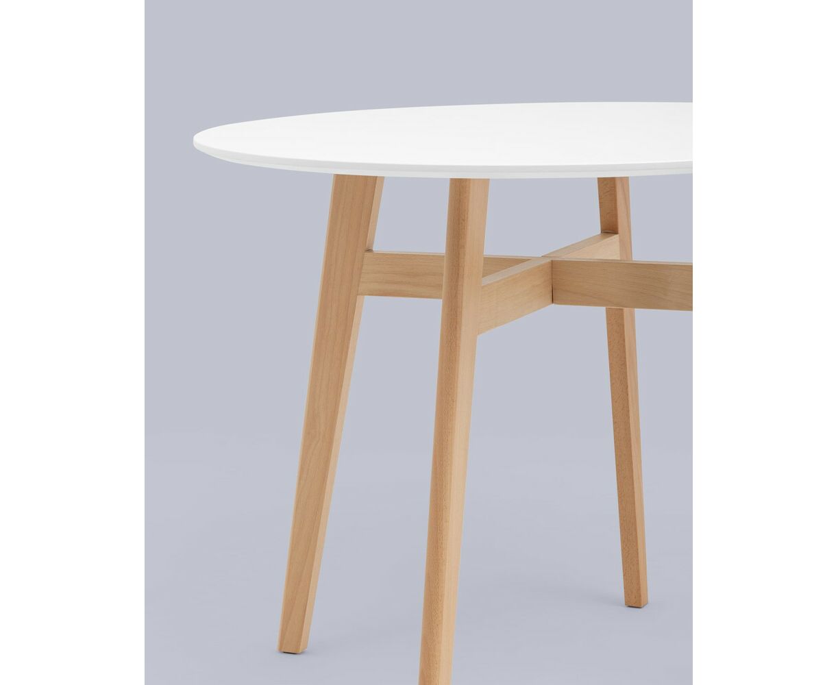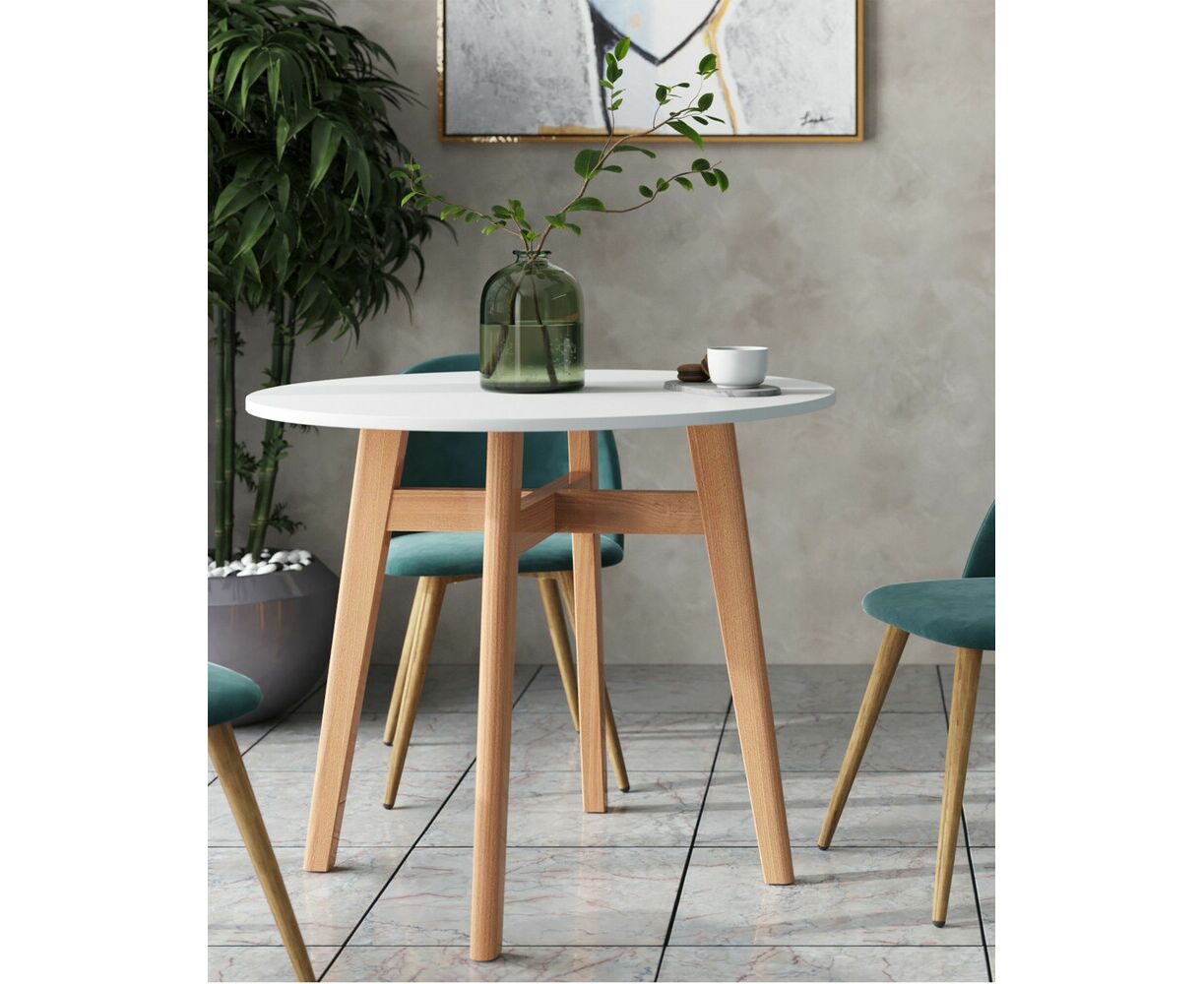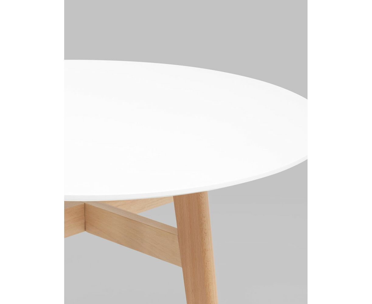 Круглая столешница выполнена из МДФ, окрашенного в белый цвет. Ножки стола изготовлены из массива дерева.