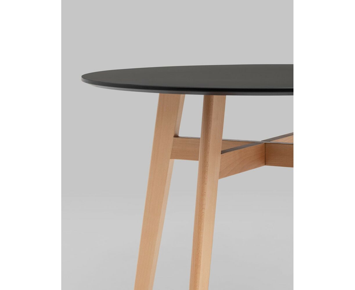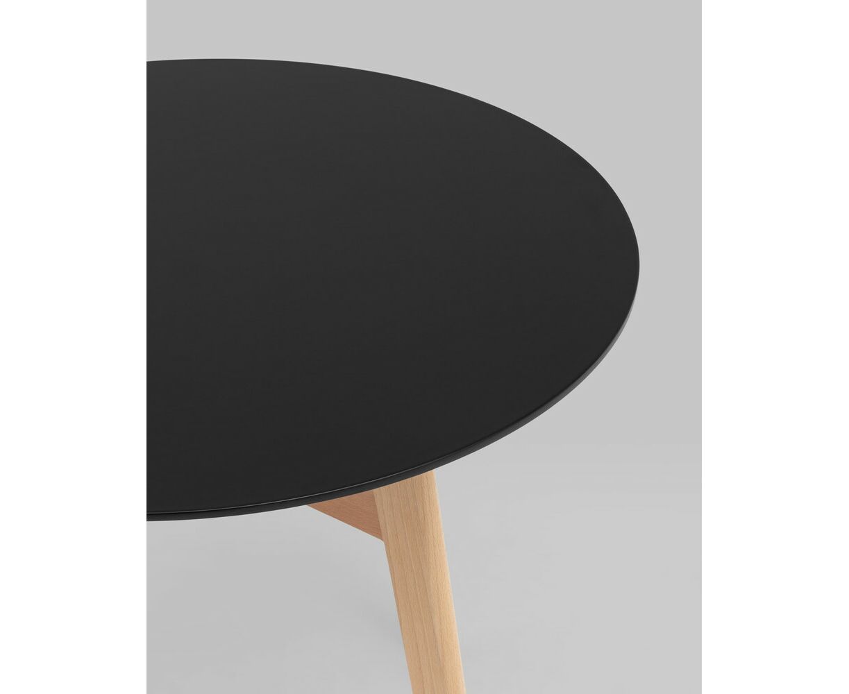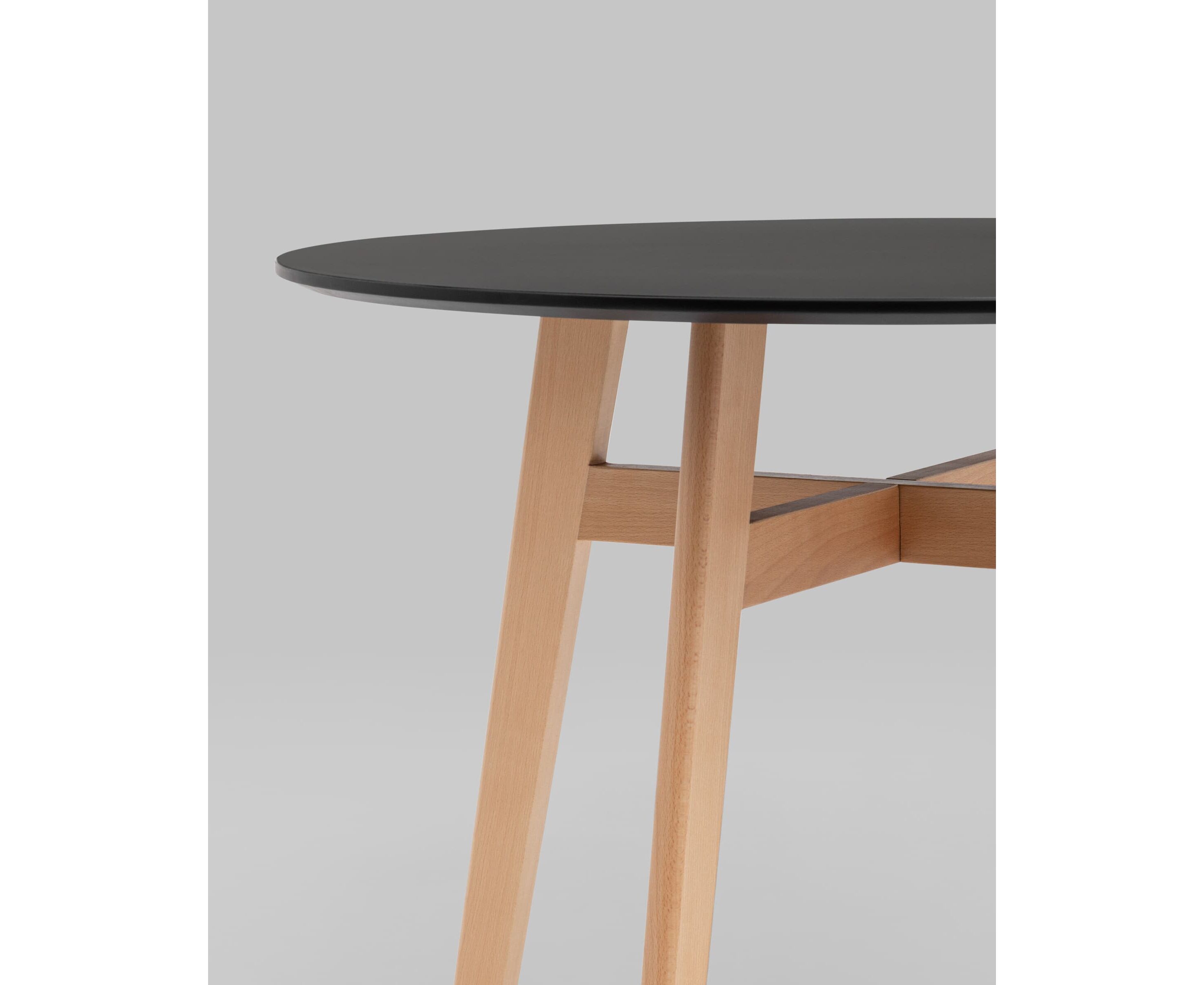 Круглая столешница выполнена из МДФ, окрашенного в черный цвет. Ножки стола изготовлены из массива дерева.