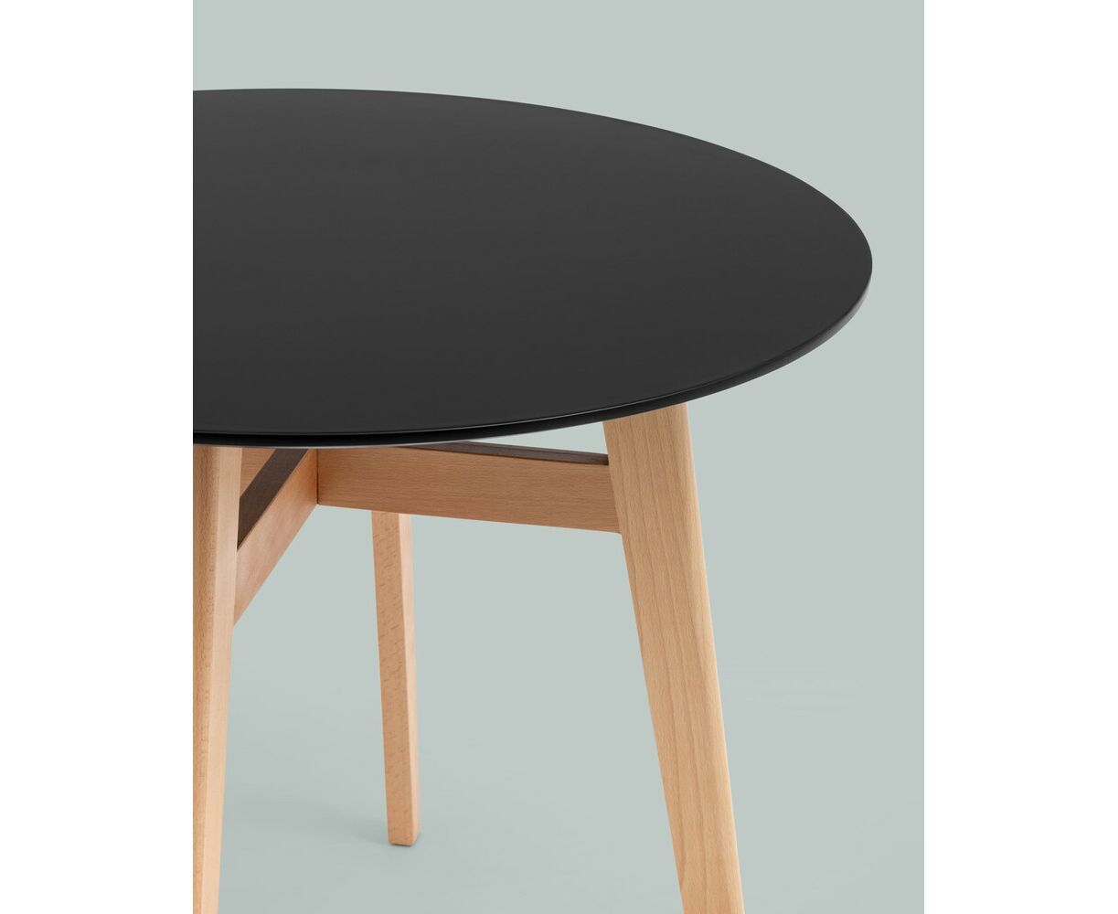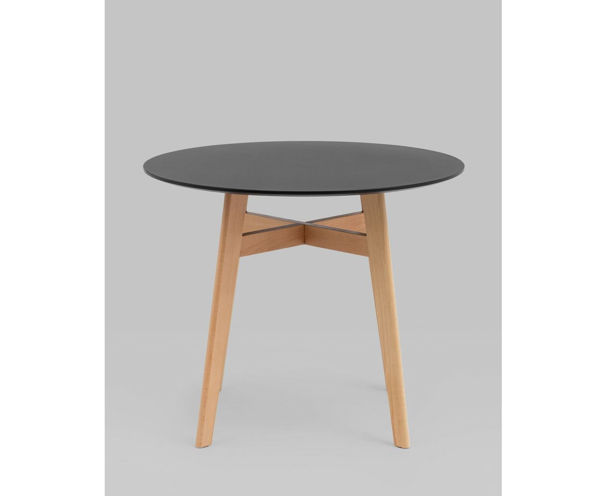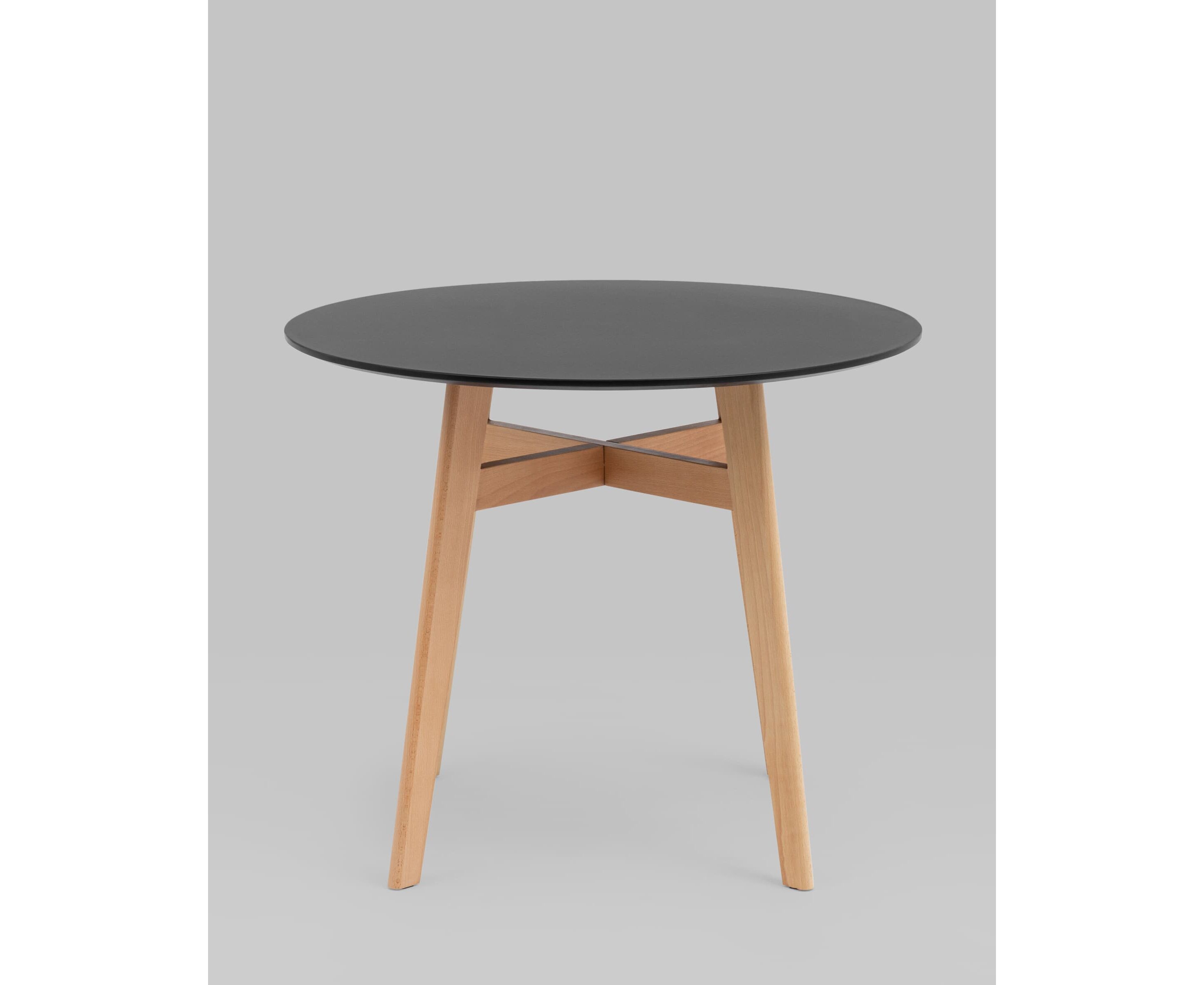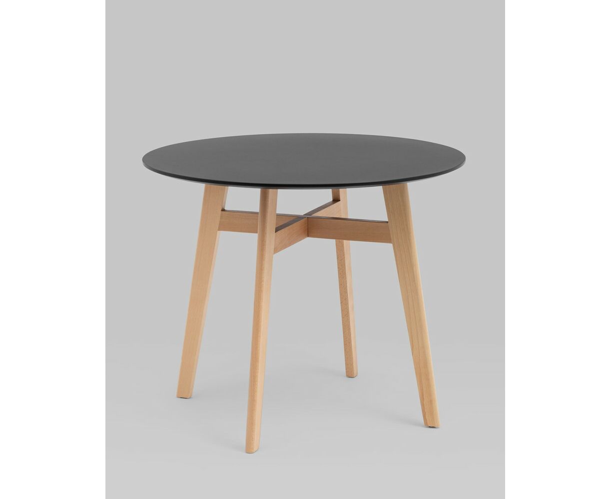 Круглая столешница выполнена из МДФ, окрашенного в черный цвет. Ножки стола изготовлены из массива дерева.