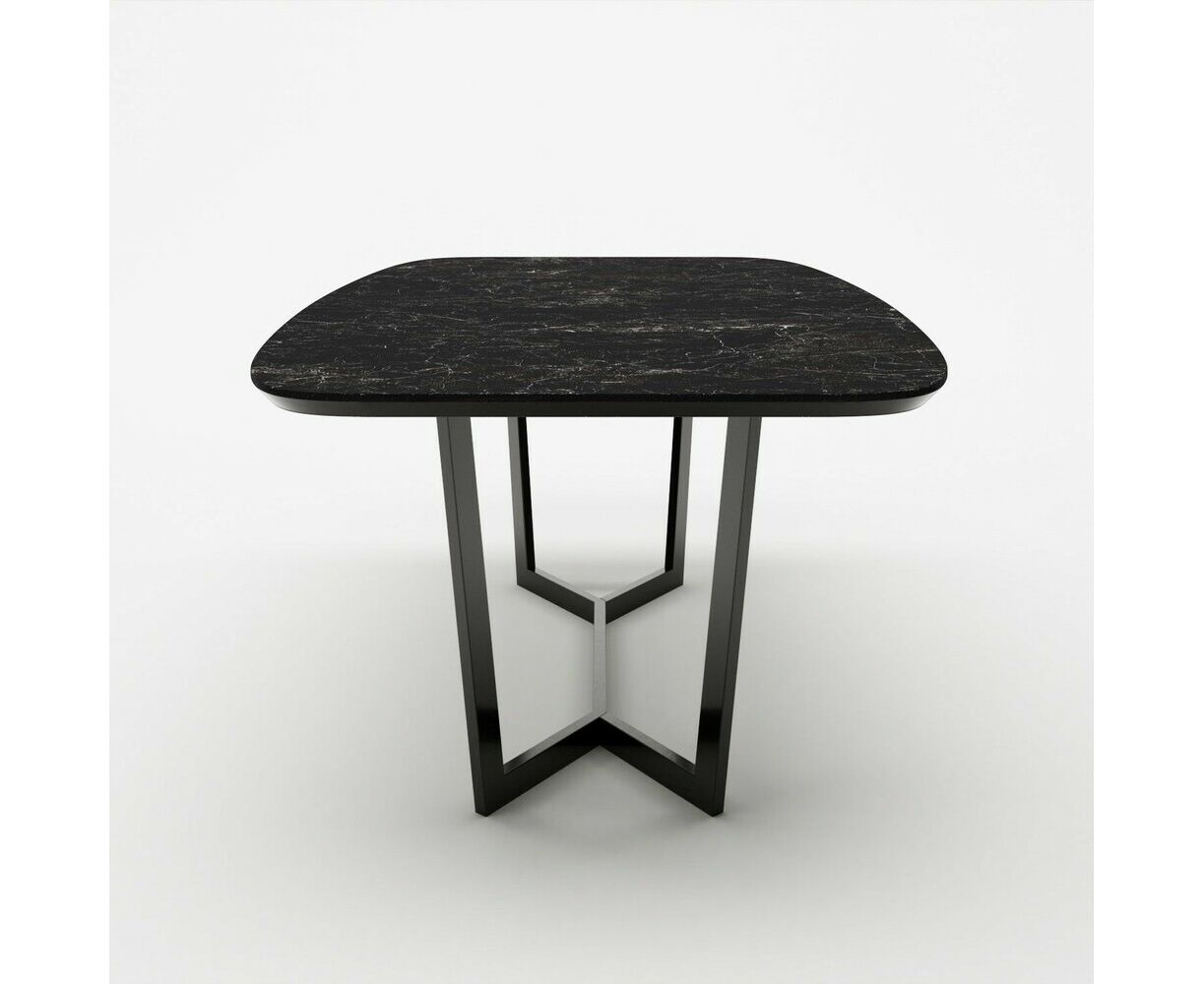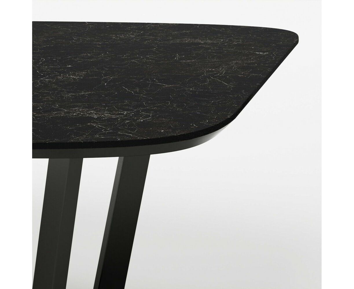 Керамическое покрытие стола не боится влаги, устойчиво к перепадам температур, на нем можно резать продукты без использования кухонной доски. Рисунок каждой столешницы уникален. Черный вариант имеет светлые вкрапления и линии. В хаотичных узорах можно найти разнообразные формы, либо воспринимать их как абстракции. За данным столом легко поместится 6 человек.
