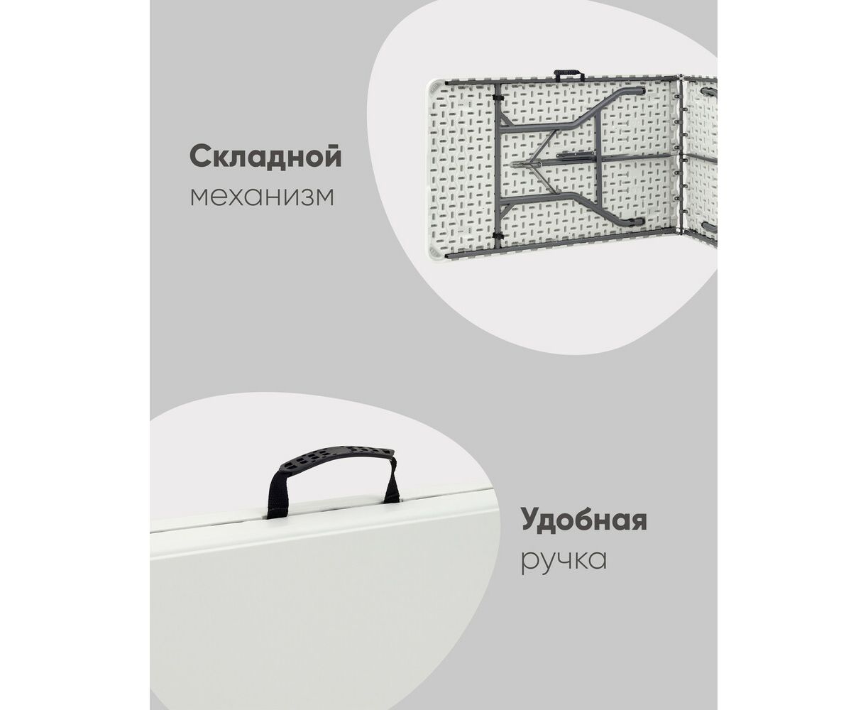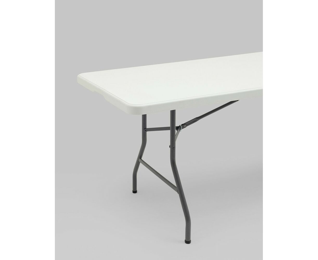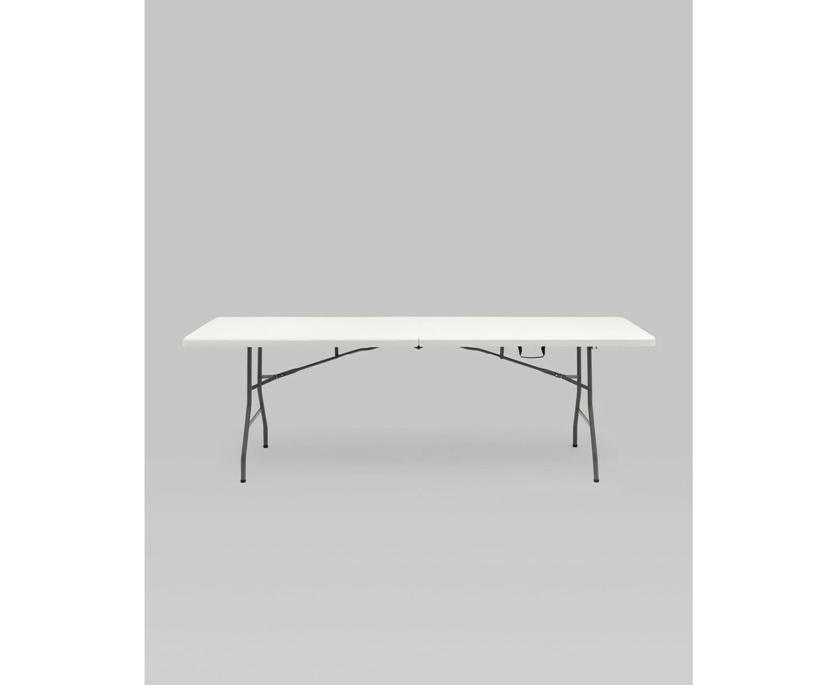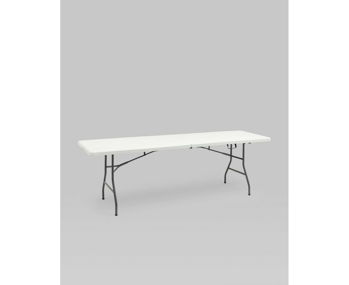 Экземпляр в коллекции эргономичной и комфортной мебели – складной пластиковый стол-книжка 240 см. В сложенном виде модель занимает минимум места, а при необходимости ее можно перевезти в багажнике легкового автомобиля. В собранном состоянии стол обладает внушительными размерами: при длине столешницы в 240 сантиметров за ним с легкостью разместятся как минимум 6 человек. Мебель с такими параметрами рекомендована для крупных выездных мероприятий – в том числе и для тех, где предусмотрен фуршет.