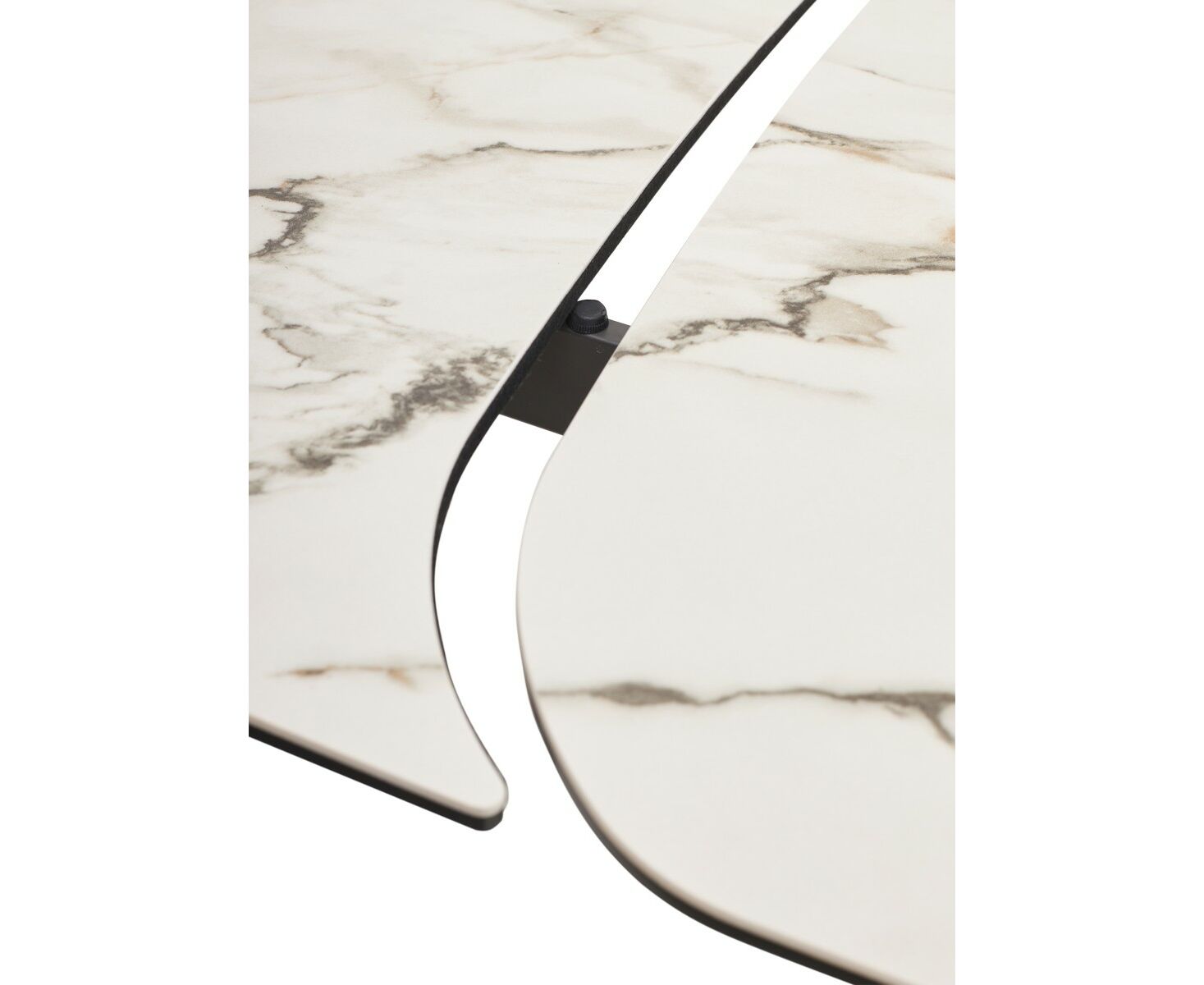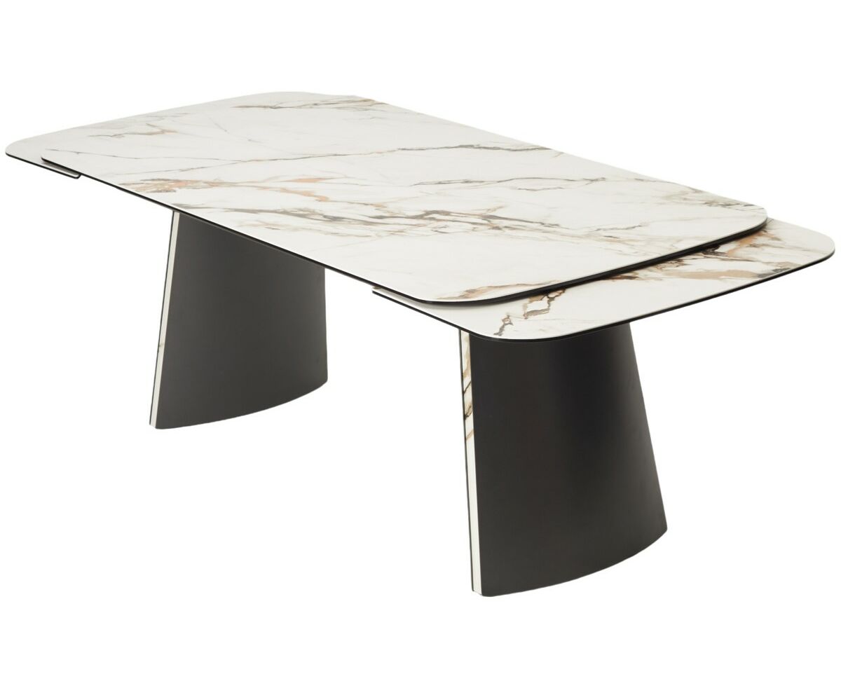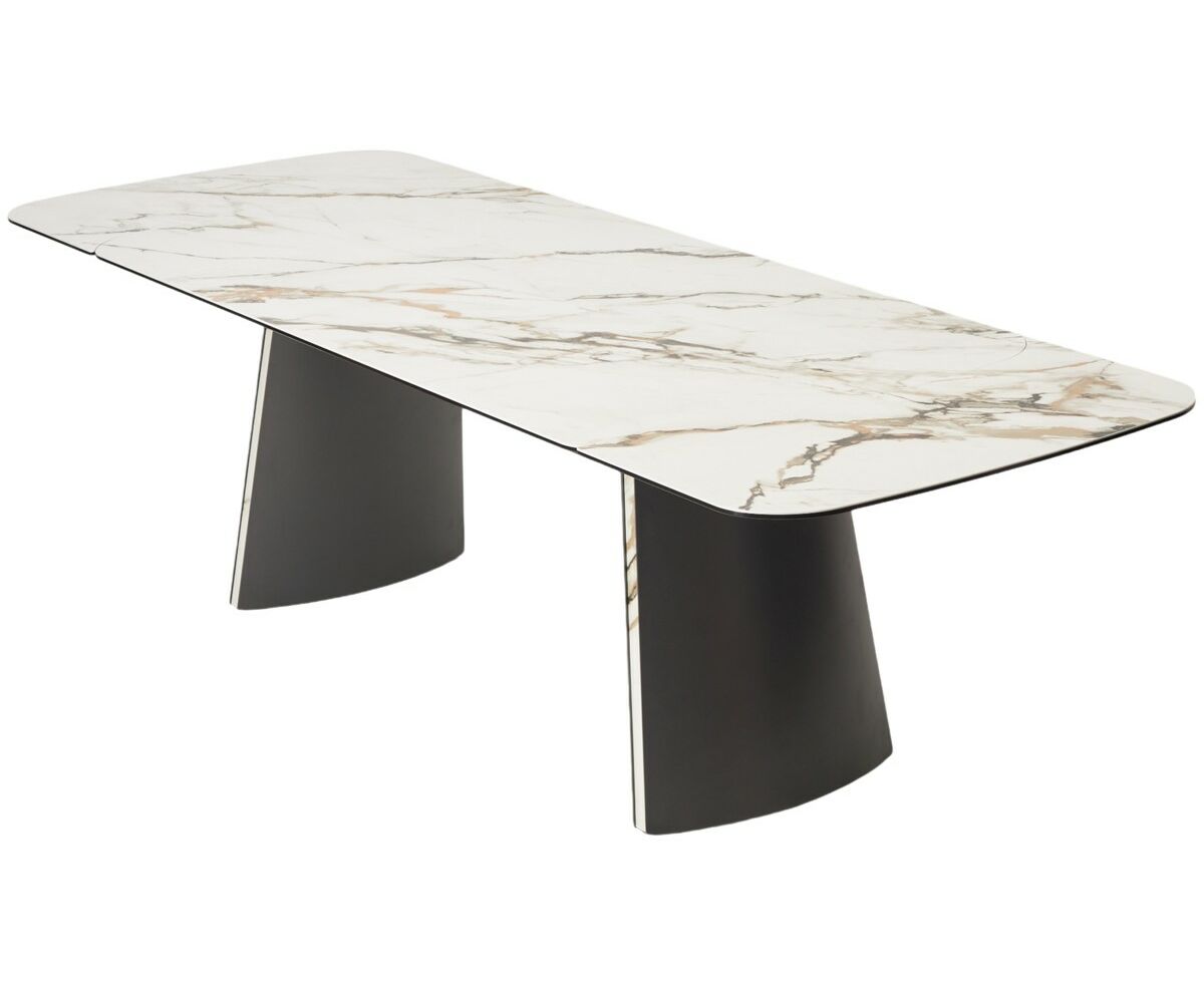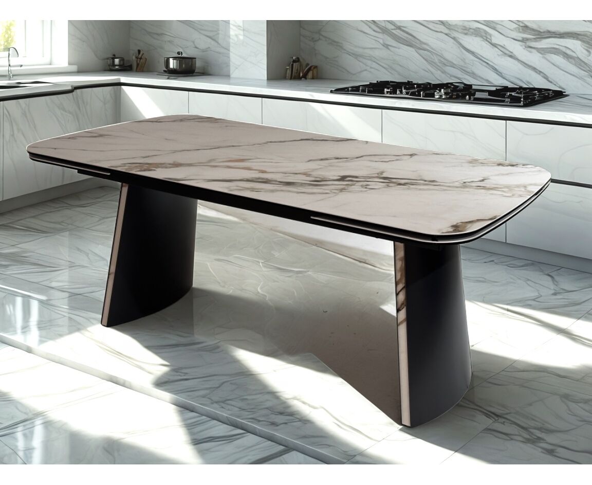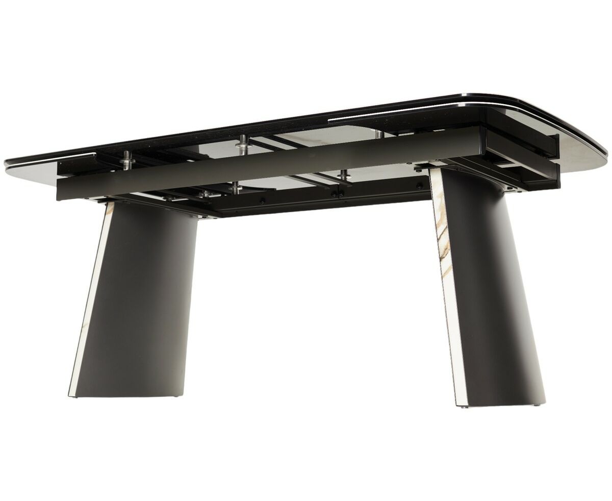 - двухсторонняя торцевая система раскладывания, две независимые вставки по краям по 40 см позволяют увеличить длину столешницы на 220 или 260 см при необходимости, итальянская керамика, толщина столешницы 11 мм (3 мм керамика + 8 мм закаленное стекло), не впитывает загрязнения, термостойкая;