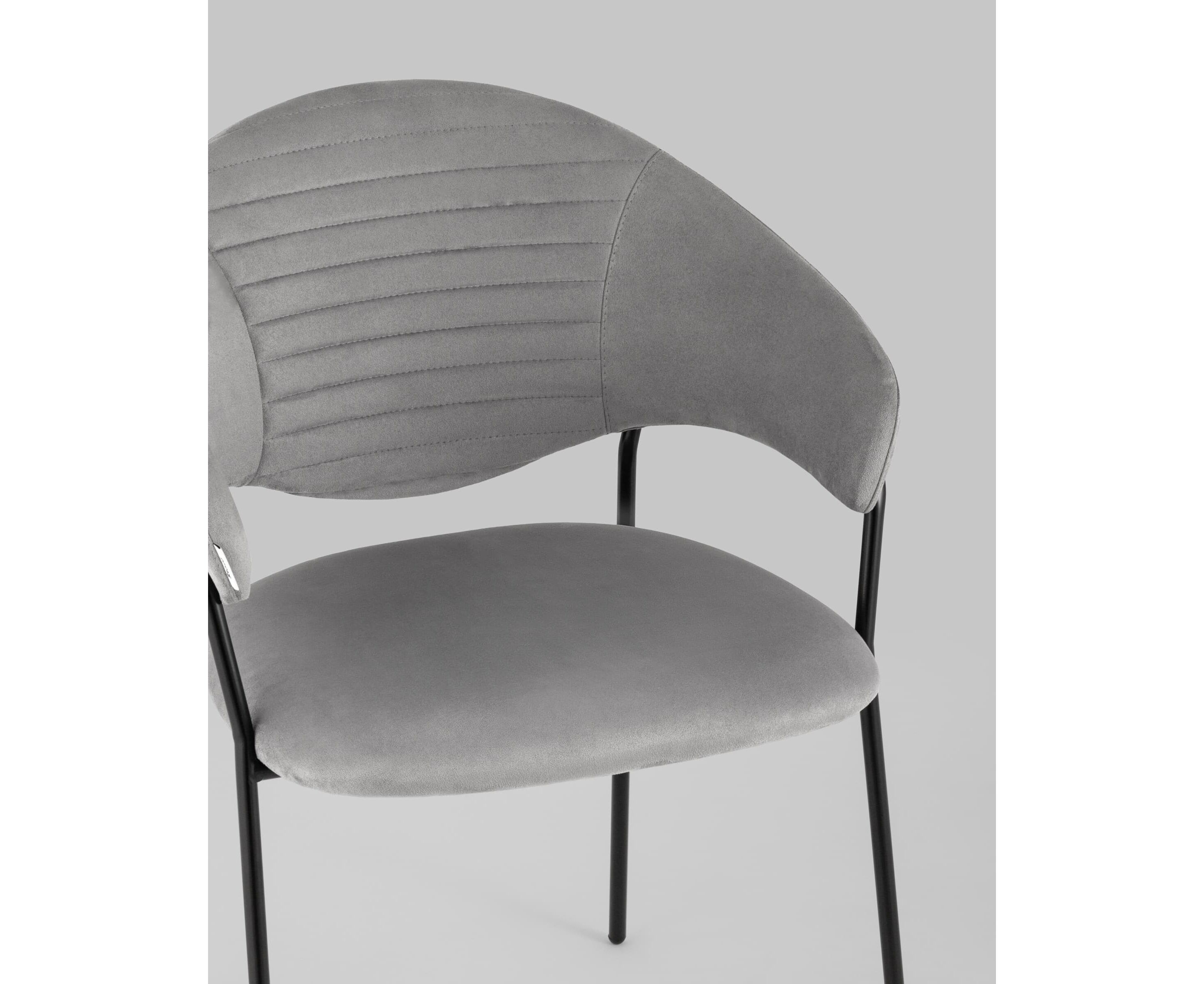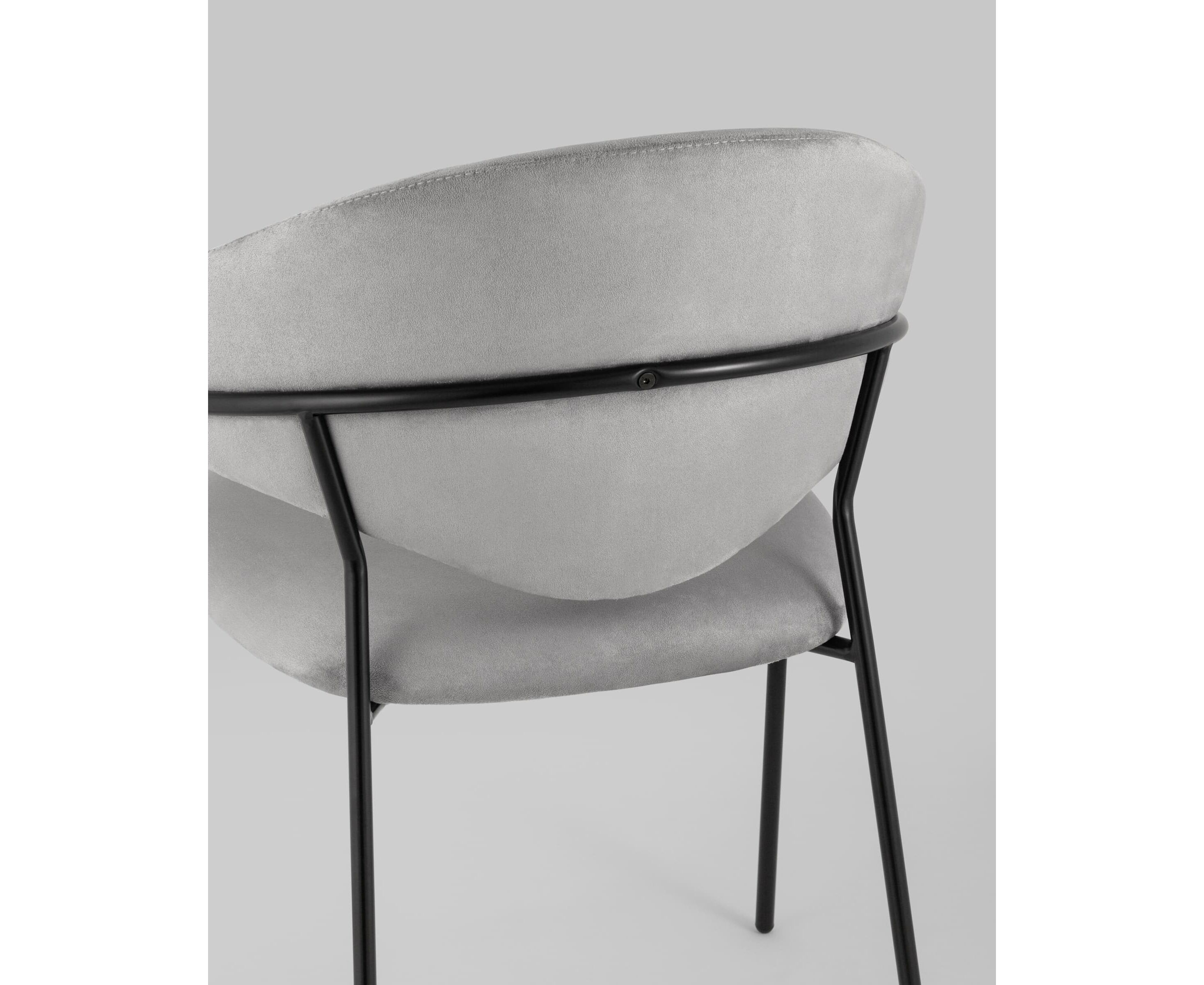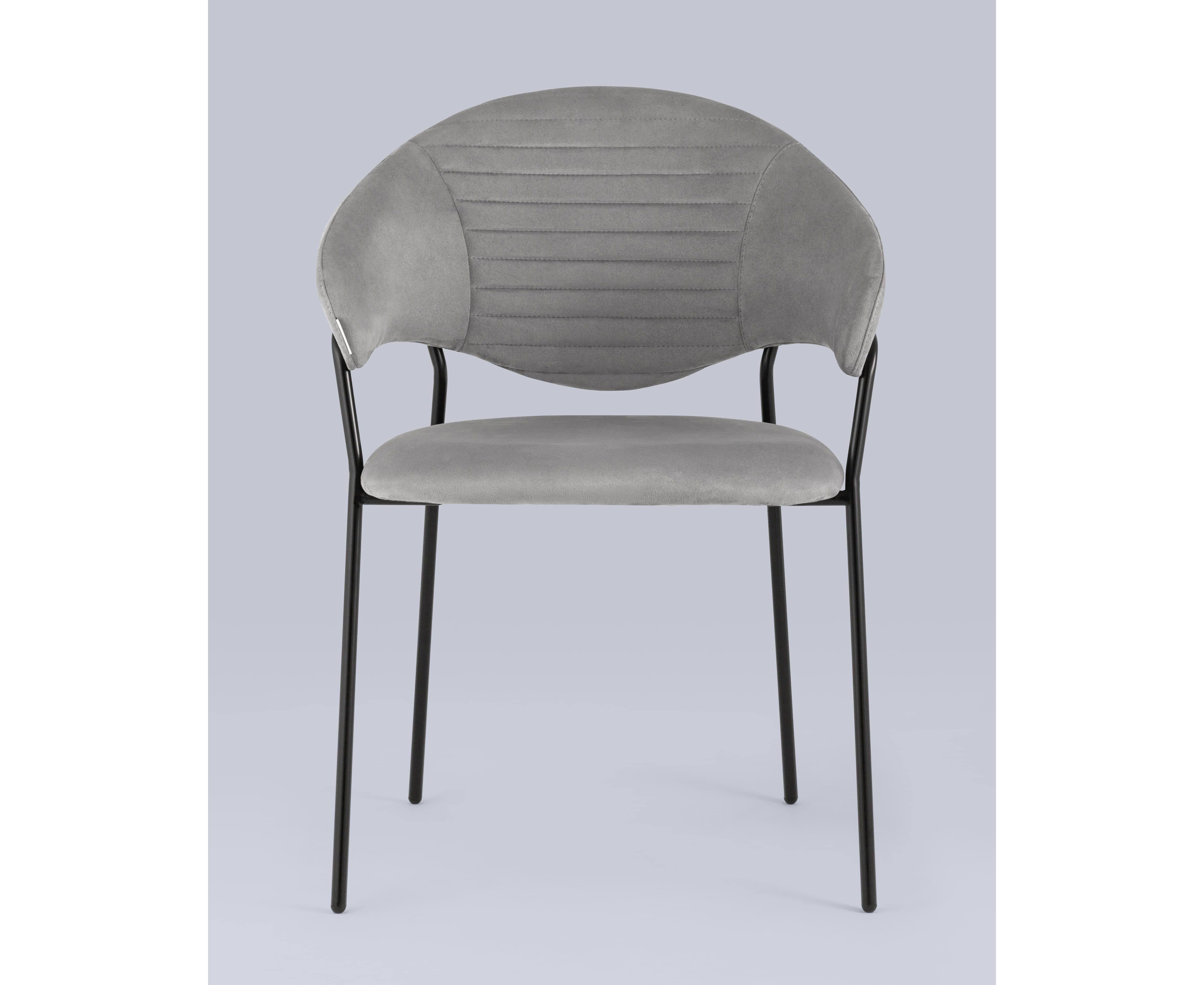 Стильный кухонный стул с оригинальной формой спинки, высокой поддержкой и подлокотниками. В качестве обивки используется искусственная замша – приятный на ощупь износостойкий, долговечный материал, обладает эффектом "антикоготь". Металлический каркас в черном цвете огибает спинку и выступает аккуратным акцентом модели. Широкое сиденье обеспечивает удобную посадку и уют.