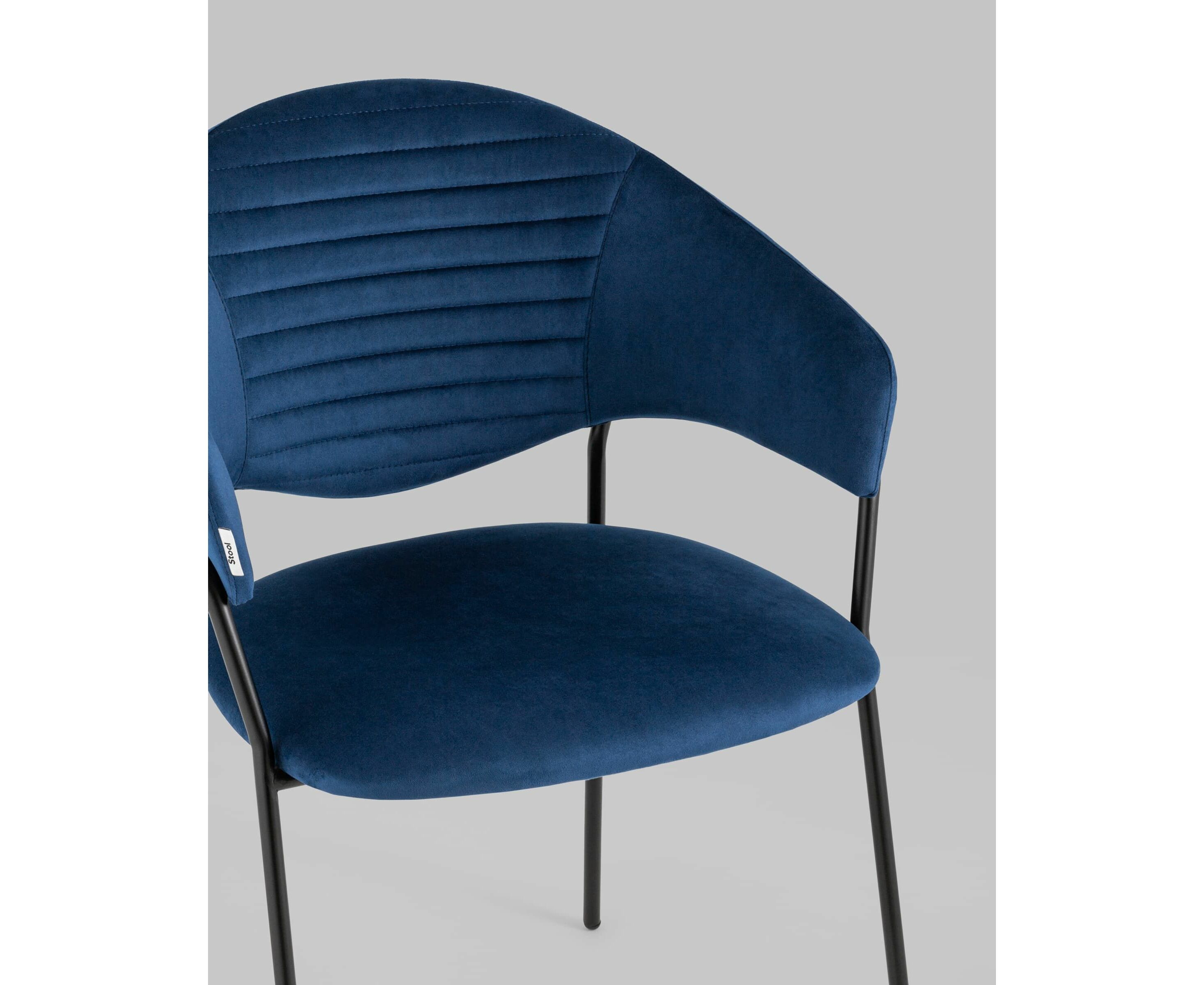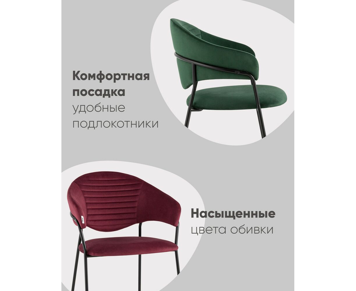 Стильный кухонный стул с оригинальной формой спинки, высокой поддержкой и подлокотниками. В качестве обивки используется мягкий велюр – приятный на ощупь износостойкий, гигроскопичный материал. Металлический каркас в черном цвете огибает спинку и выступает аккуратным акцентом модели. Широкое сиденье обеспечивает удобную посадку и уют.