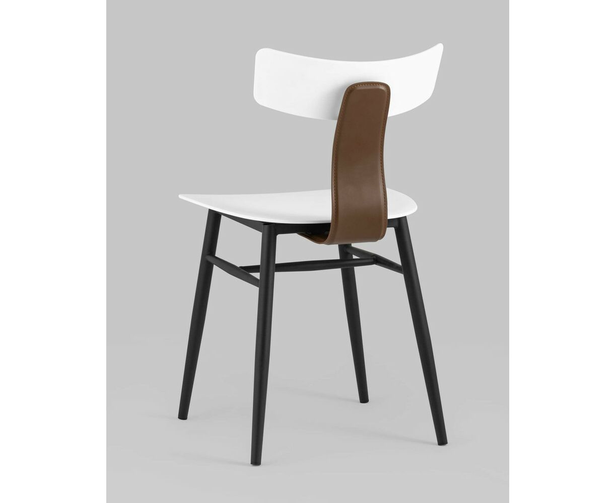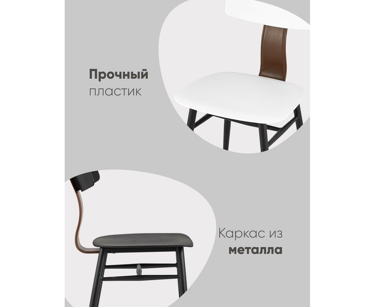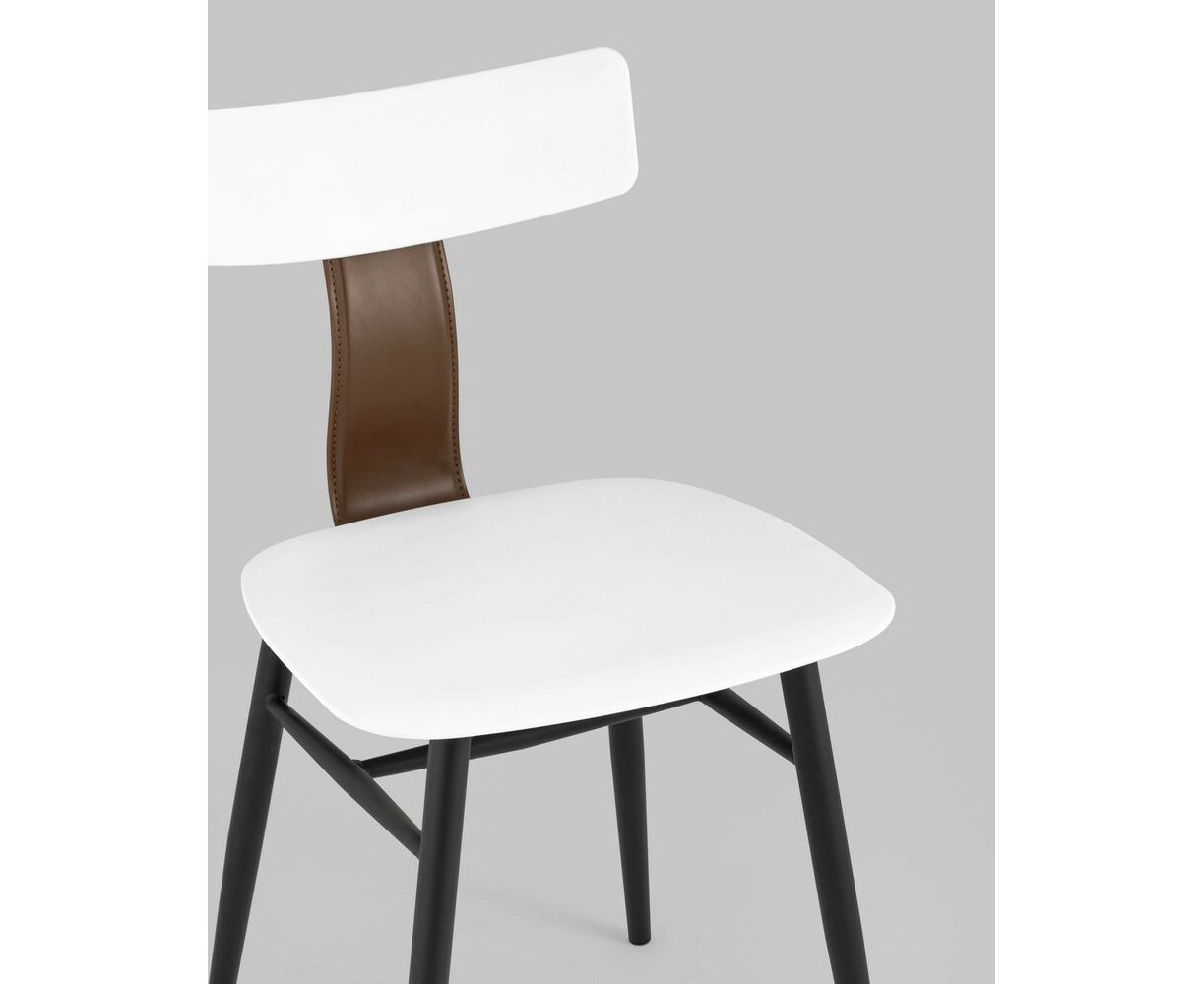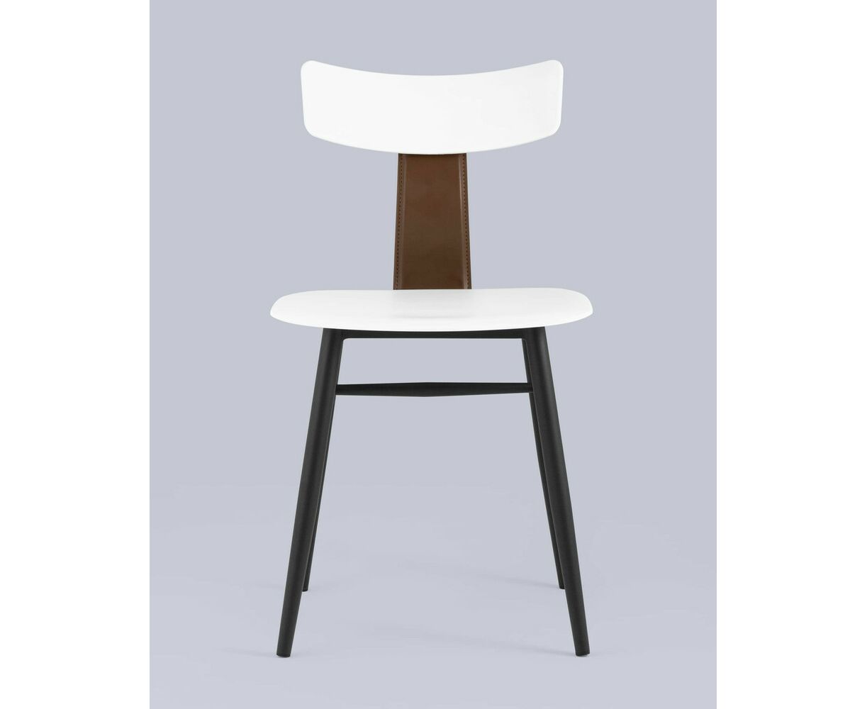 Сиденье стула выполнено из пластика, спинка декорирована цветным элементом из экокожи. Ножки металлические.