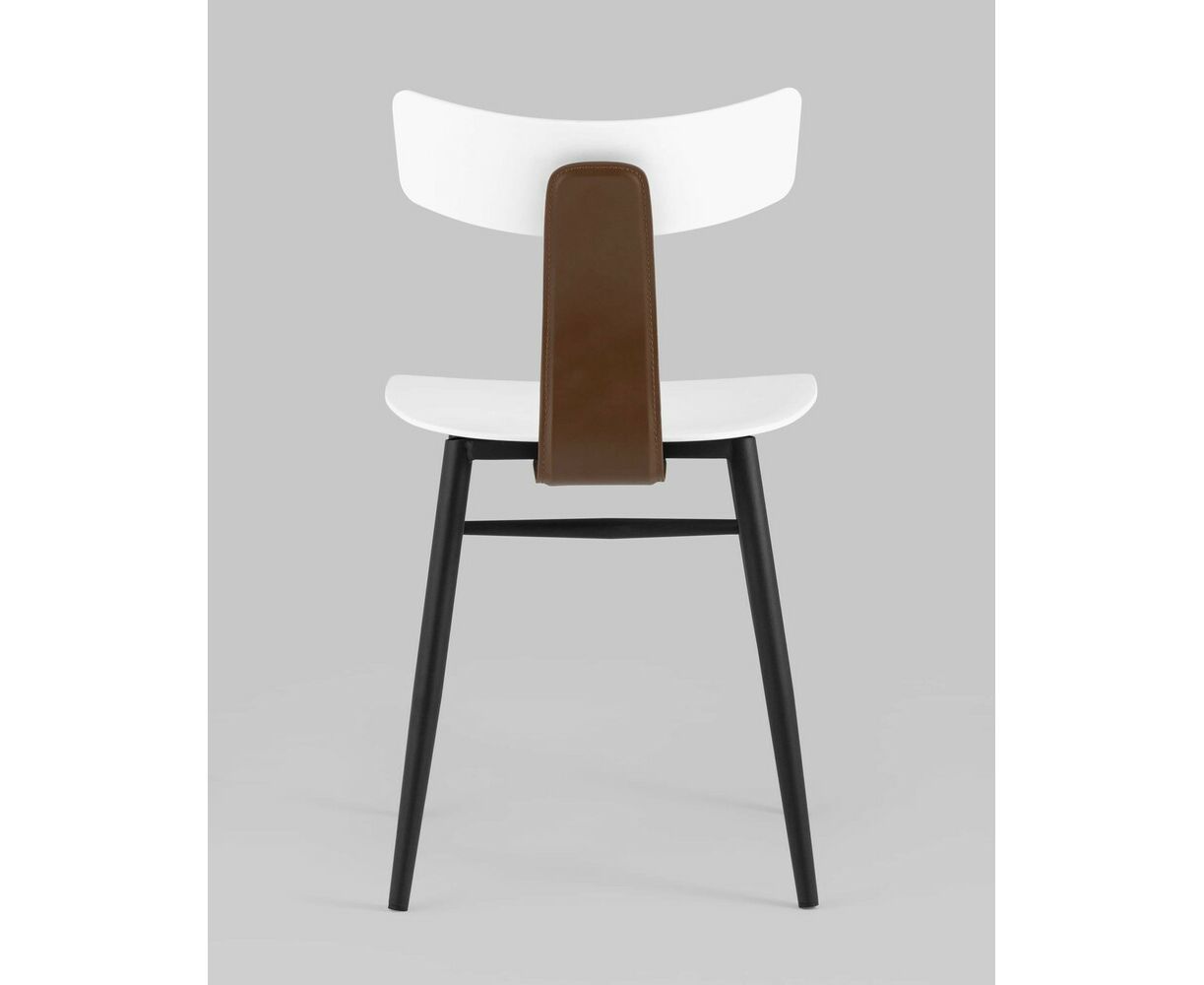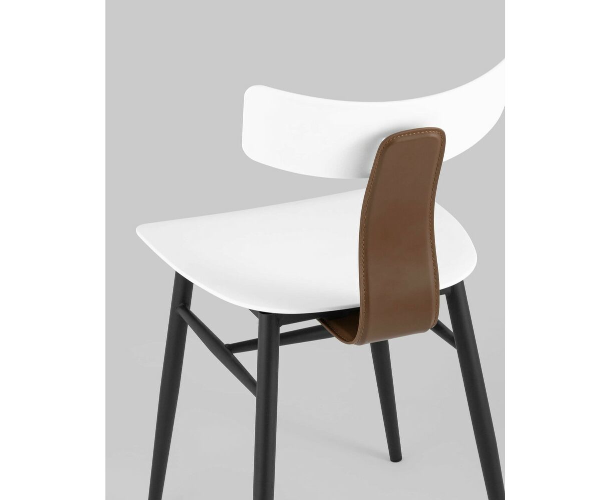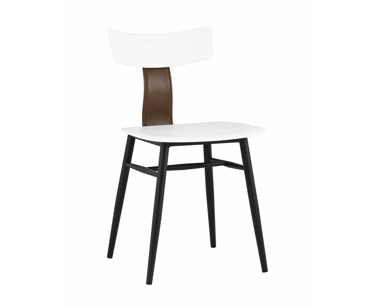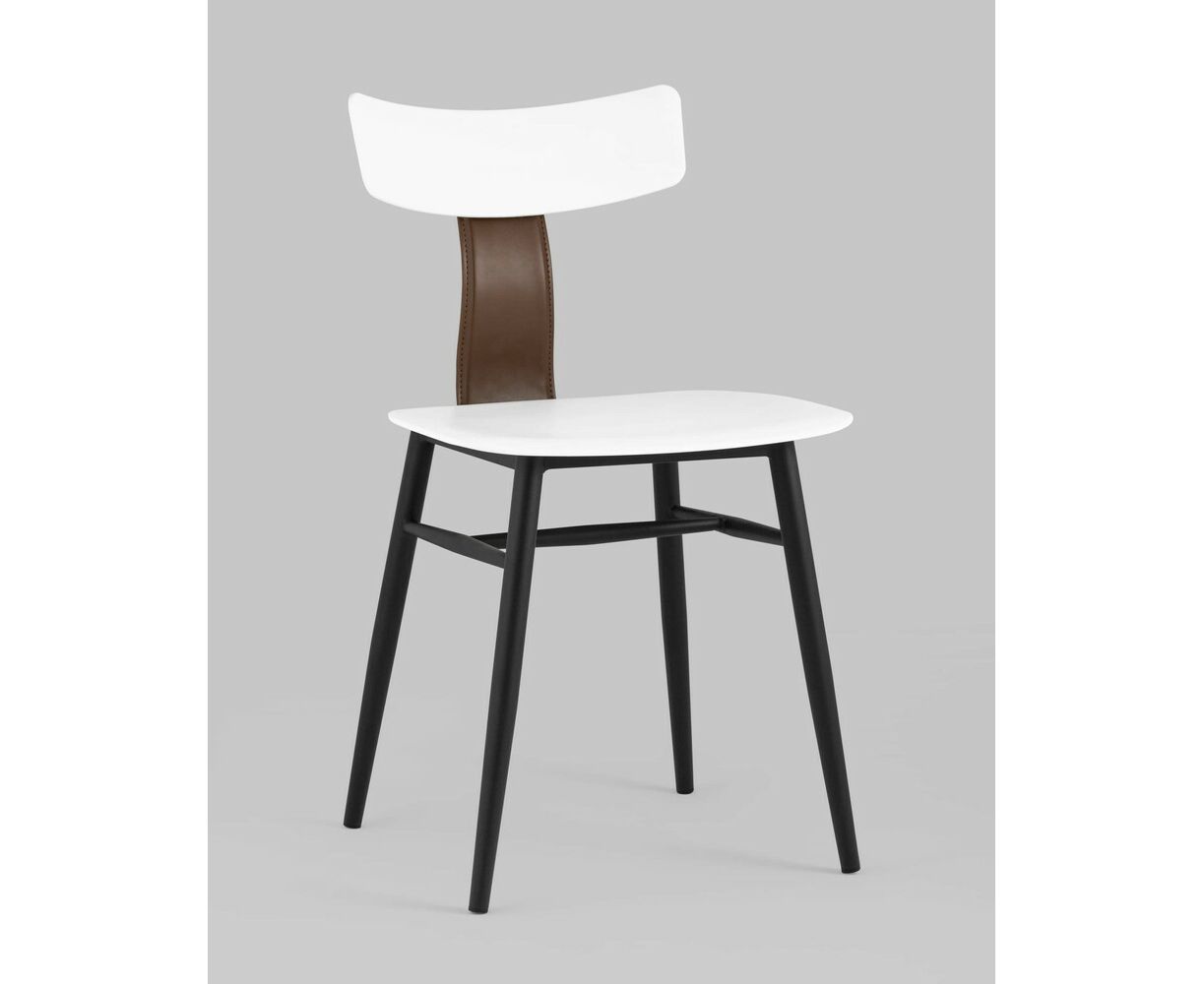 Сиденье стула выполнено из пластика, спинка декорирована цветным элементом из экокожи. Ножки металлические.