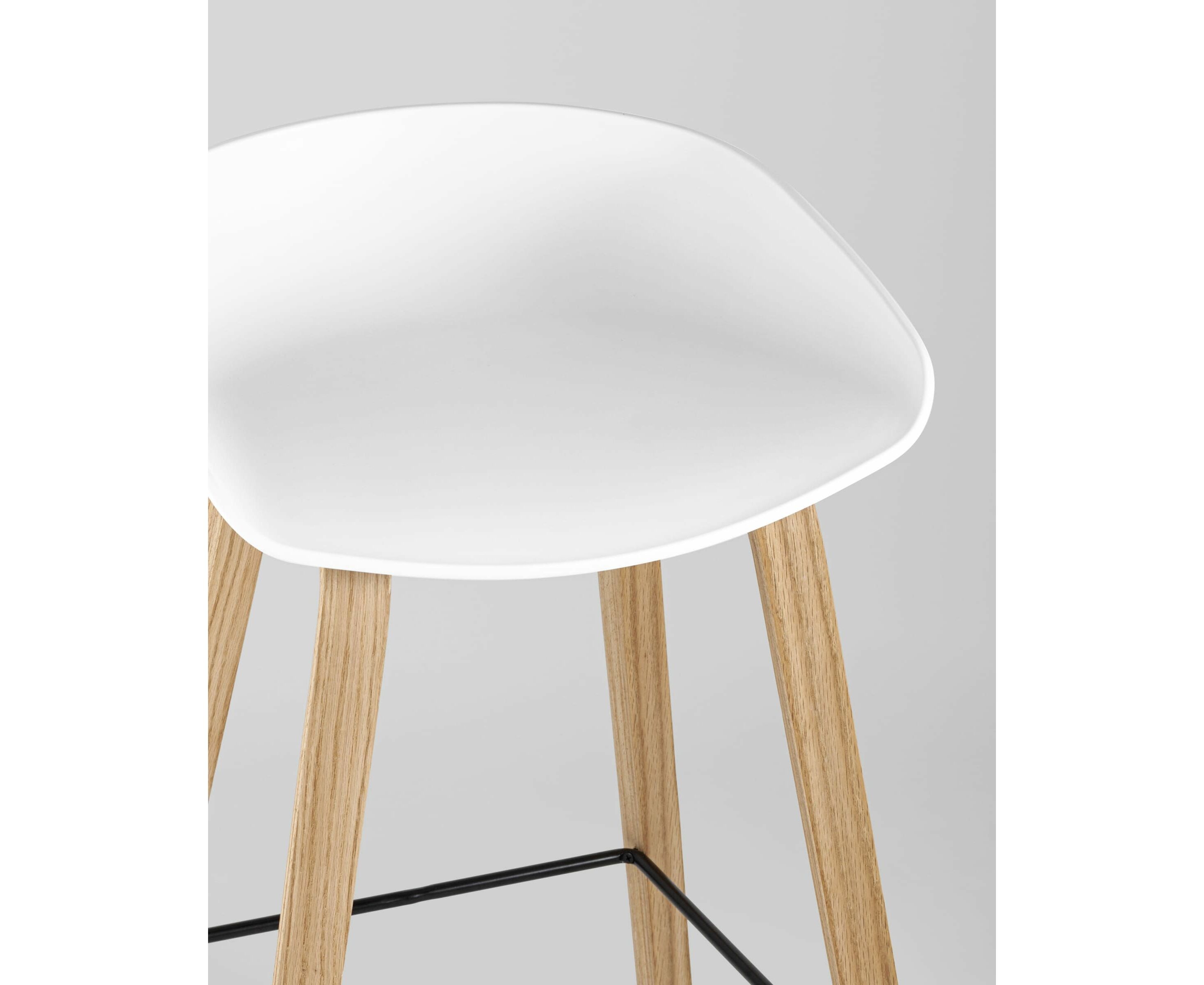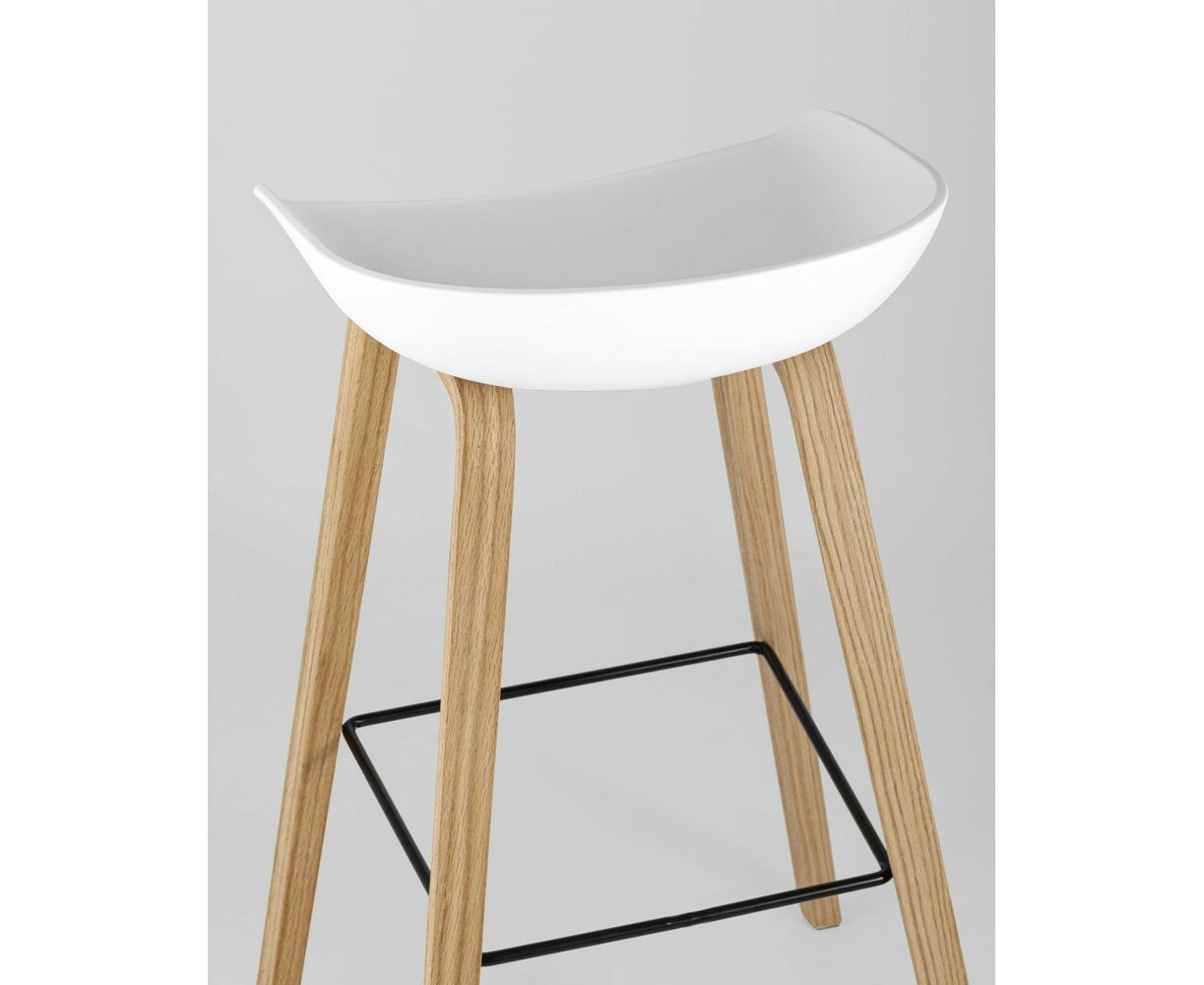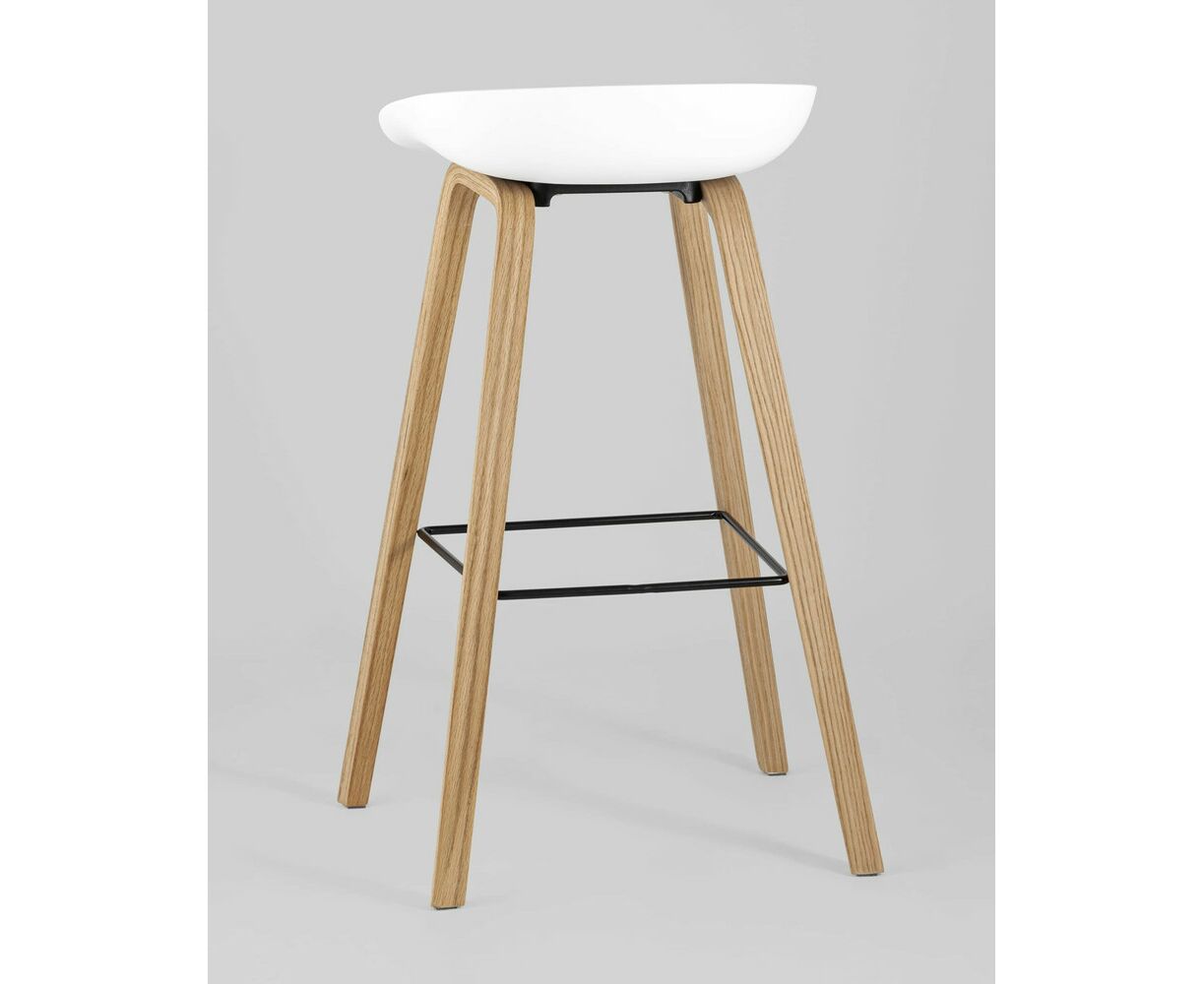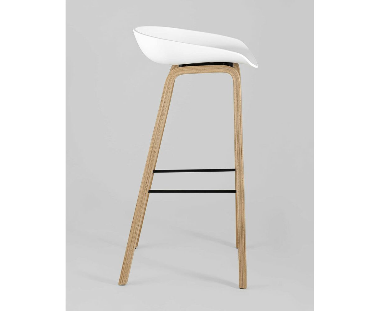 В дизайне модели «Либра» используется сочетание белого пластика и естественного оттенка натурального дерева – опоясывающая ножки опорная планка в тон сиденью уравновешивает цветовую комбинацию и подчеркивает модные геометрические формы барного стула. Высота соответствует стойке стандартной высоты.