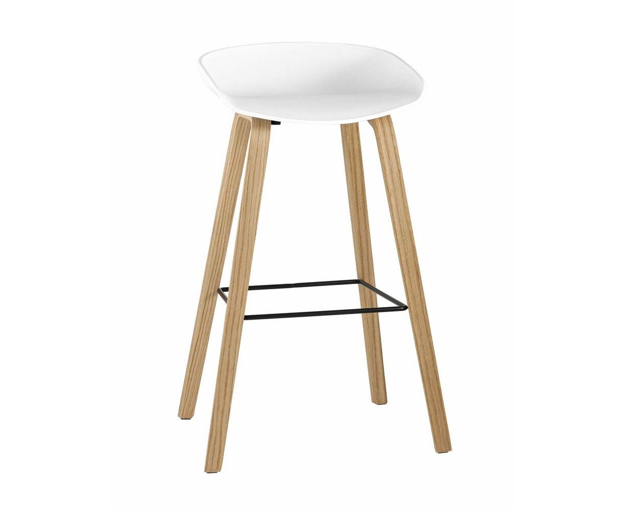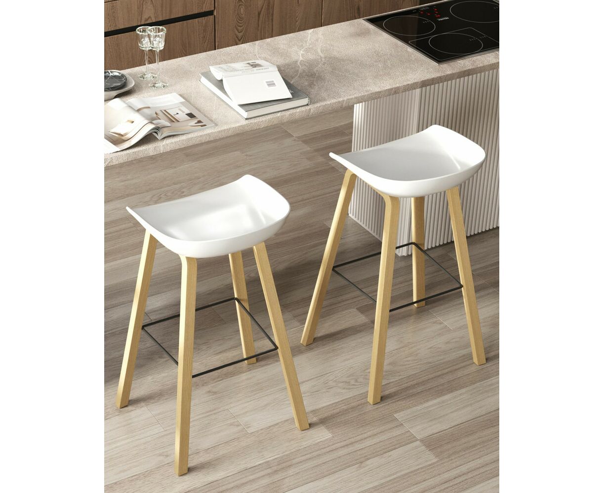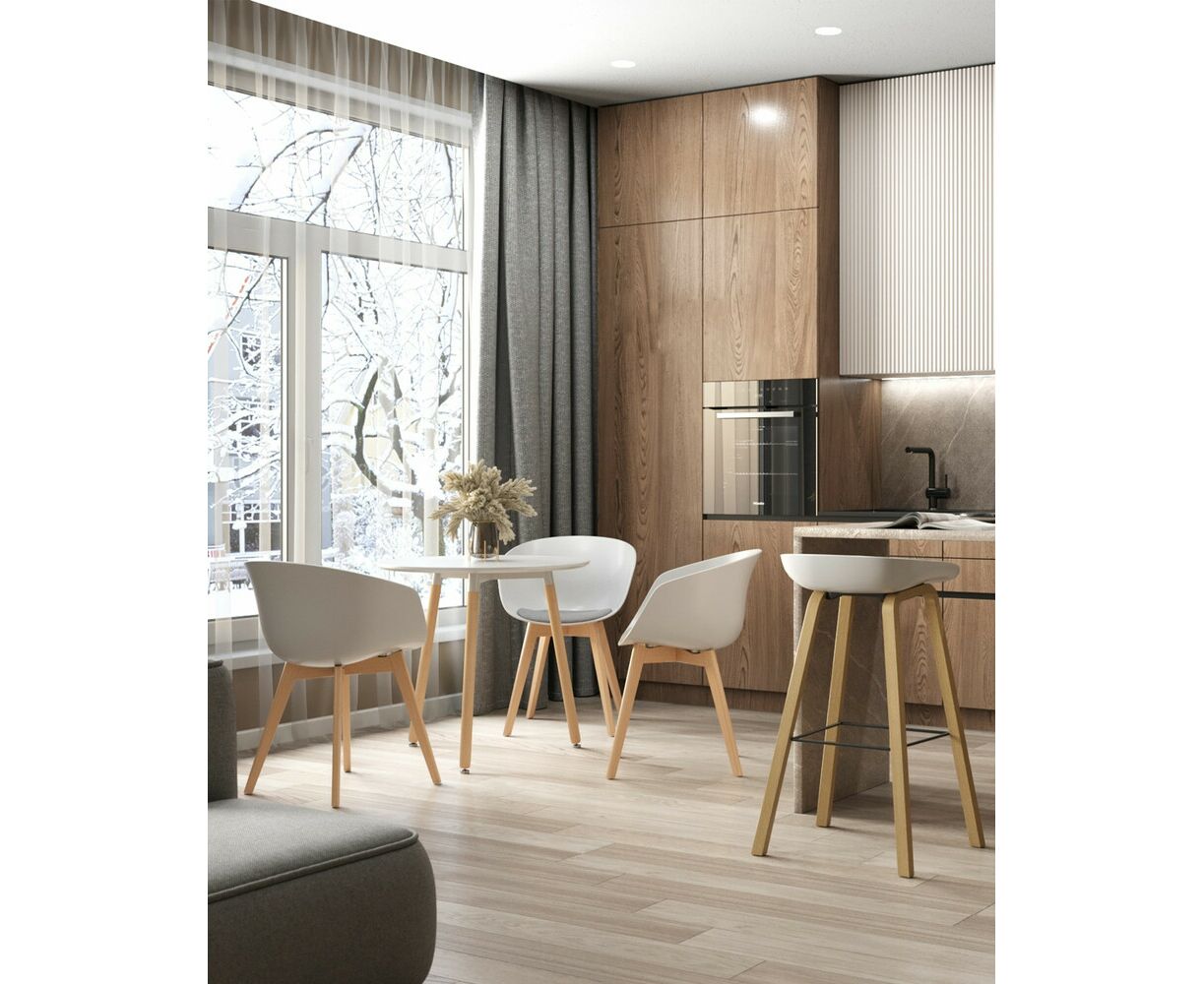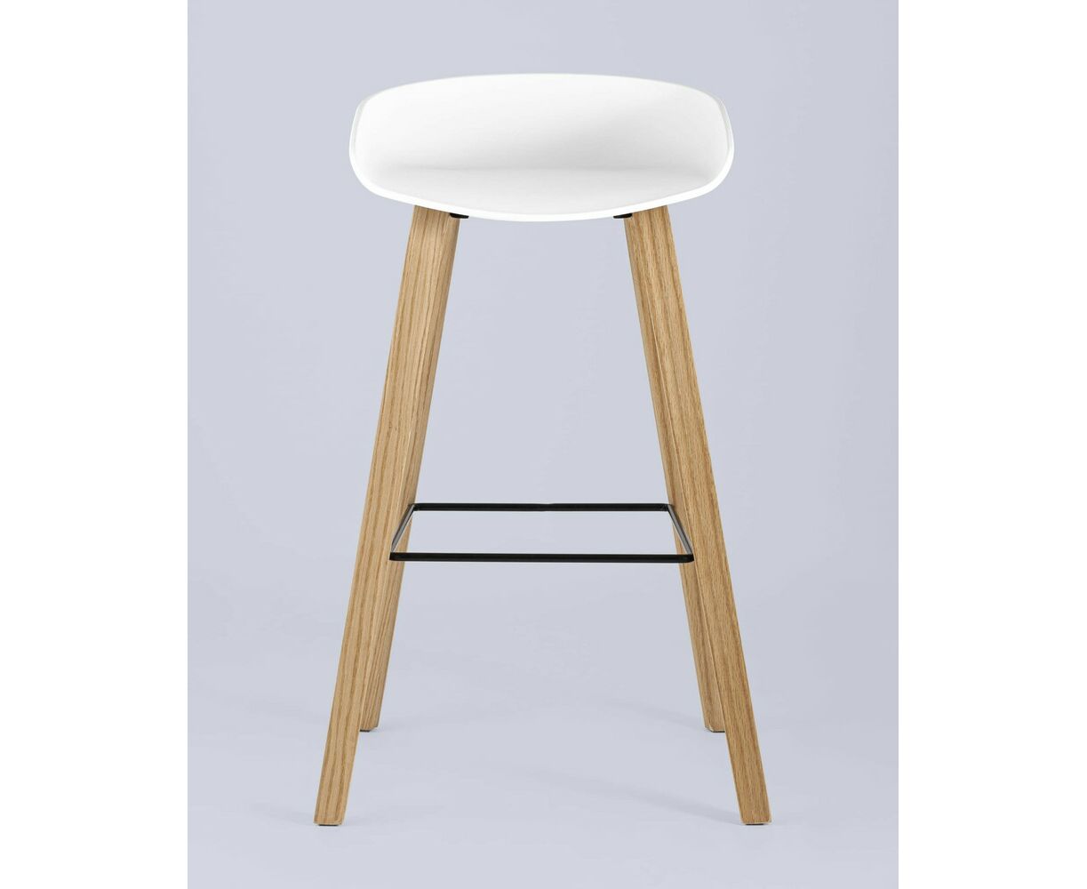 В дизайне модели «Либра» используется сочетание белого пластика и естественного оттенка натурального дерева – опоясывающая ножки опорная планка в тон сиденью уравновешивает цветовую комбинацию и подчеркивает модные геометрические формы барного стула. Высота соответствует стойке стандартной высоты.