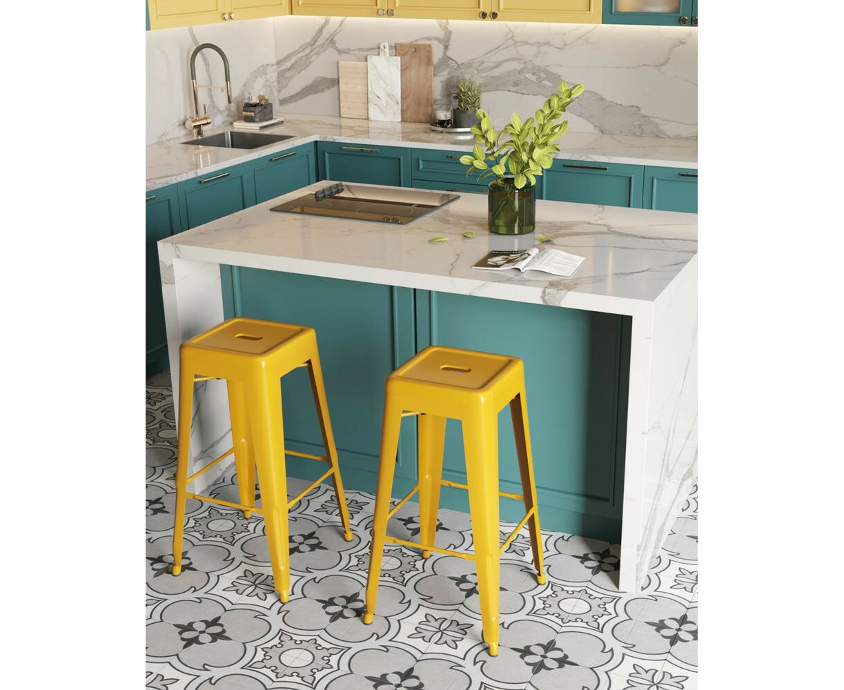 Стильный желтый табурет для бара позволит сэкономить место в помещении и организовать застолье для большой компании. Стулья легко хранить компактными штабелями.