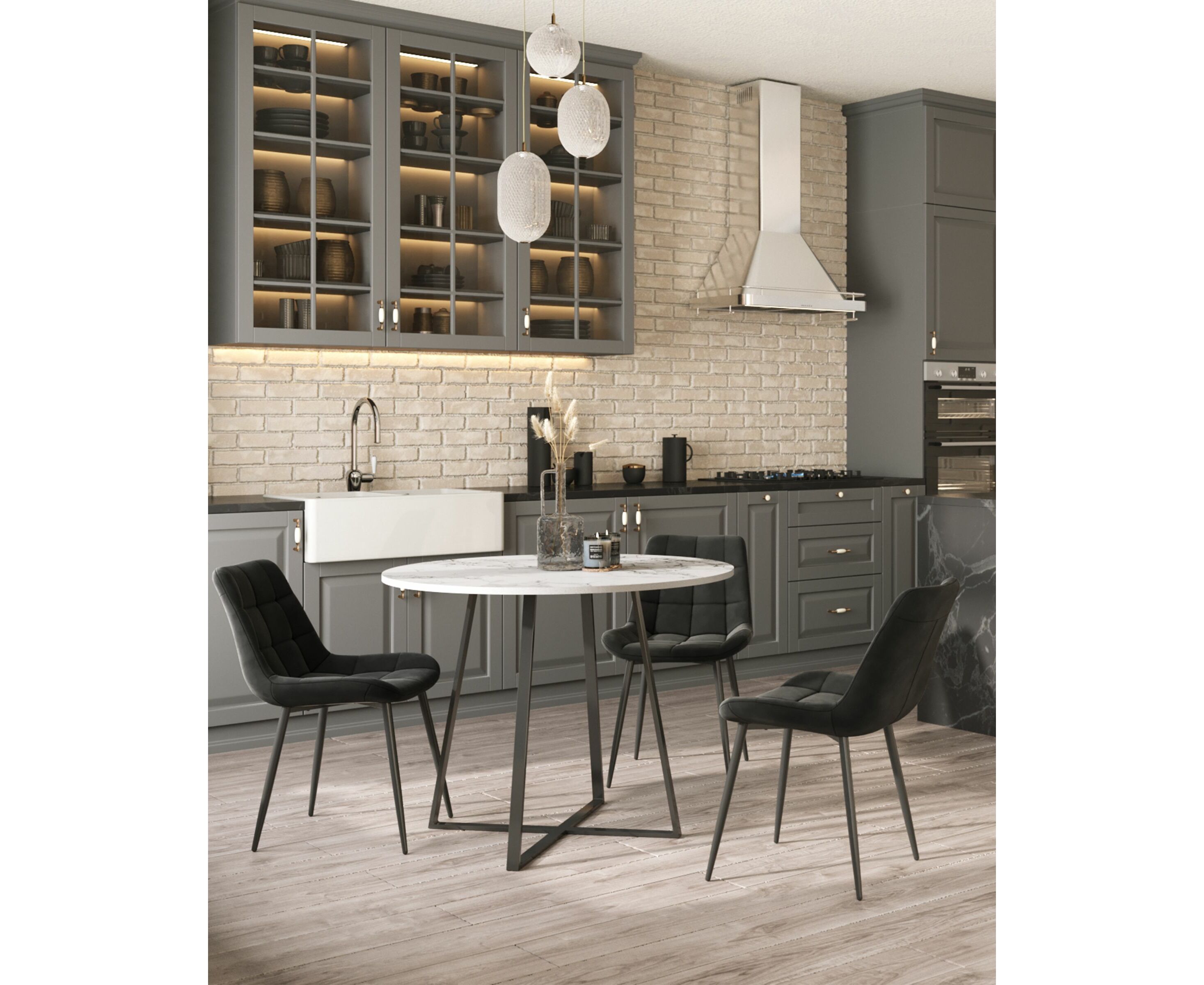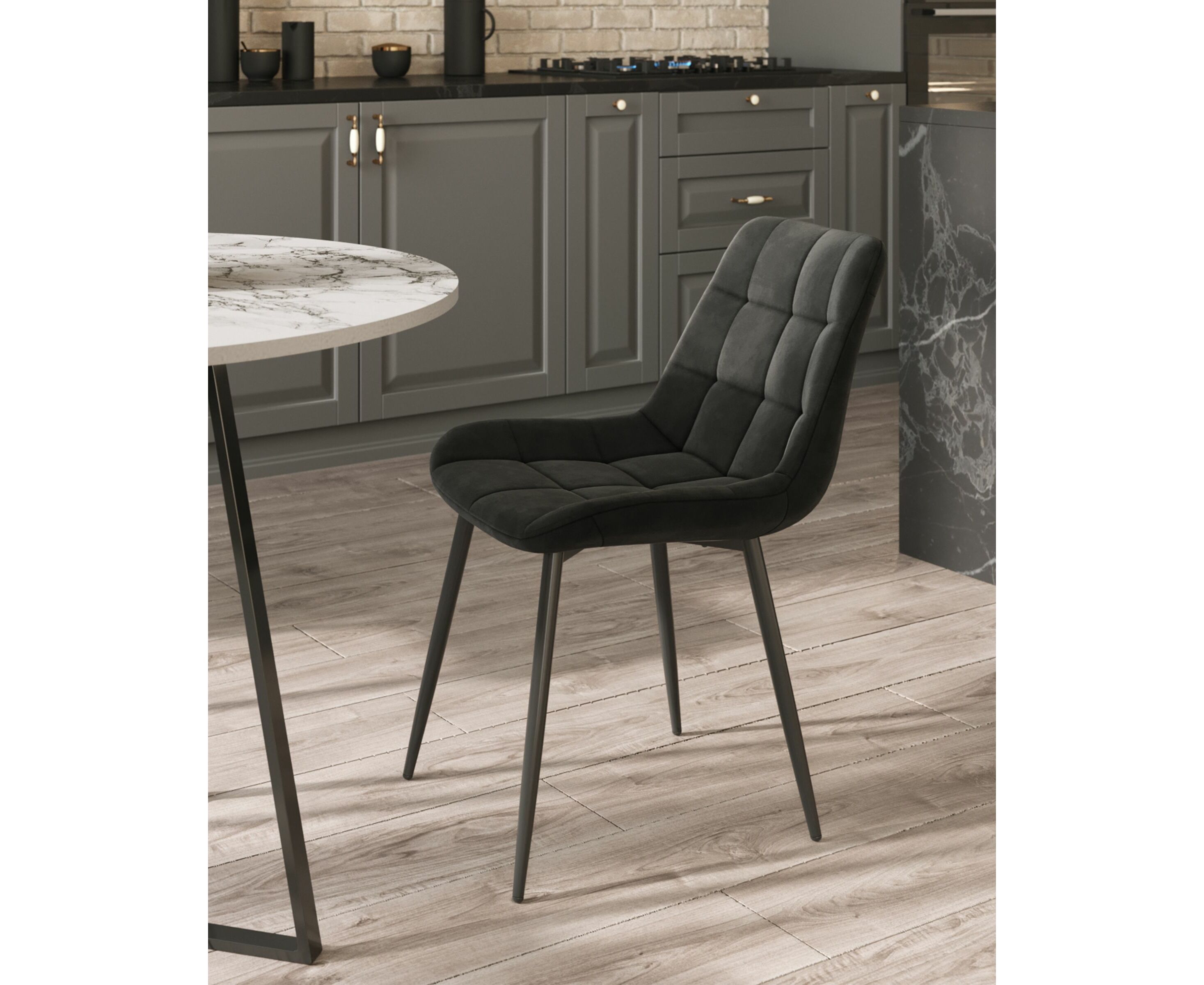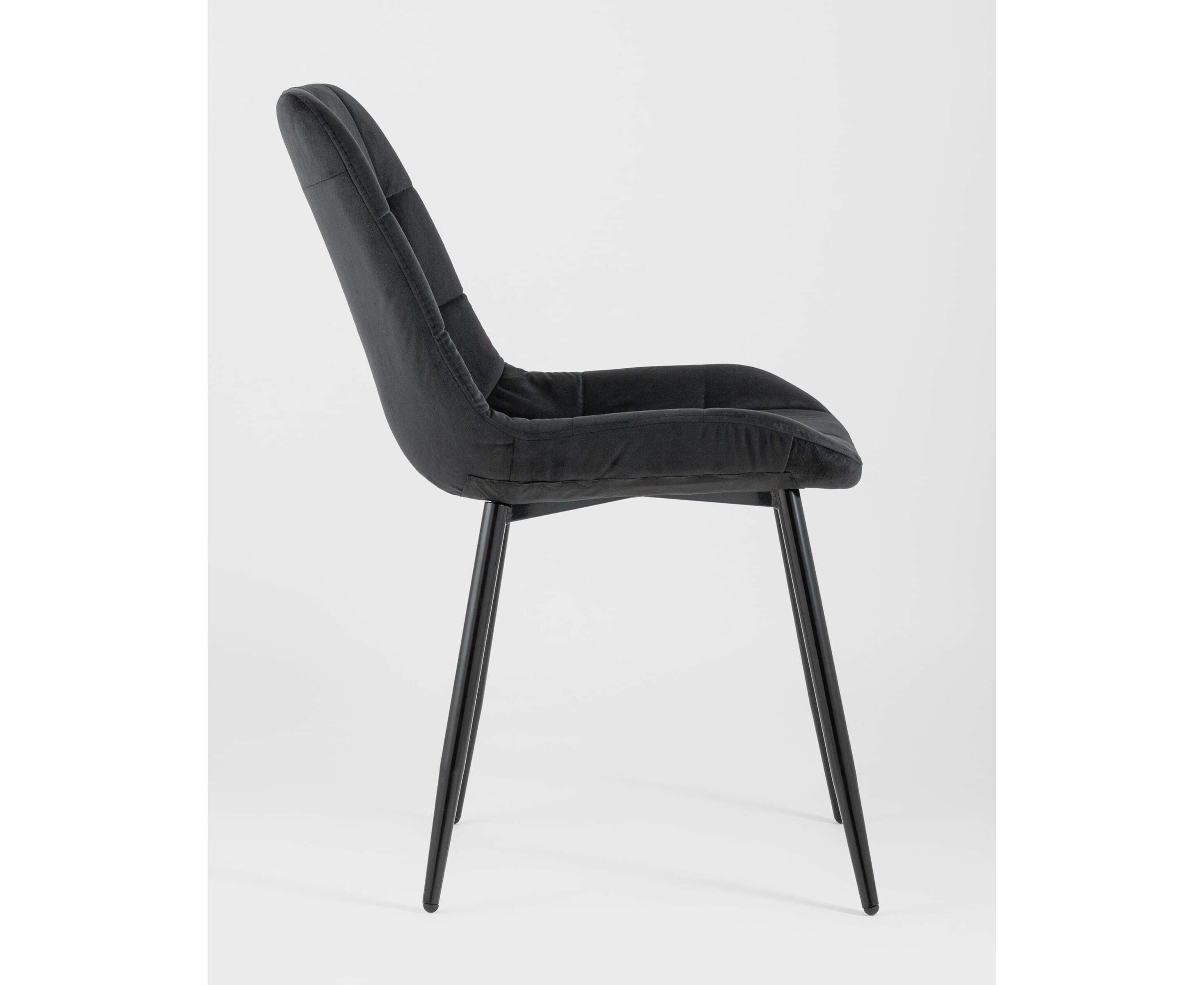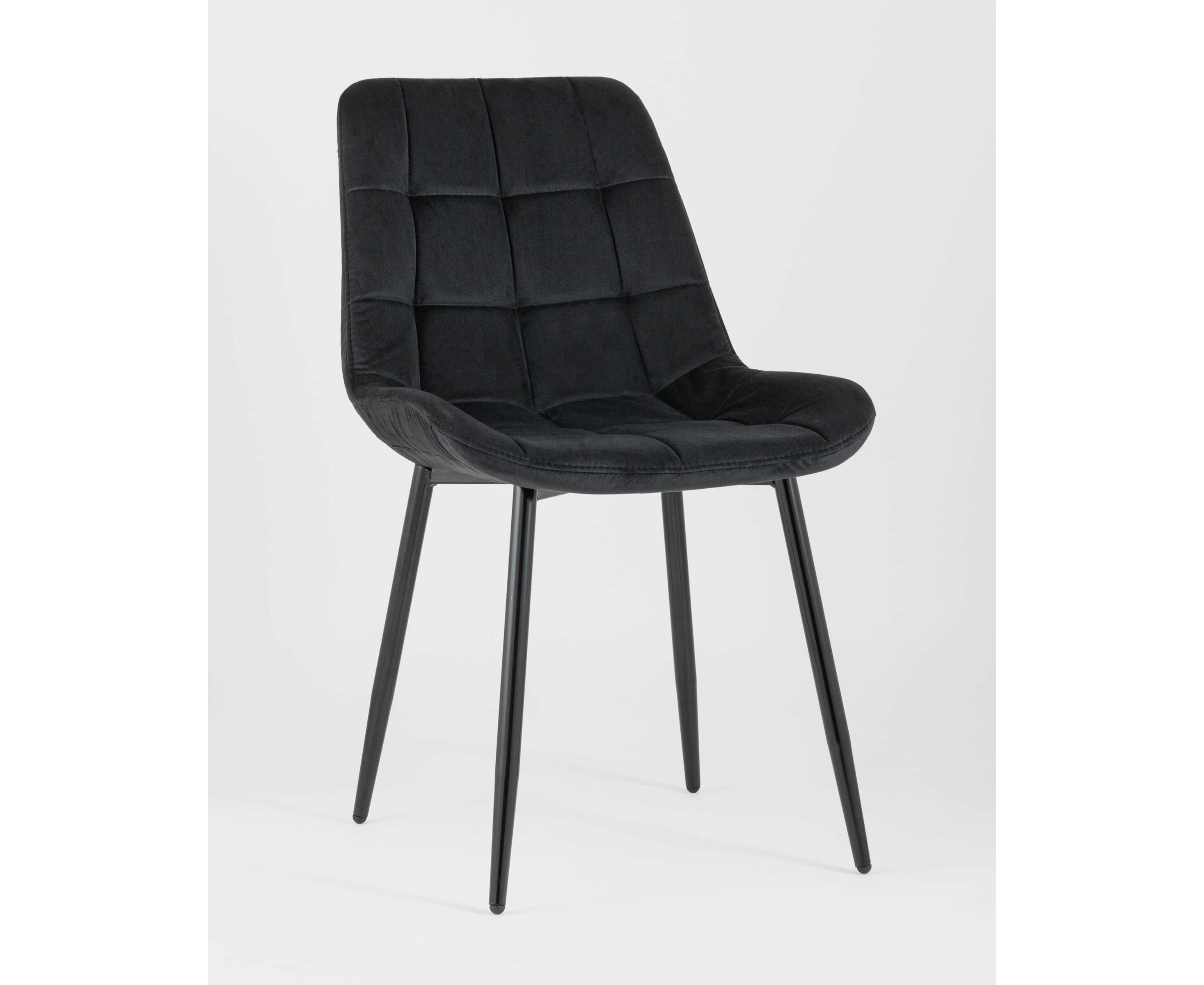 Чёрный кухонный стул в мягкой обивке из велюра без подлокотников. Анатомическая форма сиденья обеспечивает удобство, а декоративная стяжка придает объём и защищает от образования вмятин. Металлические ножки с крестовидным каркасом выдерживают значительные нагрузки. Подпятники ножек не испортят напольное покрытие и предохраняют от скольжения. Лаконичный дизайн украсит любой кухонный интерьер.