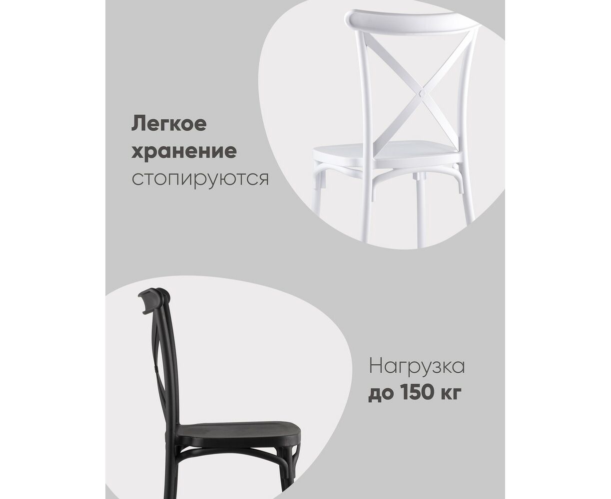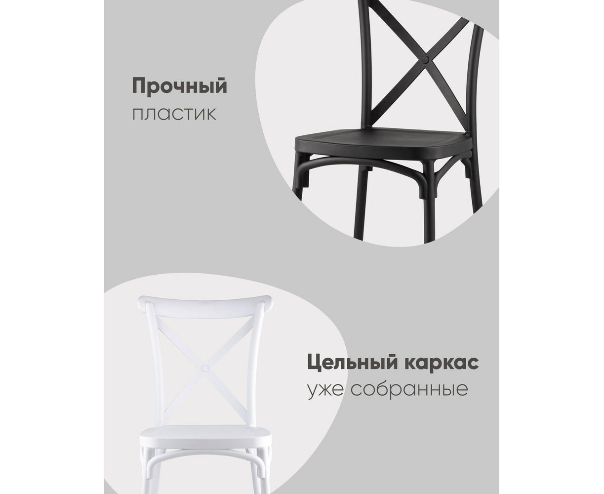 Стул из прочного пластика в классическом дизайне. Спинка украшена перекрестием. Максимальная нагрузка - до 160 кг. Для изготовления использован прочный пластик, ударопрочный, термостойкий. Стул подойдет как в обеденную зону, так и в беседку или кафе.