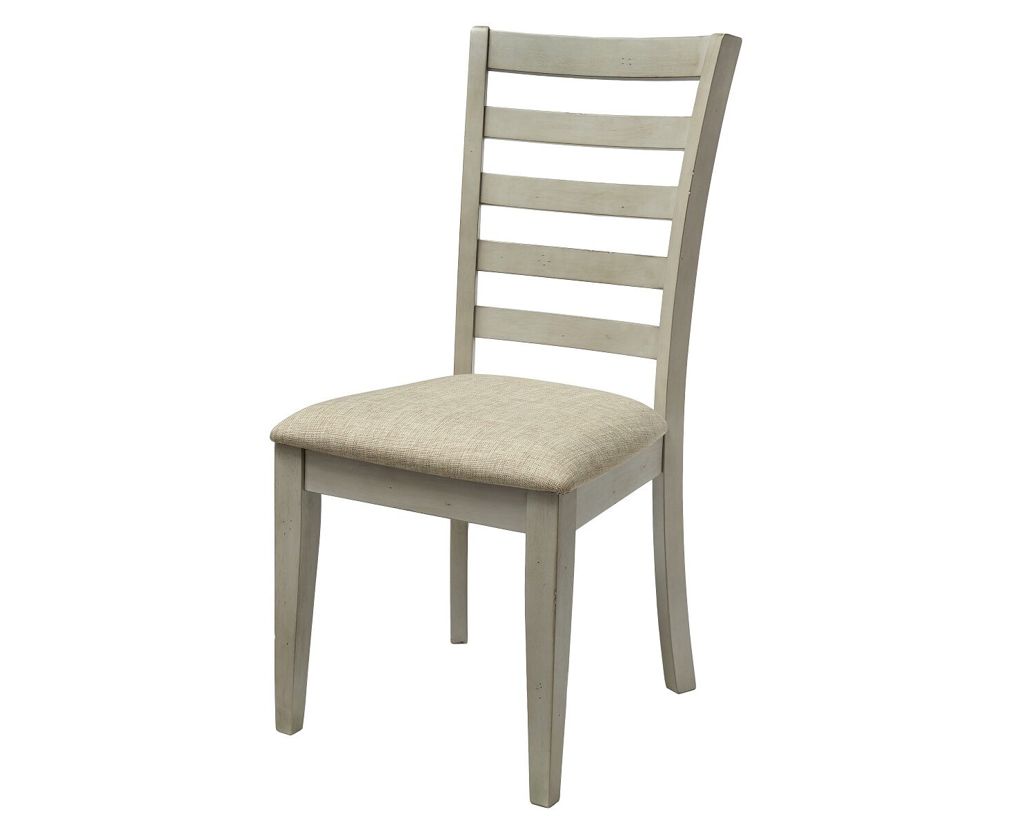 Каркас стула выполнен из массива гевеи с винтажным эффектом и потёртостями. Сиденье обито тканью светло-бежевого цвета.