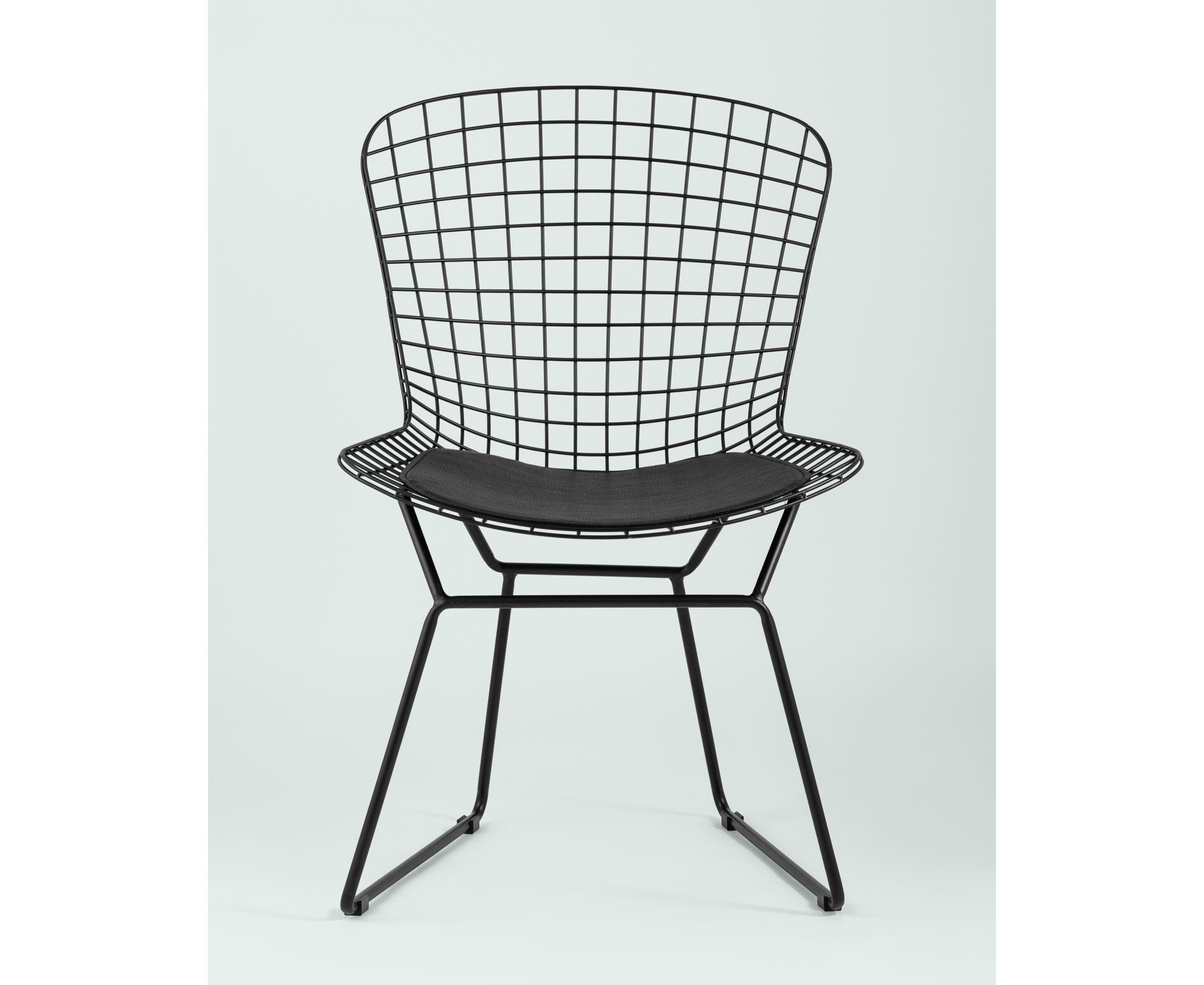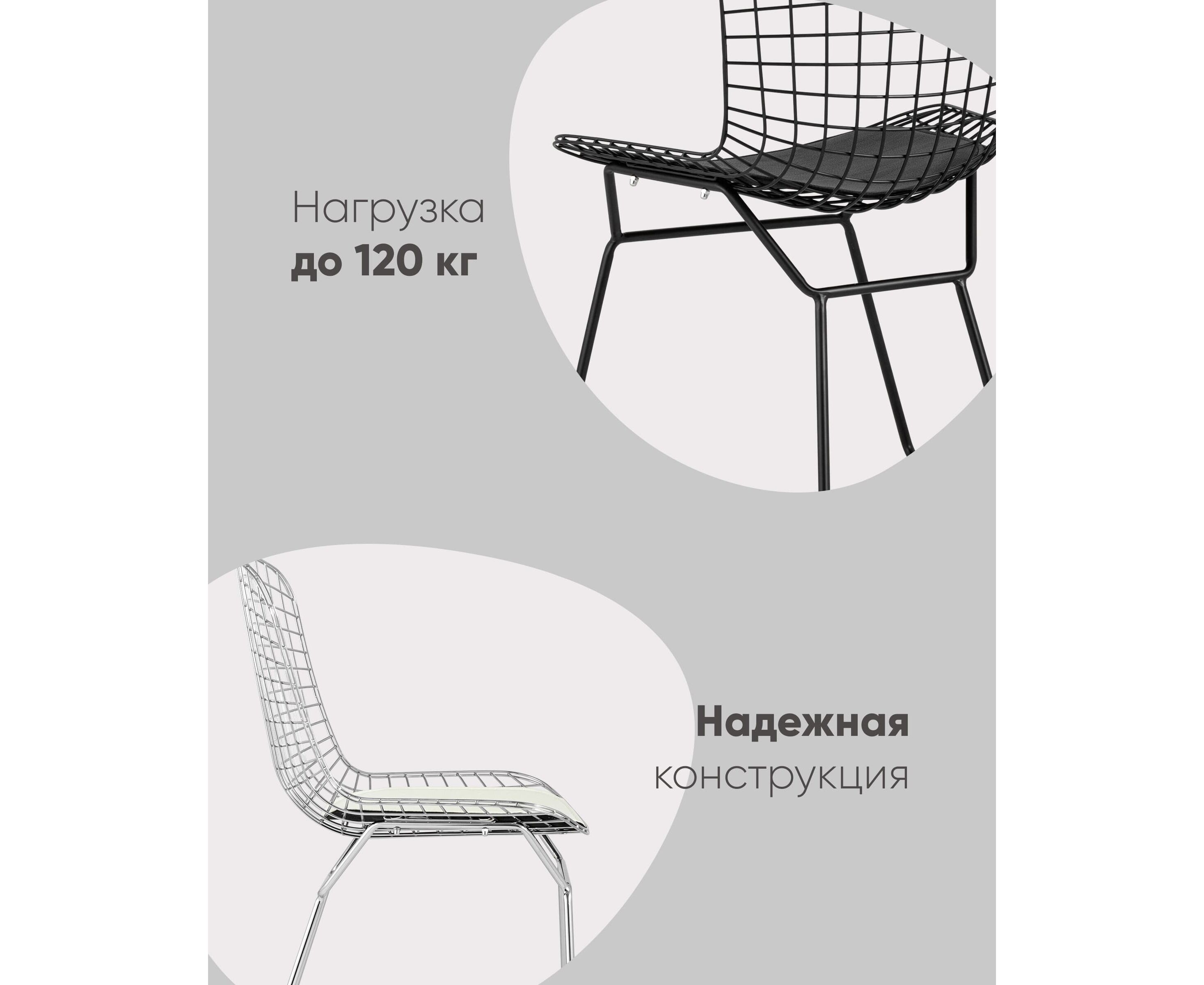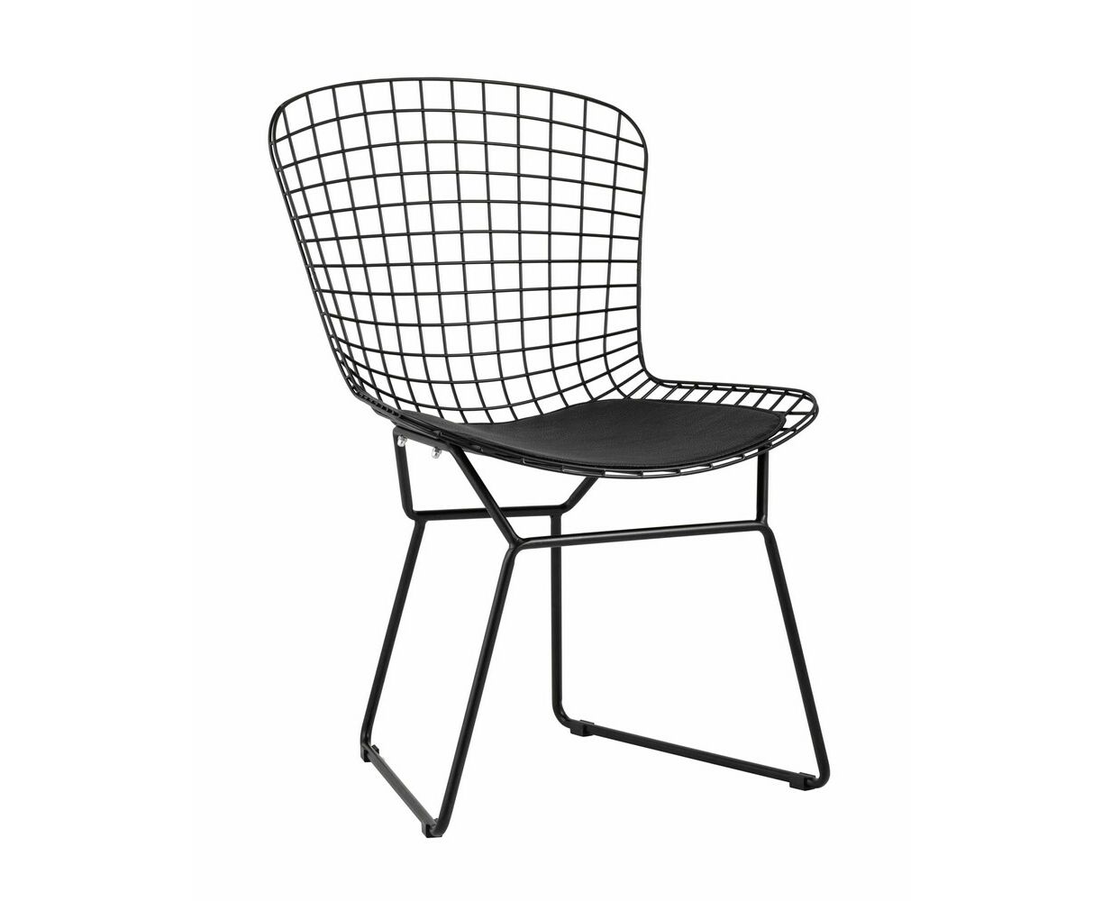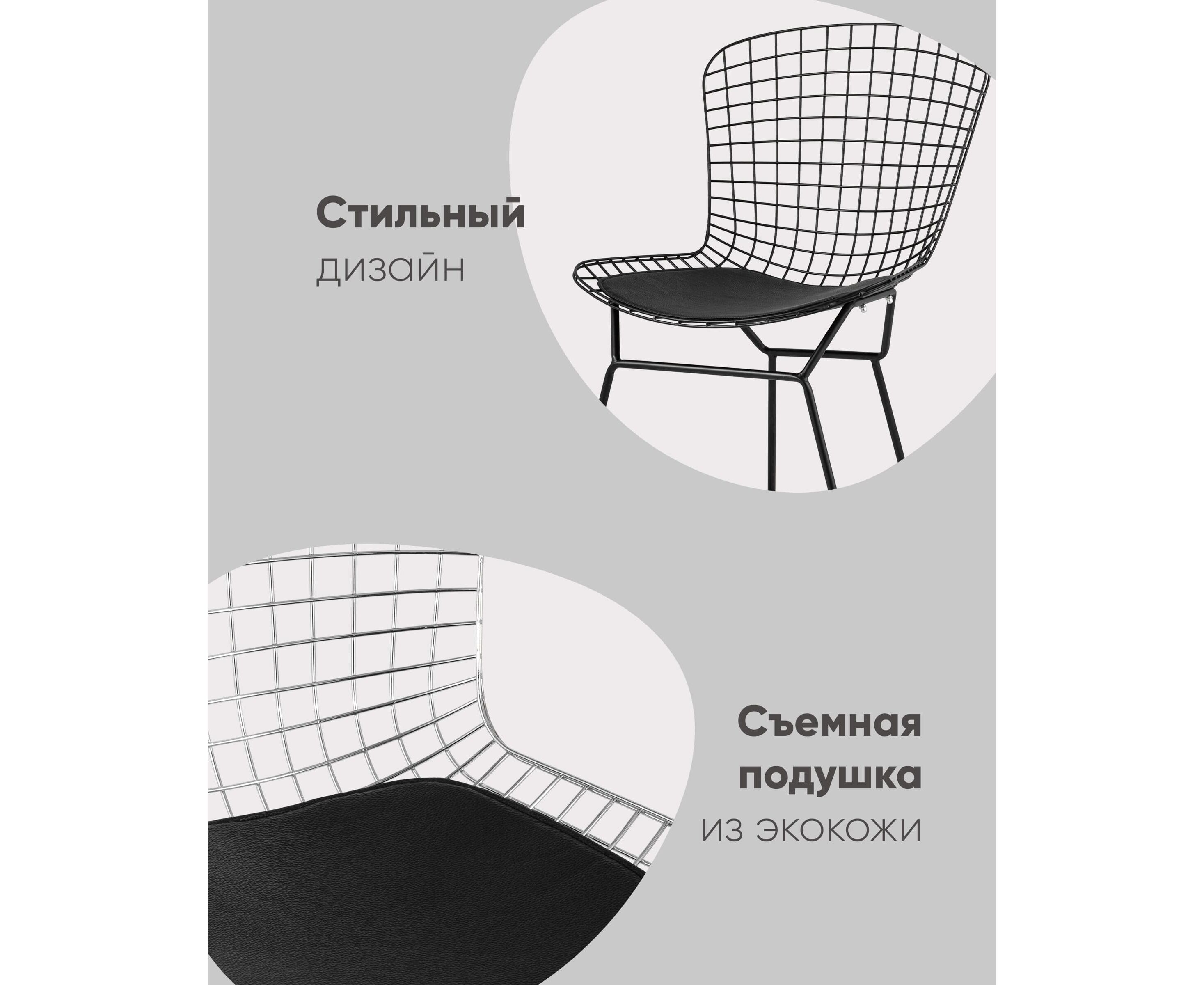 Оригинальная и современная модель стула Bertoia прекрасно впишется в любой интерьер дома или ресторана. Спинка и сидение выполнены из металлических прутьев черного цвета в виде сетки и образуют единое целое. Подушка изготовлена из экокожи в черном цвете. Ножки выполнены из металла в тон сидения и имеют подставки, которые обеспечивают качественное "сцепление" с полом. Такая конструкция стула способна подарить ощущение легкости.