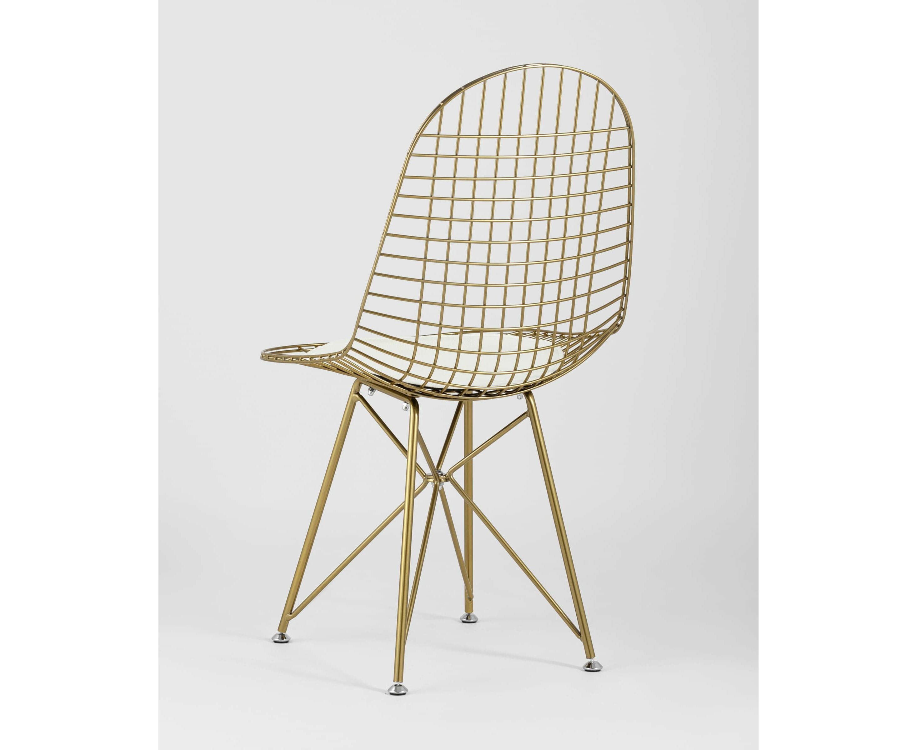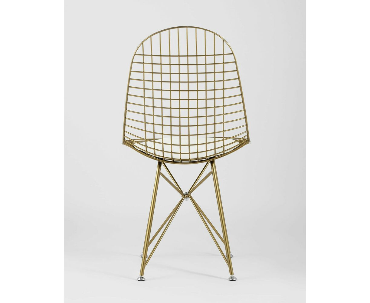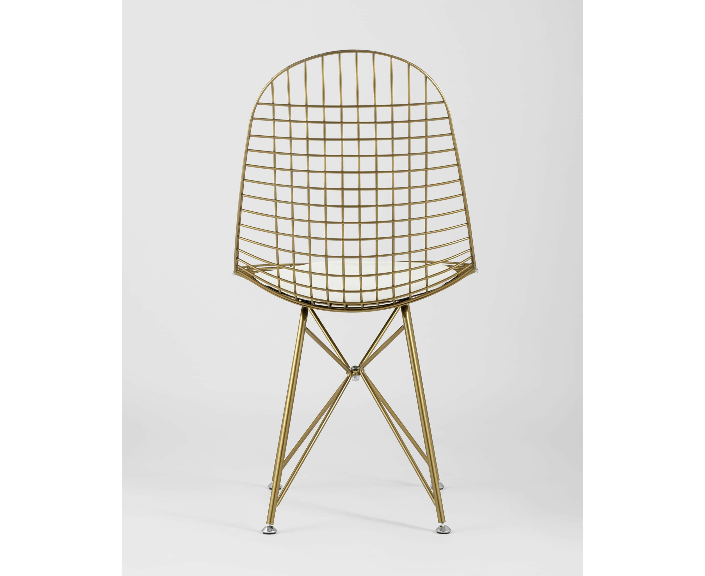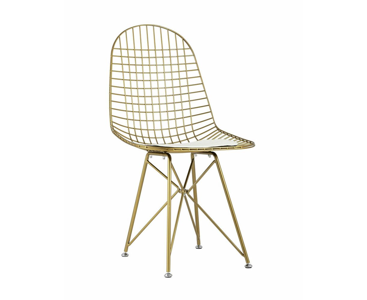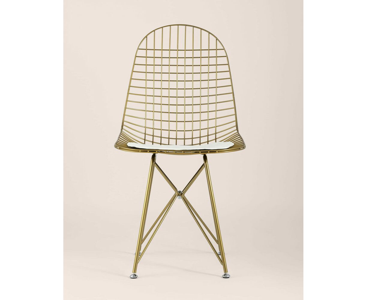 Элегантная модель обеденного стула Eiffel с говорящим названием. Металлические ножки своим дизайном напоминают элемент конструкции Эйфелевой башни. Спинка и сидение выполнены из хромированного металла в оттенке золота с гальваническим покрытием. Подушка изготовлена из экокожи в белом цвете. Такой стул прекрасно дополнит интерьер дома или ресторана.