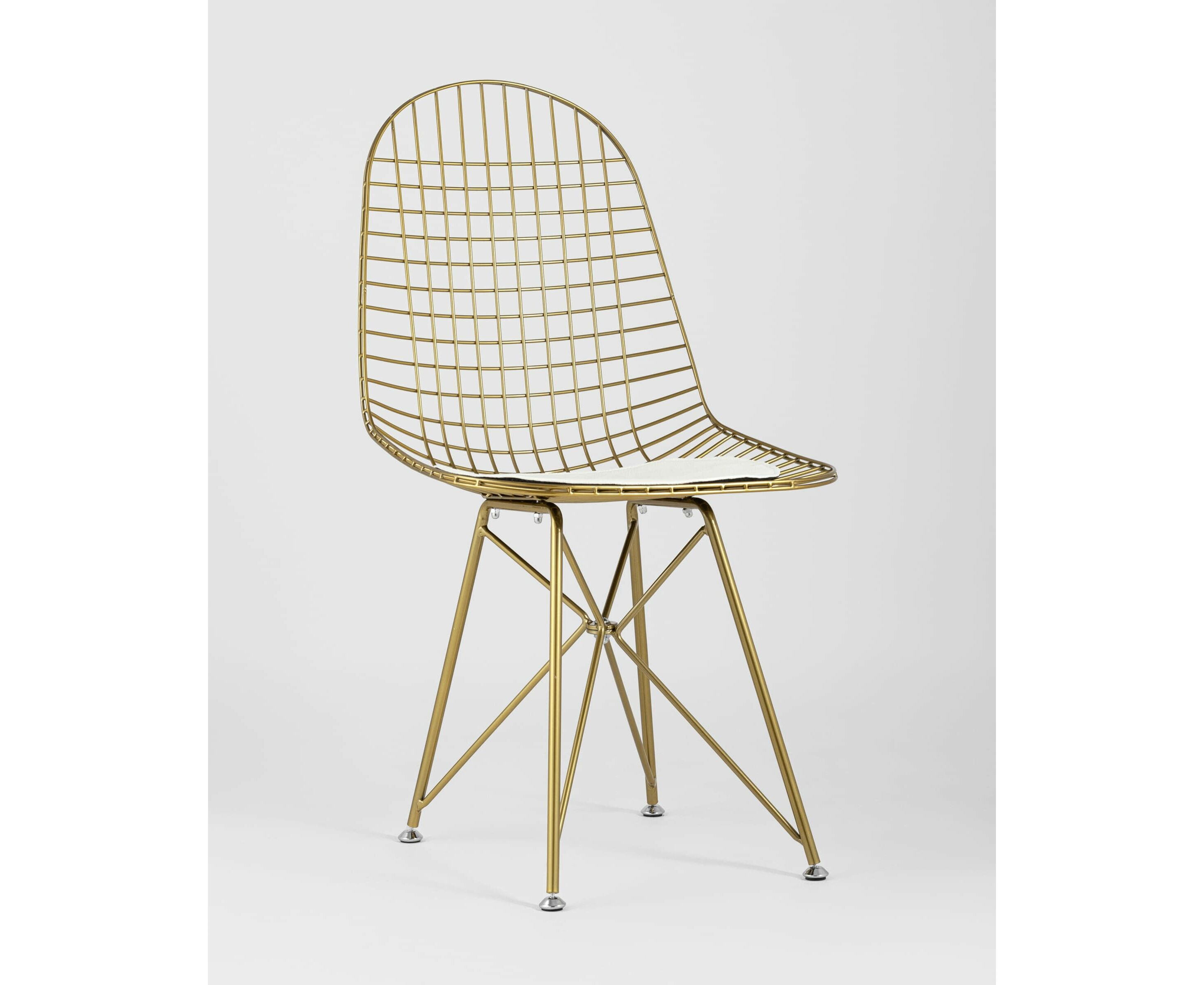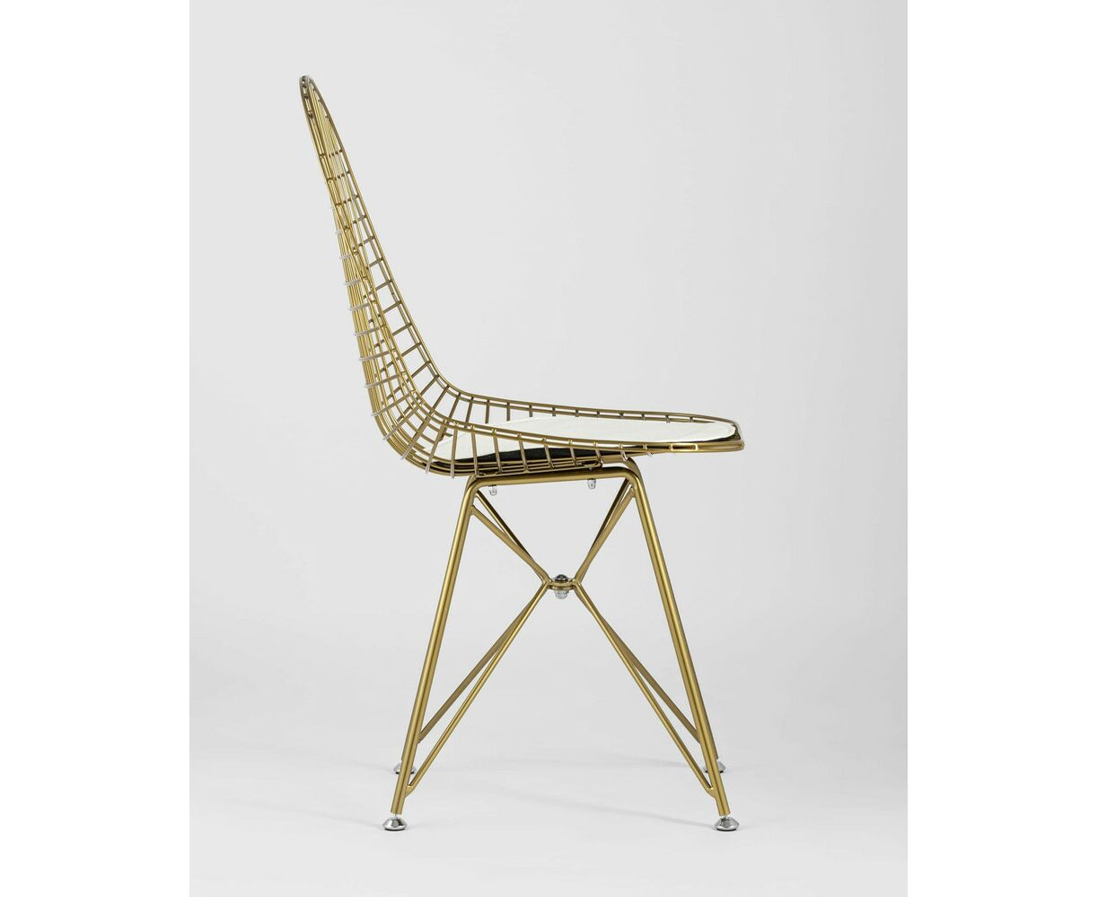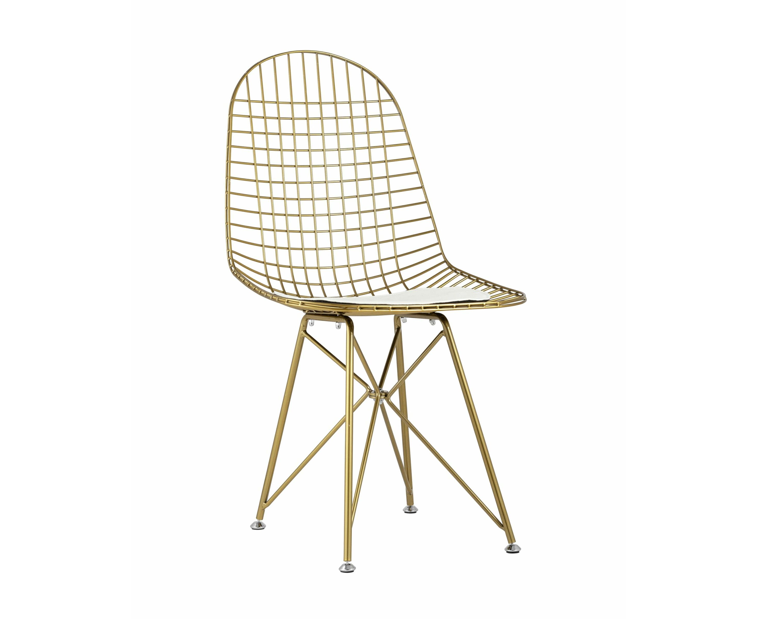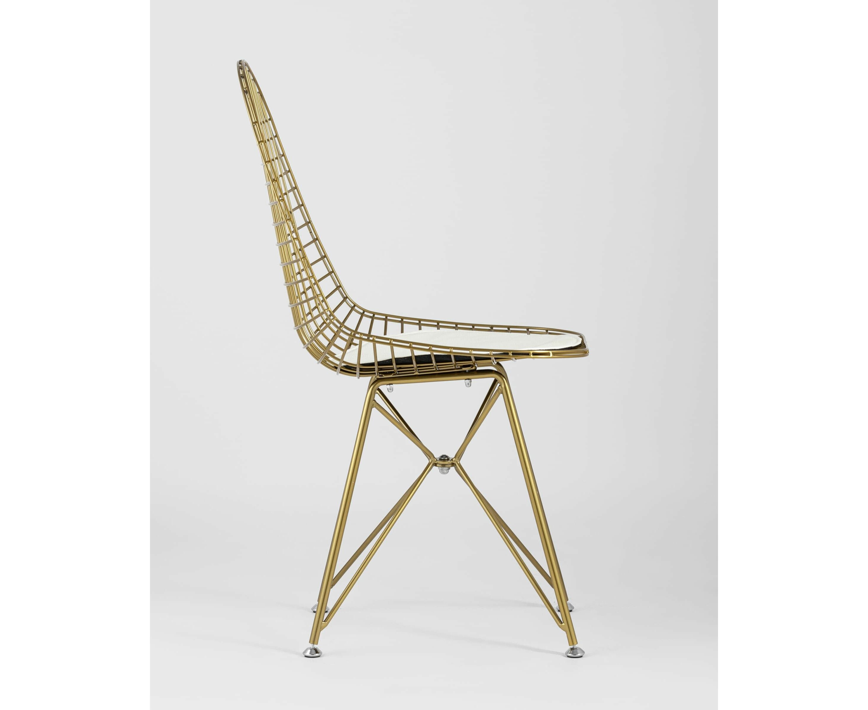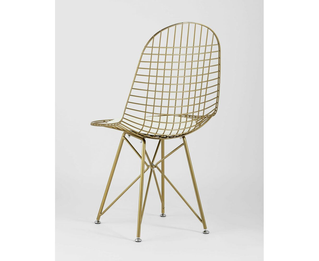 Элегантная модель обеденного стула Eiffel с говорящим названием. Металлические ножки своим дизайном напоминают элемент конструкции Эйфелевой башни. Спинка и сидение выполнены из хромированного металла в оттенке золота с гальваническим покрытием. Подушка изготовлена из экокожи в белом цвете. Такой стул прекрасно дополнит интерьер дома или ресторана.