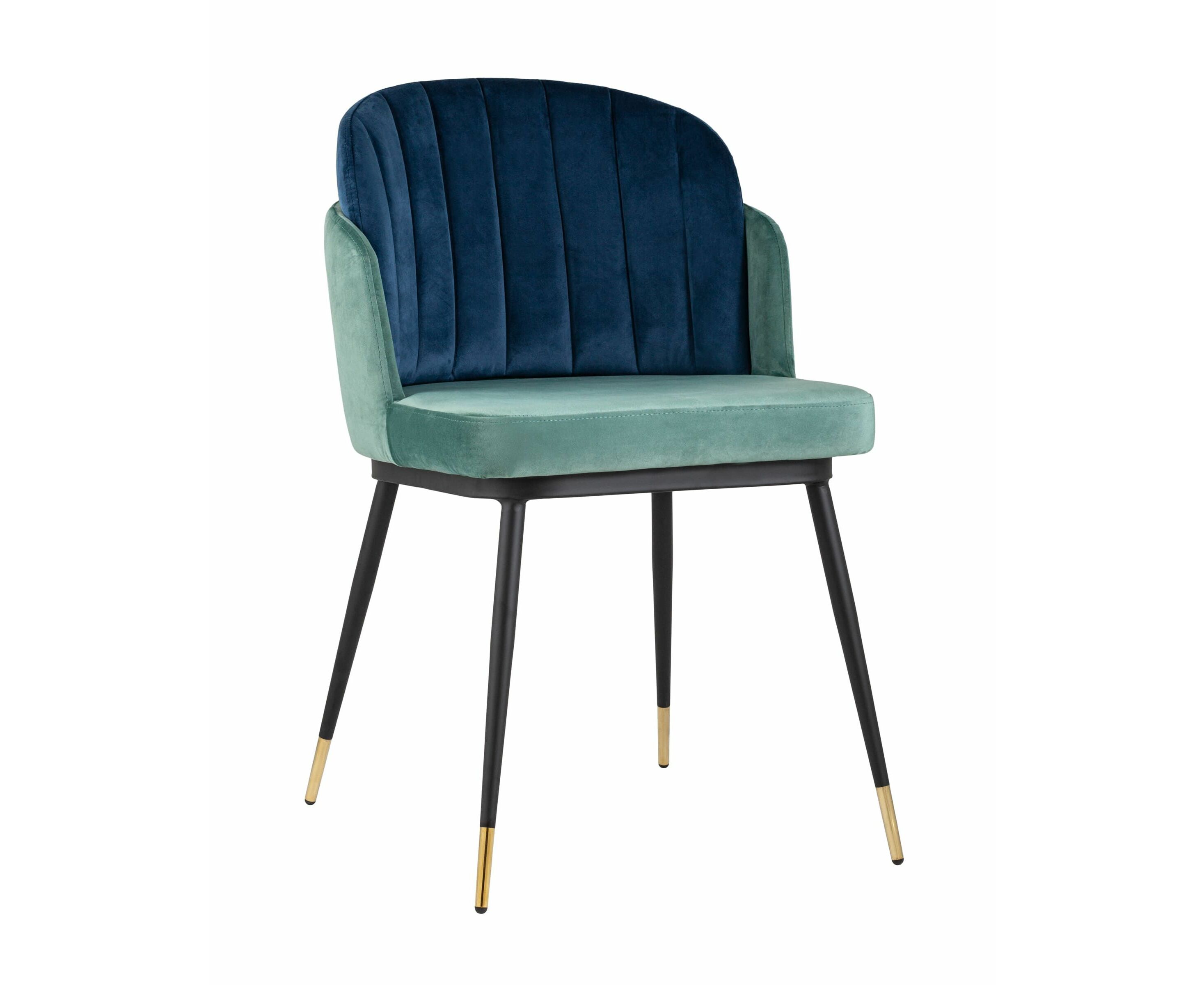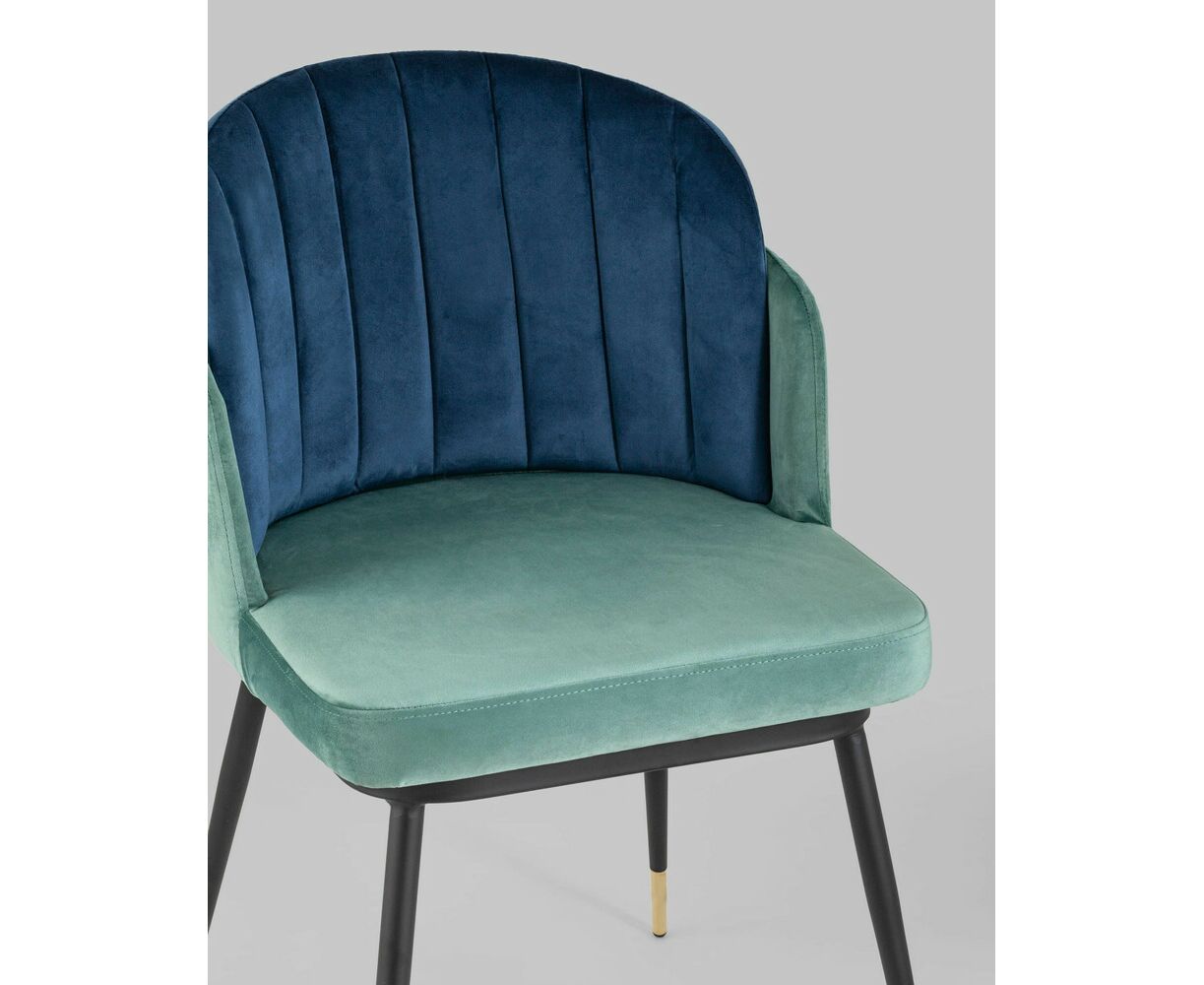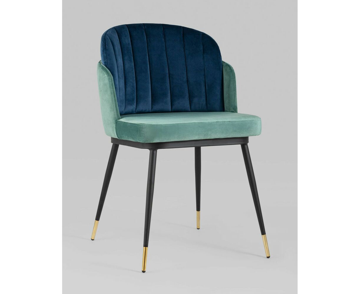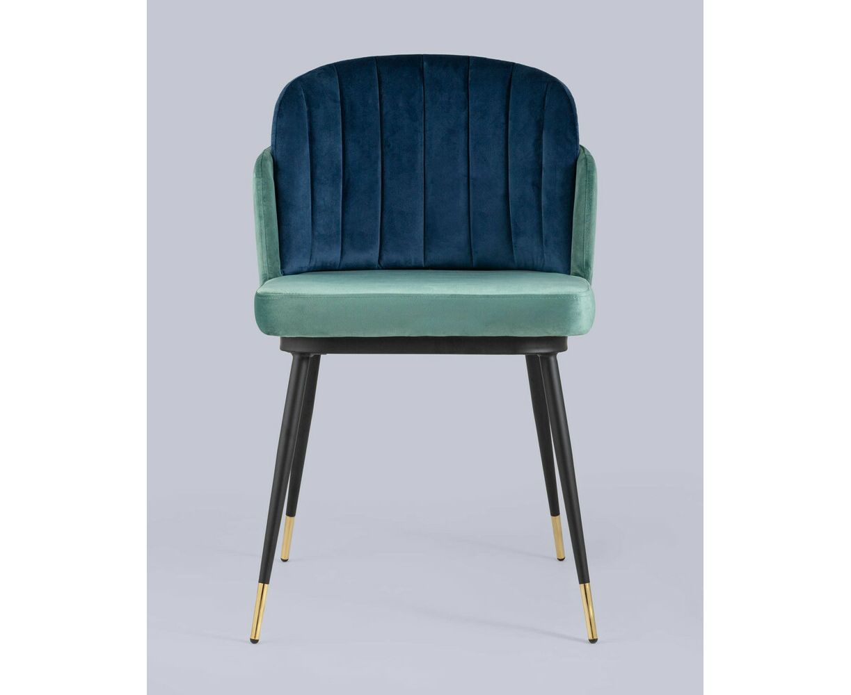 Мягкий двухцветный кухонный стул с обивкой из велюра. Надежная опора достигается благодаря металлическому каркасу и удобным устойчивым ножкам, красиво украшенным золотом. Спинка состоит из двух элементов, внутренняя часть с вертикальной строчкой.