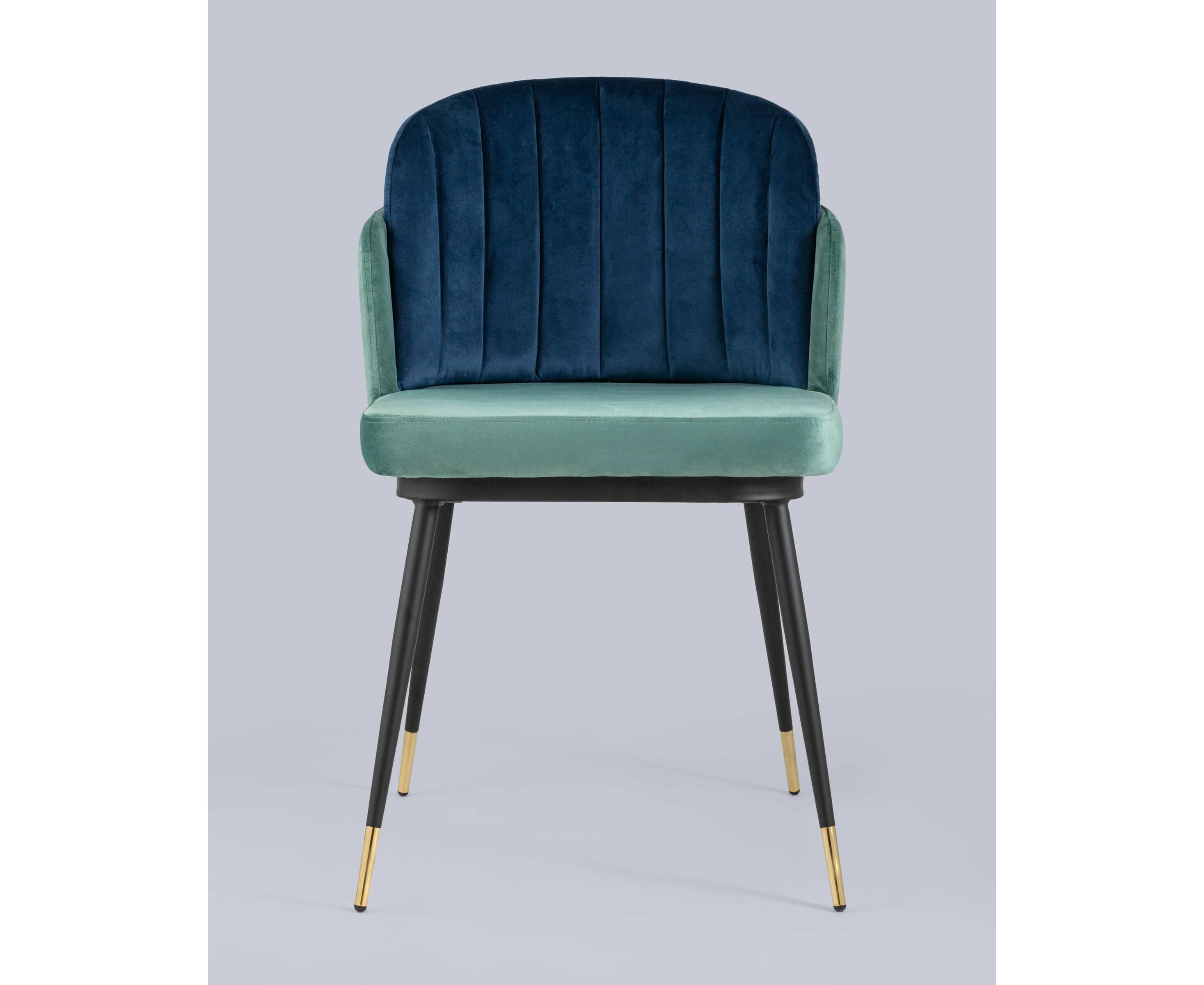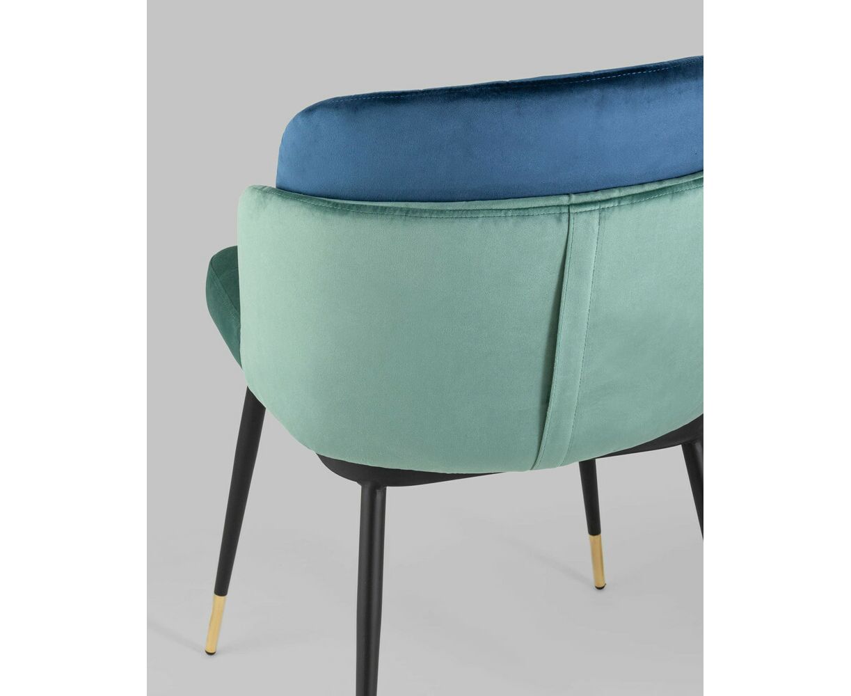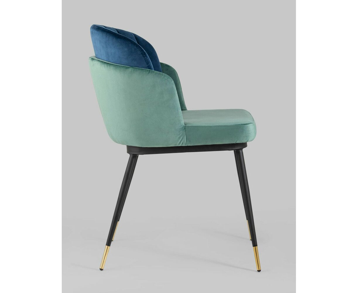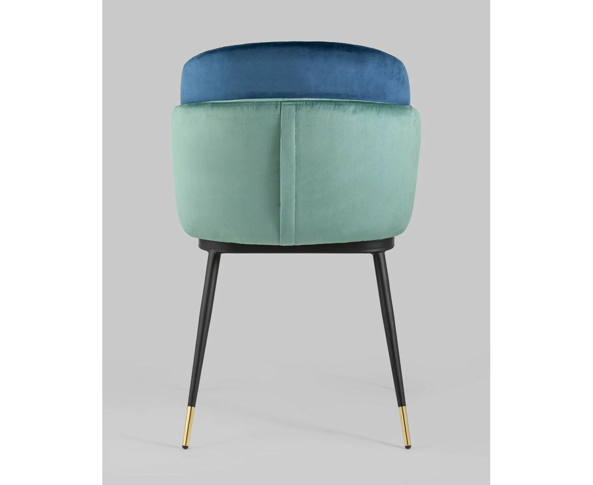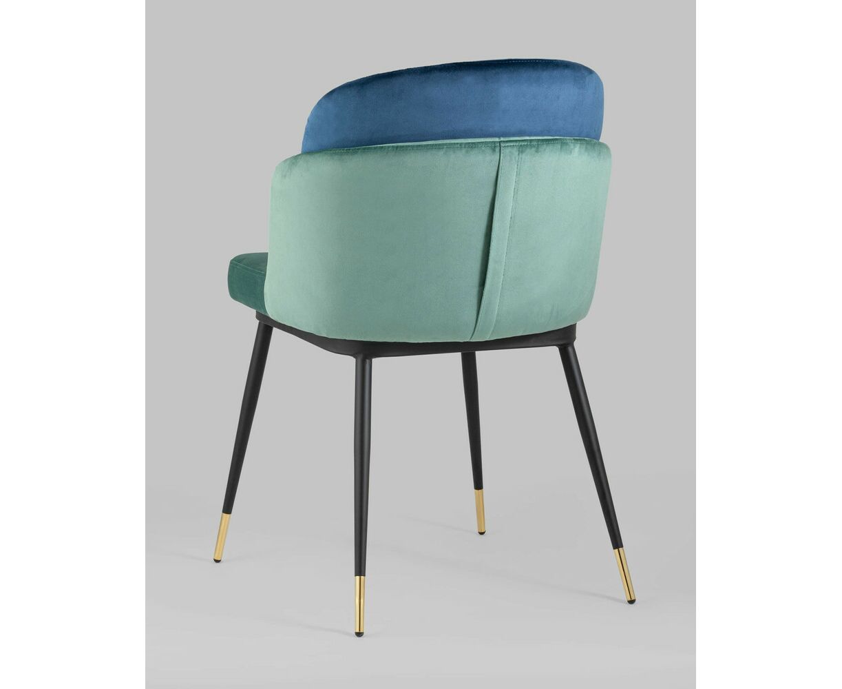 Мягкий двухцветный кухонный стул с обивкой из велюра. Надежная опора достигается благодаря металлическому каркасу и удобным устойчивым ножкам, красиво украшенным золотом. Спинка состоит из двух элементов, внутренняя часть с вертикальной строчкой.