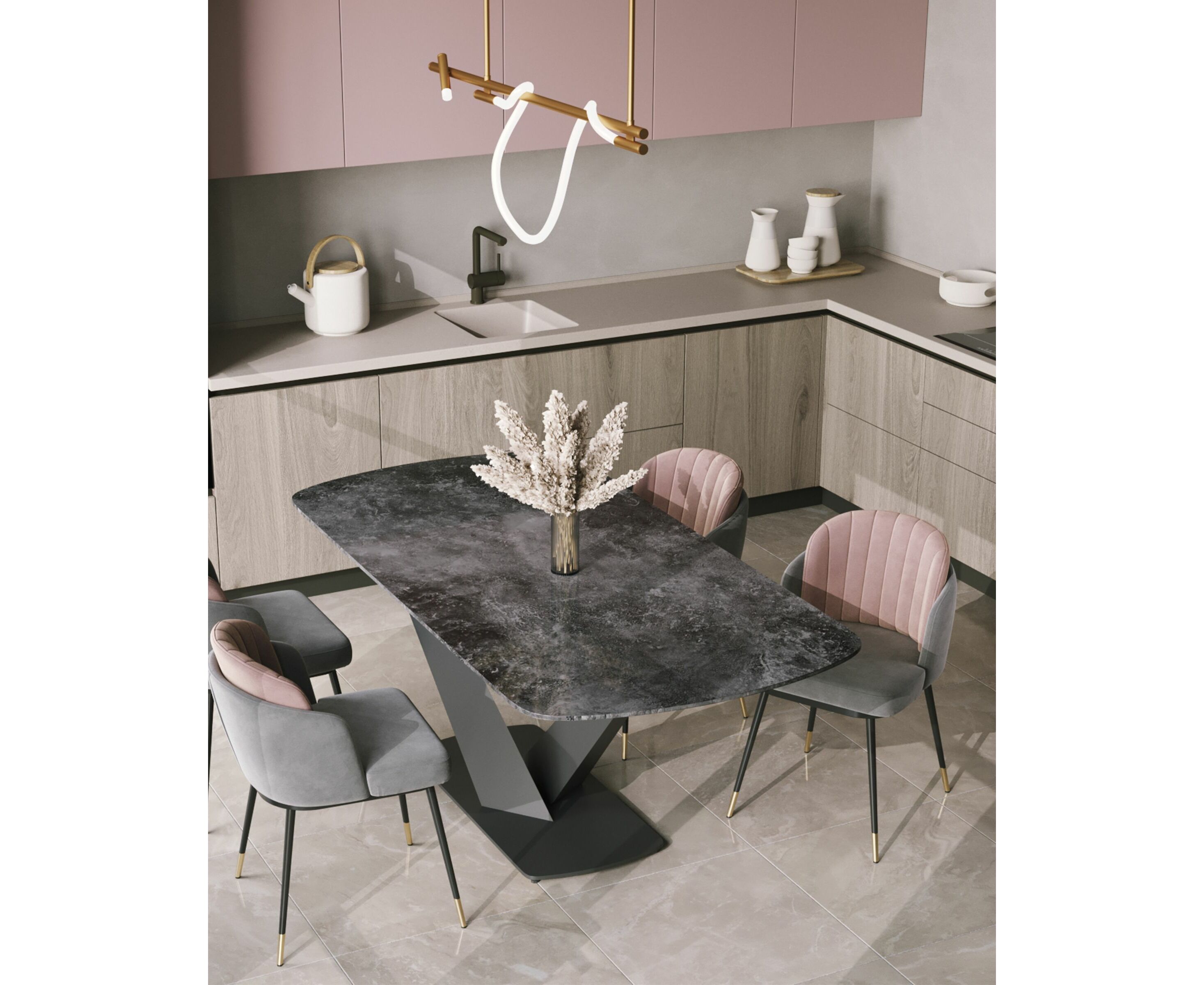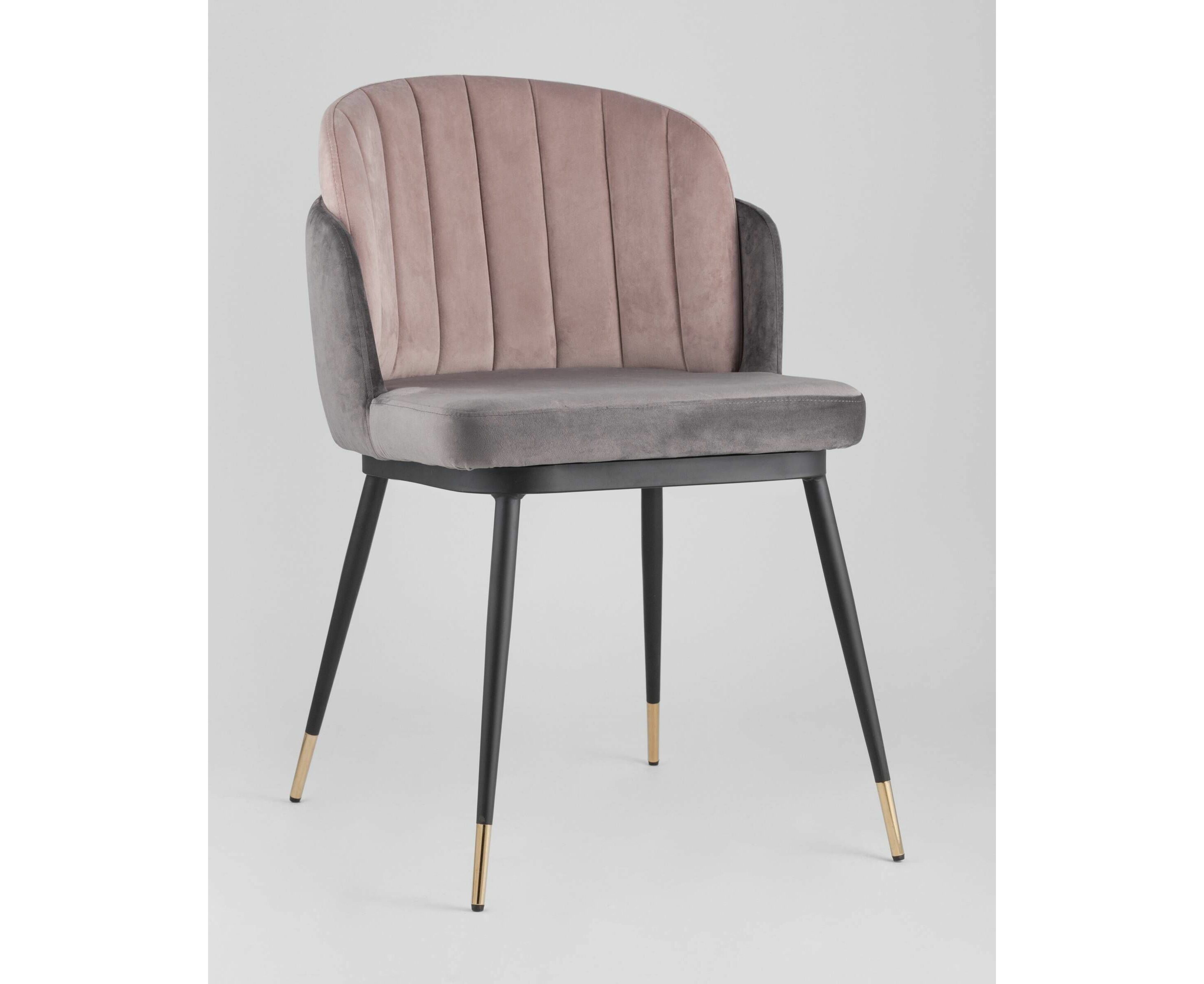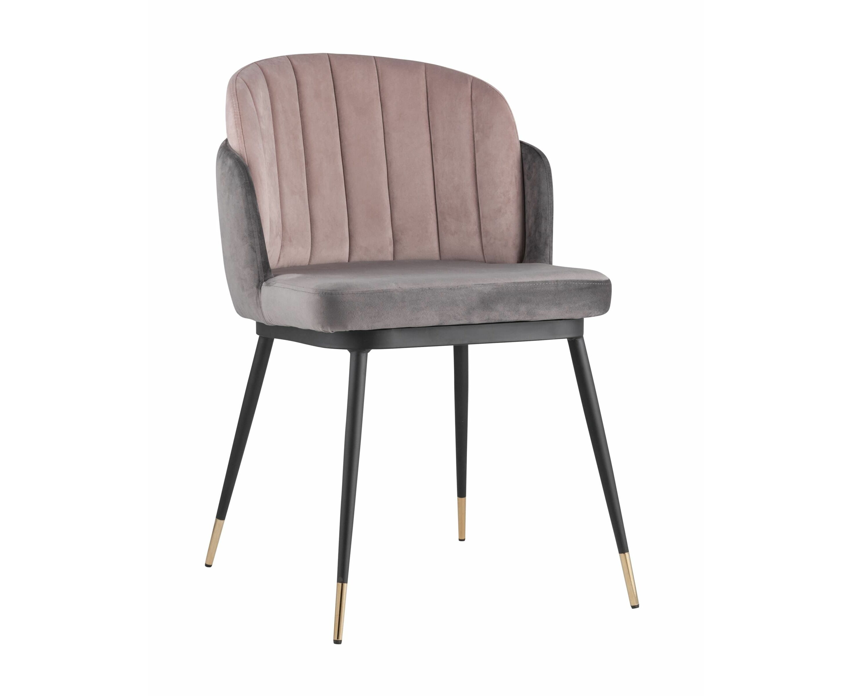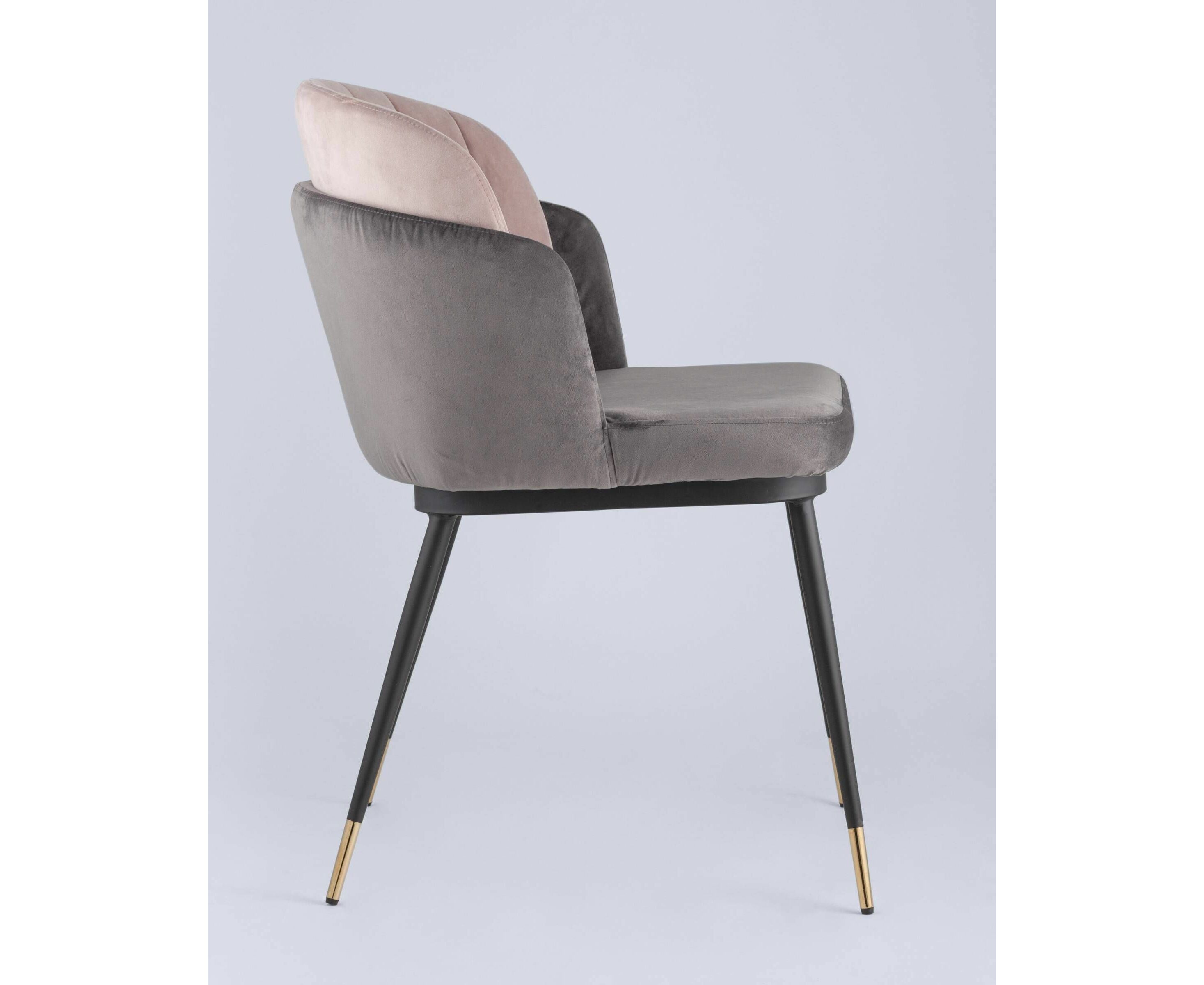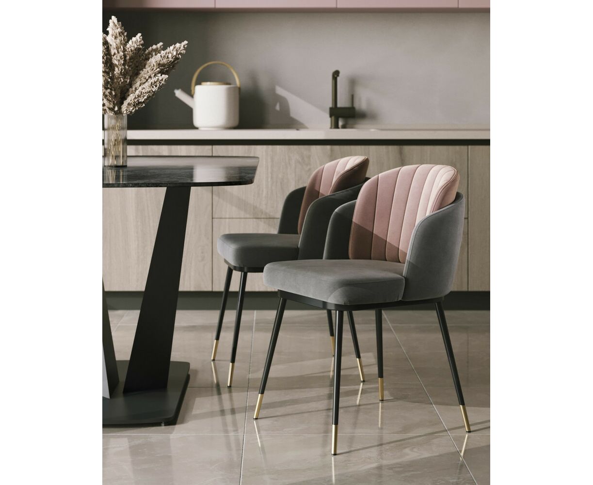 Мягкий двухцветный кухонный стул с обивкой из велюра. Надежная опора достигается благодаря металлическому каркасу и удобным устойчивым ножкам, украшенным золотом. Спинка состоит из двух элементов, внутренняя часть с красивой вертикальной строчкой.
