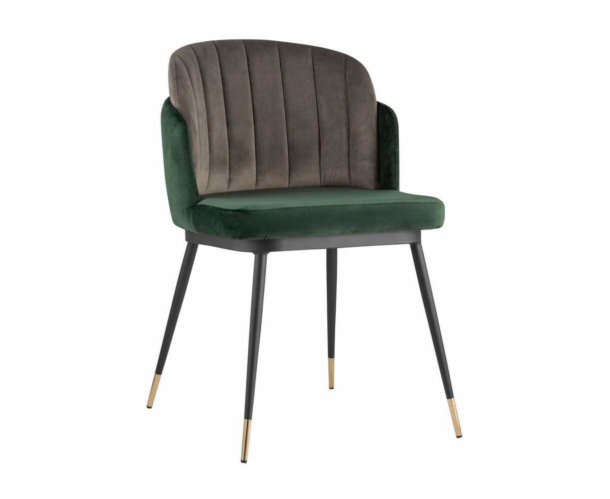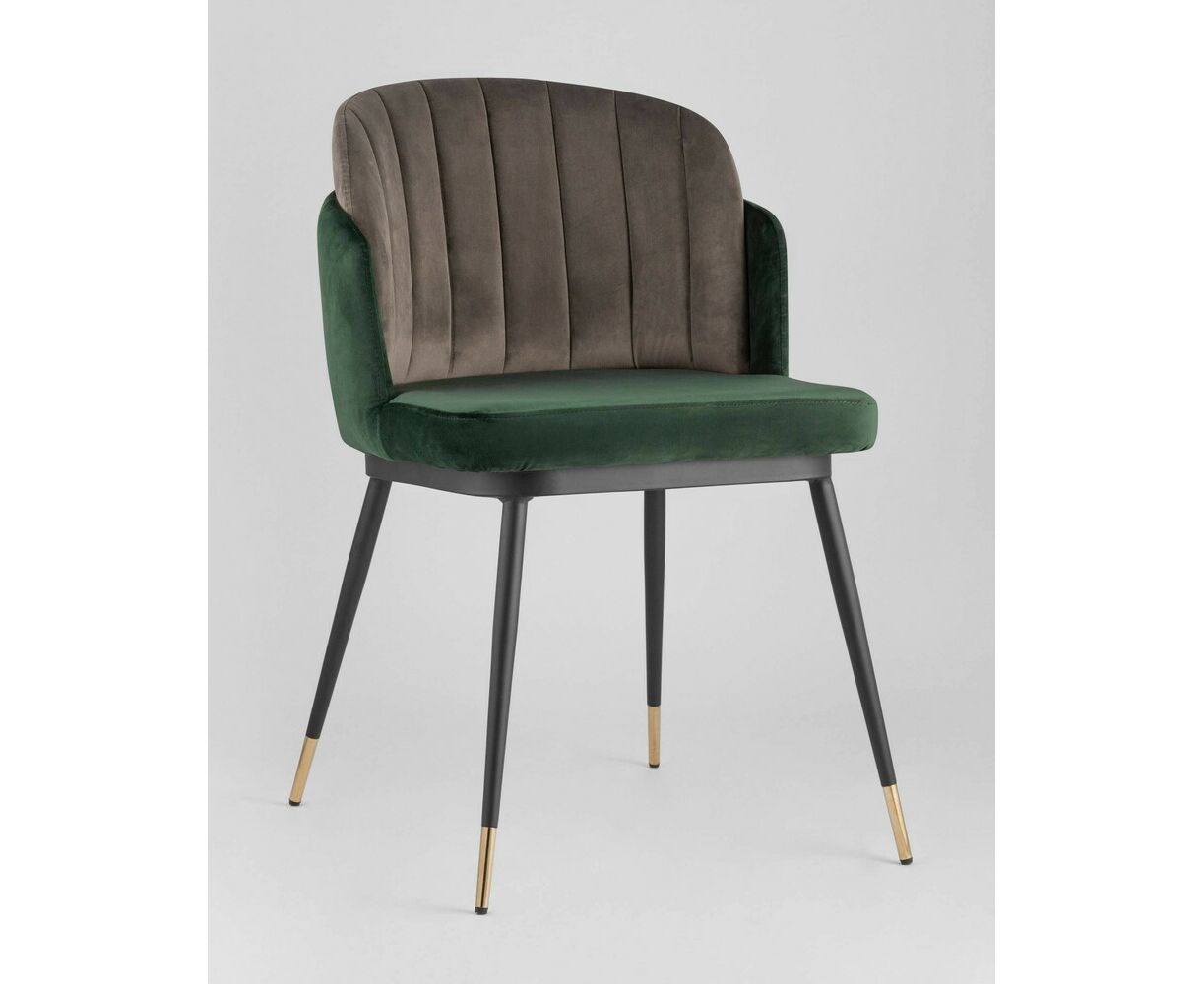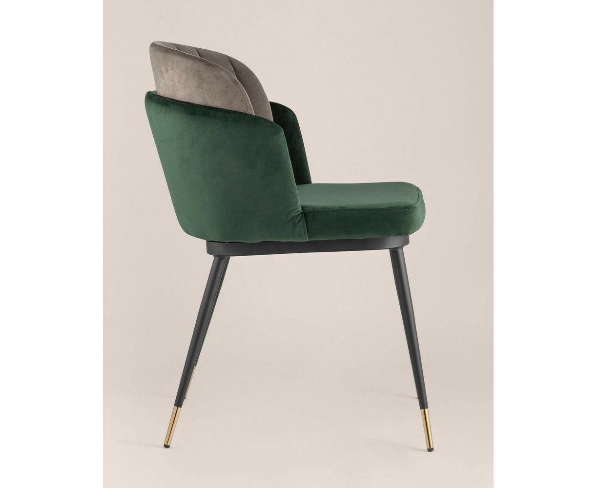 Мягкий двухцветный кухонный стул с обивкой из велюра. Надежная опора достигается благодаря металлическому каркасу и удобным устойчивым ножкам, красиво украшенным золотом. Спинка состоит из двух элементов, внутренняя часть с вертикальной строчкой.