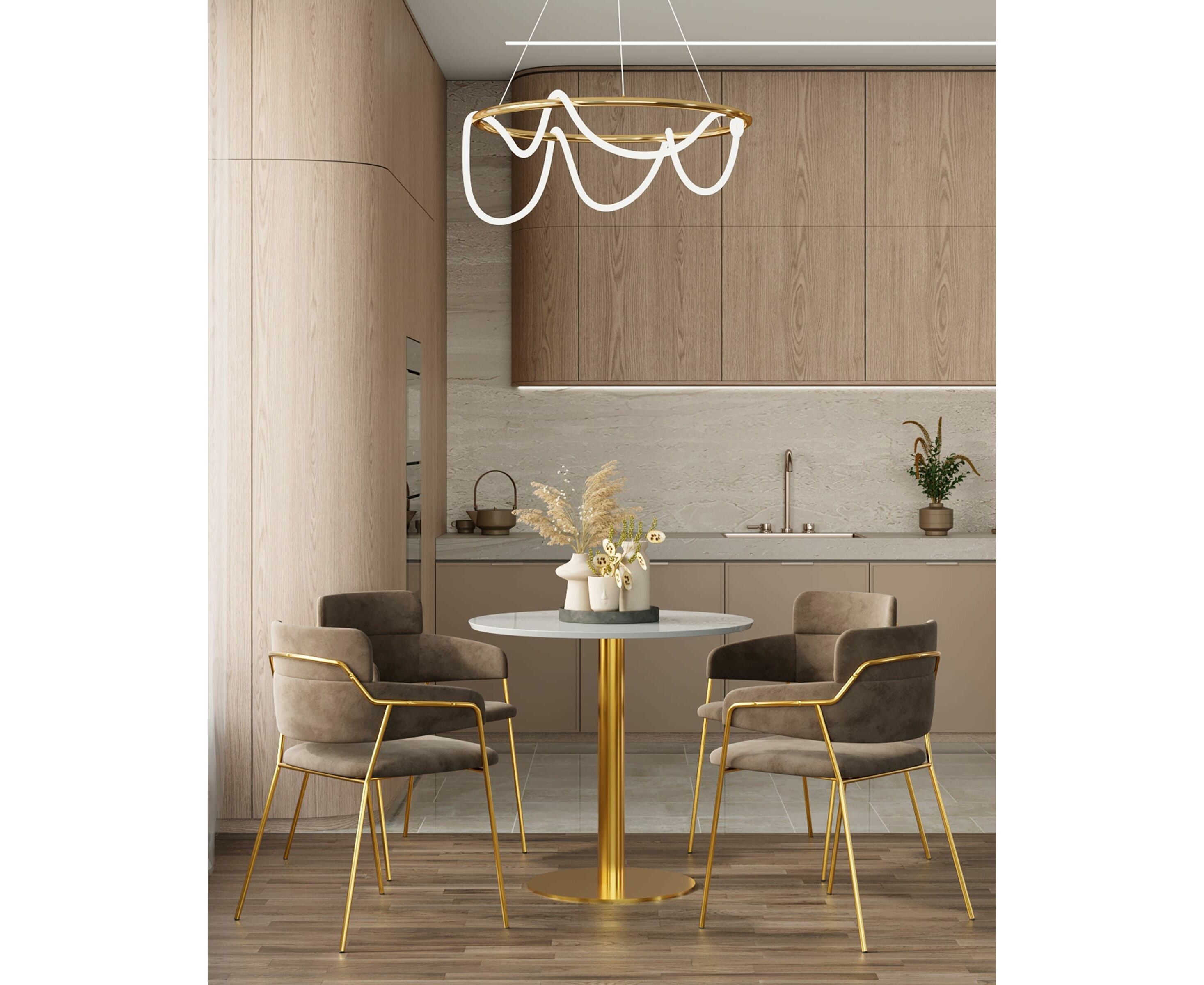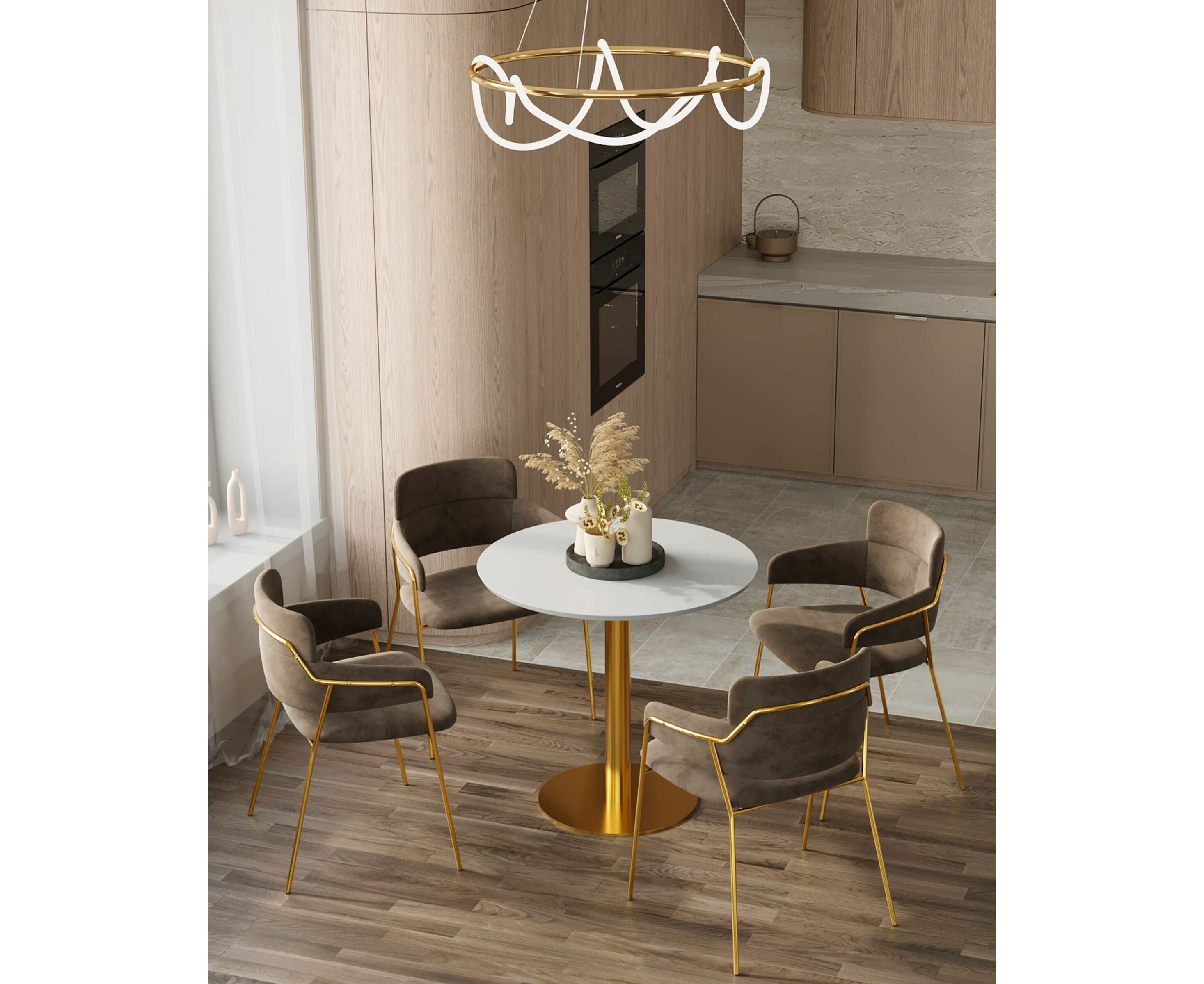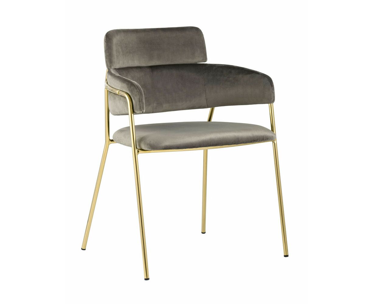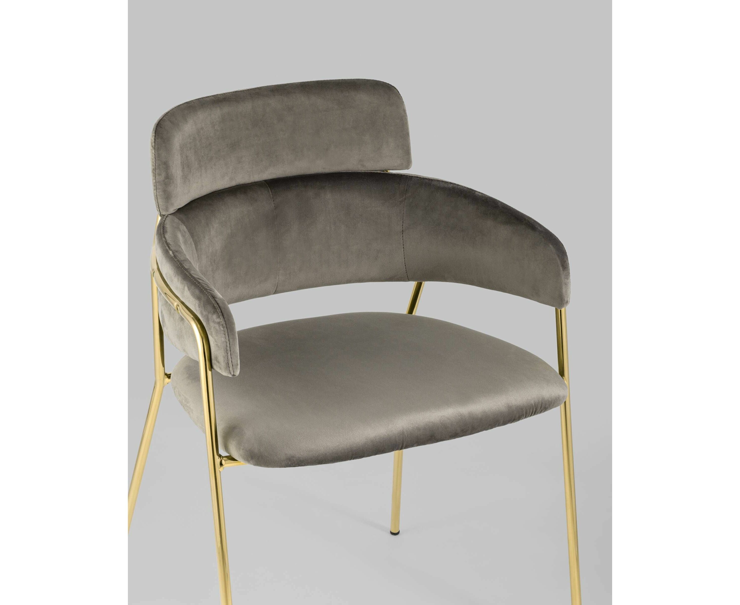 Стильный стул с оригинальной формой спинки, высокой поддержкой и подлокотниками. В качестве обивки используется мягкий велюр. Металлический каркас золотого цвета огибает спинку и выступает аккуратным акцентом модели. Широкое сиденье обеспечивает удобную посадку и уют.