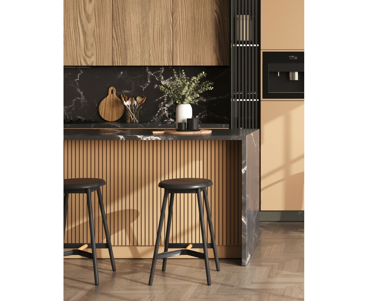 Сиденье выполнено из МДФ в черном цвете, не требует особого ухода и легко очищается от загрязнений. Прочный каркас изготовлен из металла с центральной перегородкой из массива дерева и выдерживает нагрузку до 150 кг.