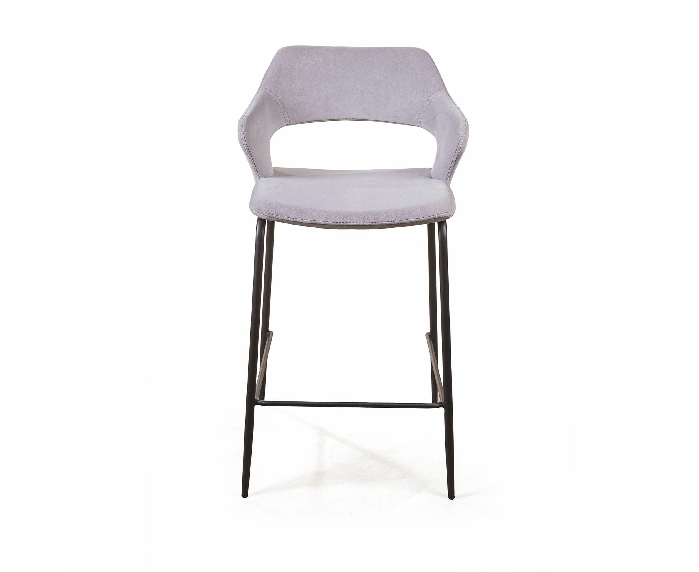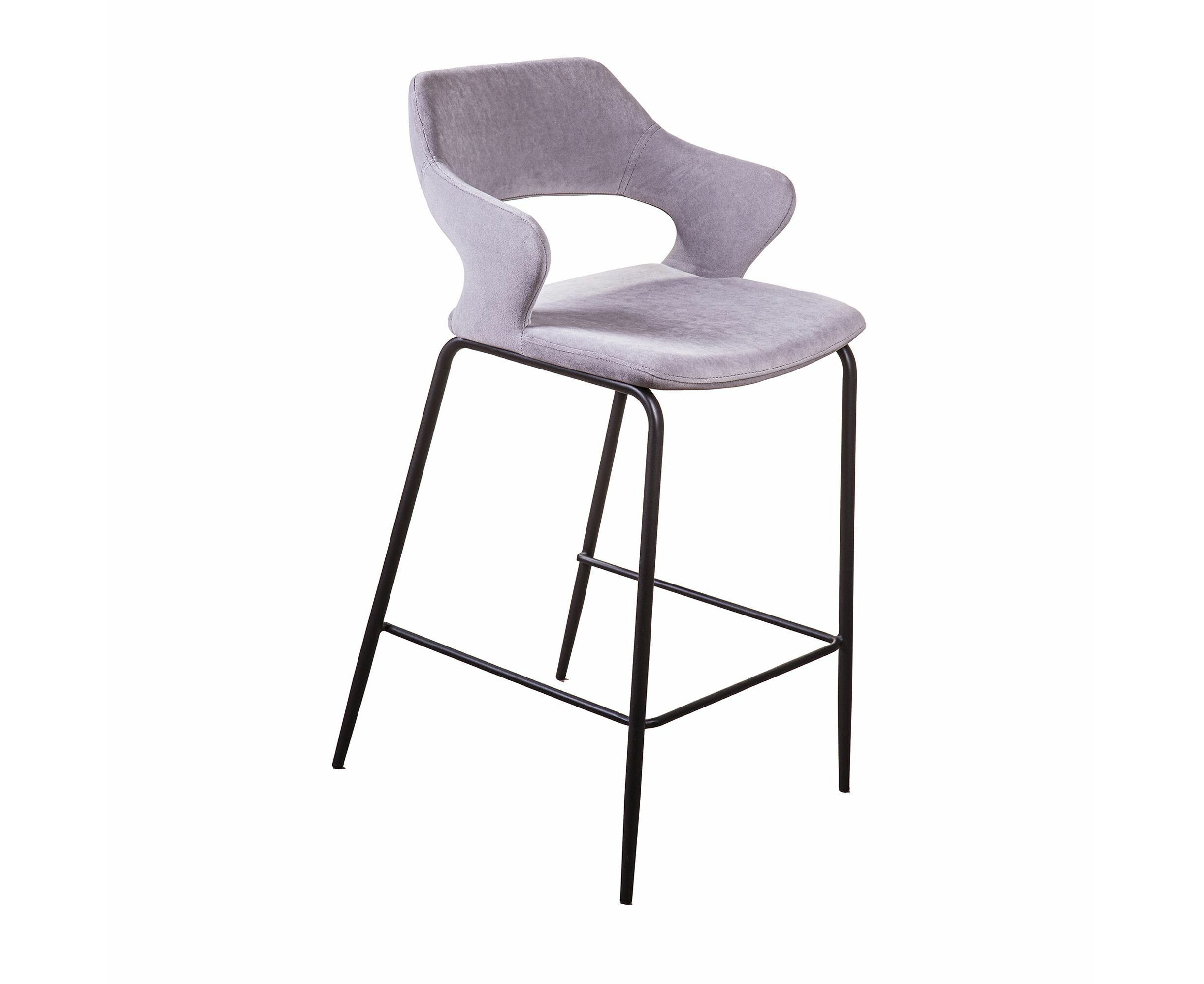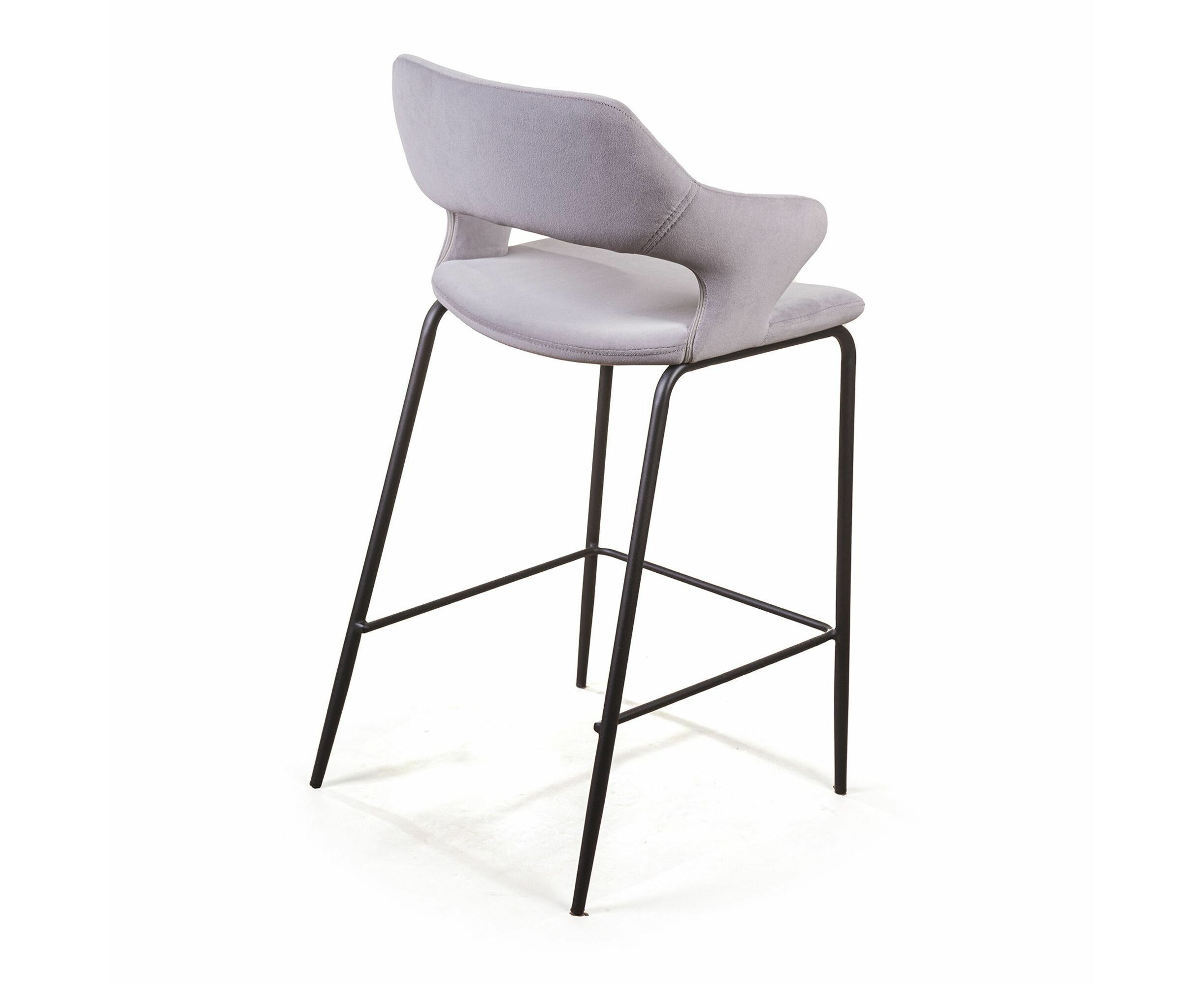Полубарные стулья с идентичной формой сиденья как-бы парят в воздухе, благодаря тонким, но очень прочным ножкам. Очертания опорной перекладины с прямыми углами подчеркивают футуристичность верхней части, мягкой во всех отношениях.