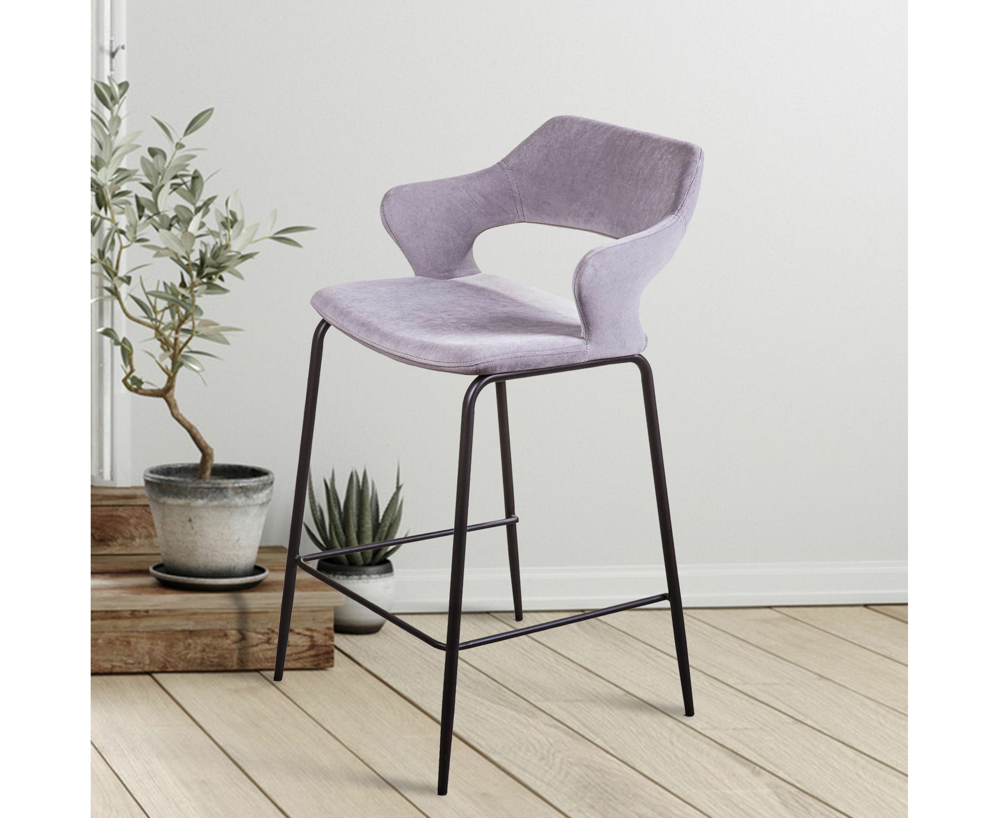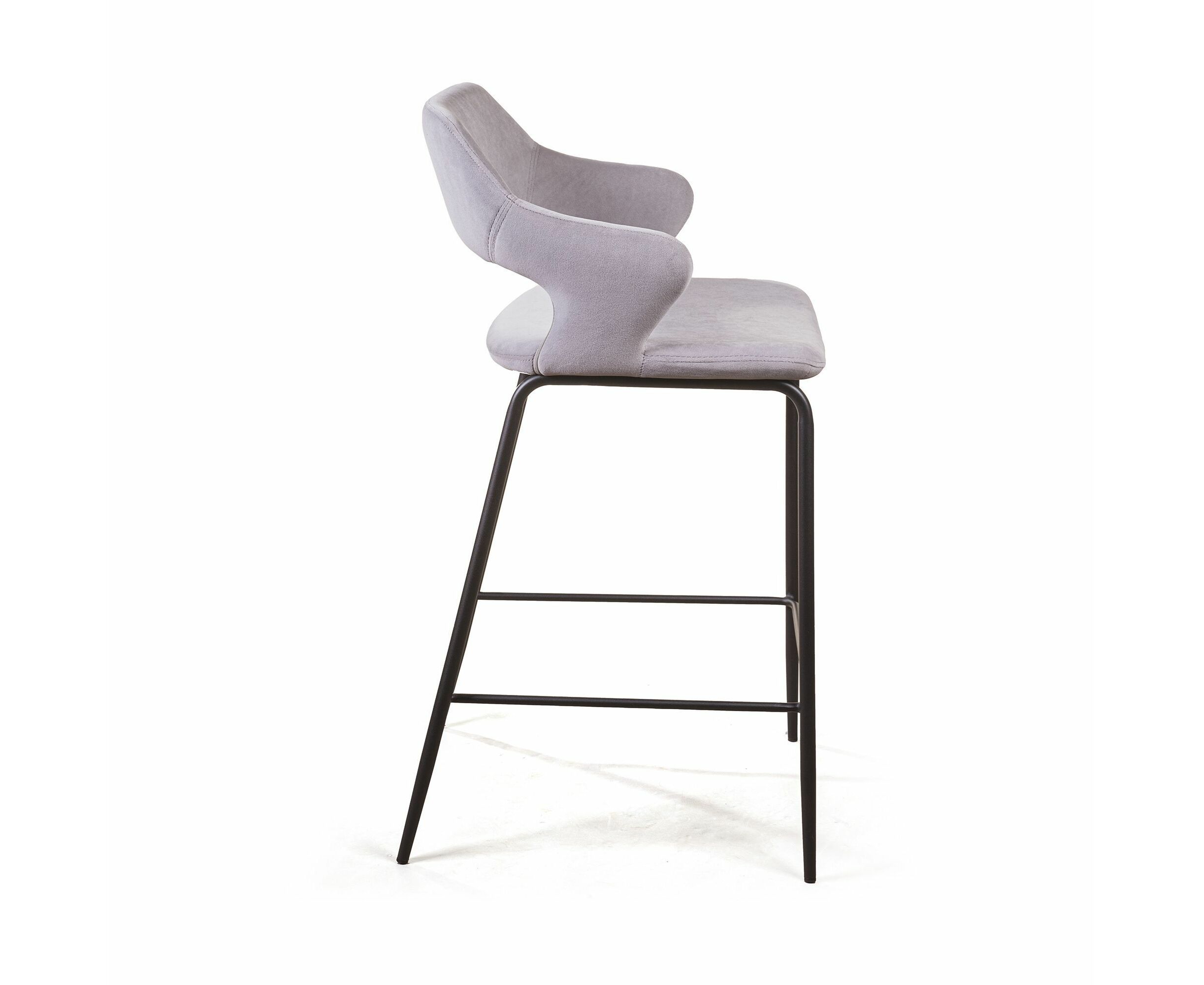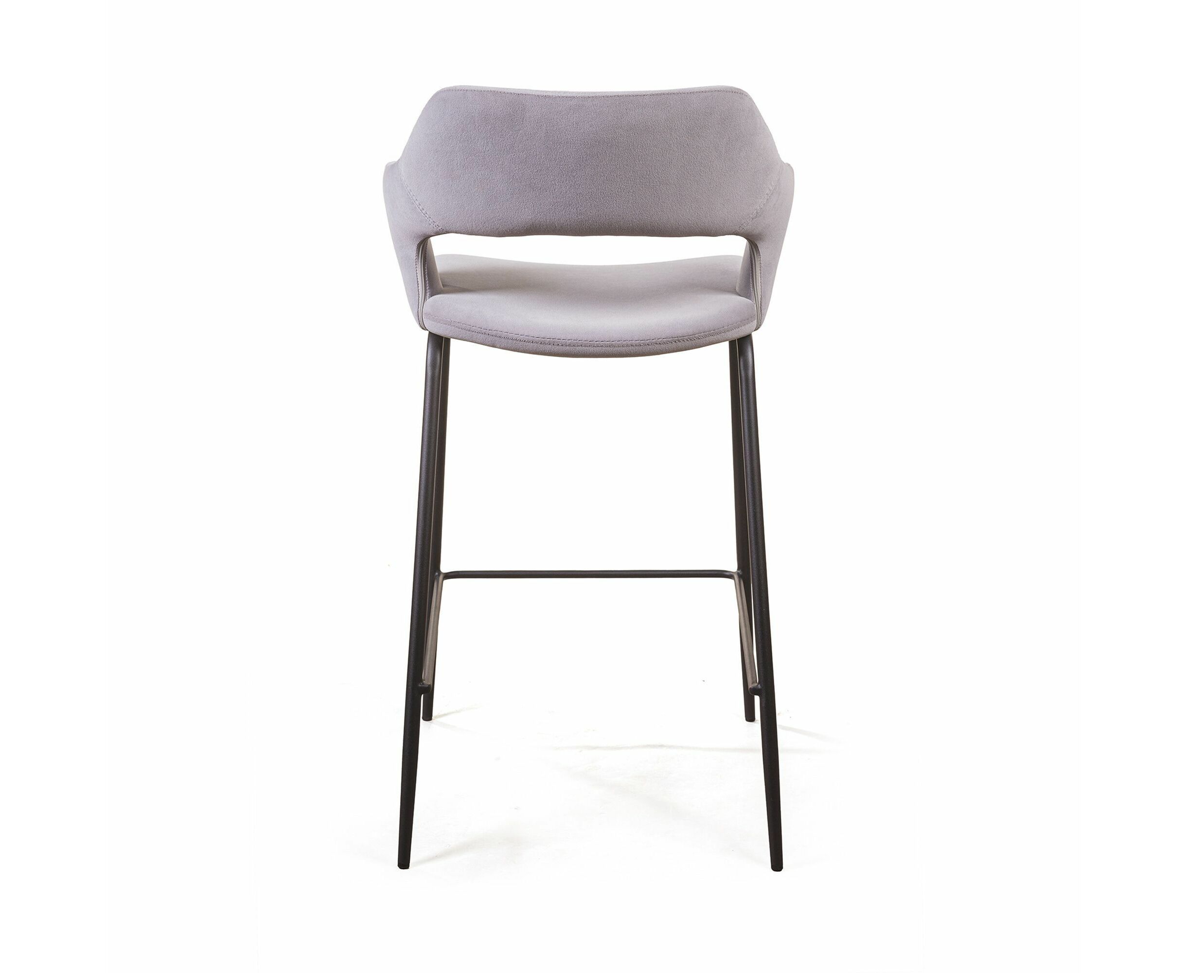 Полубарные стулья с идентичной формой сиденья как-бы парят в воздухе, благодаря тонким, но очень прочным ножкам. Очертания опорной перекладины с прямыми углами подчеркивают футуристичность верхней части, мягкой во всех отношениях.