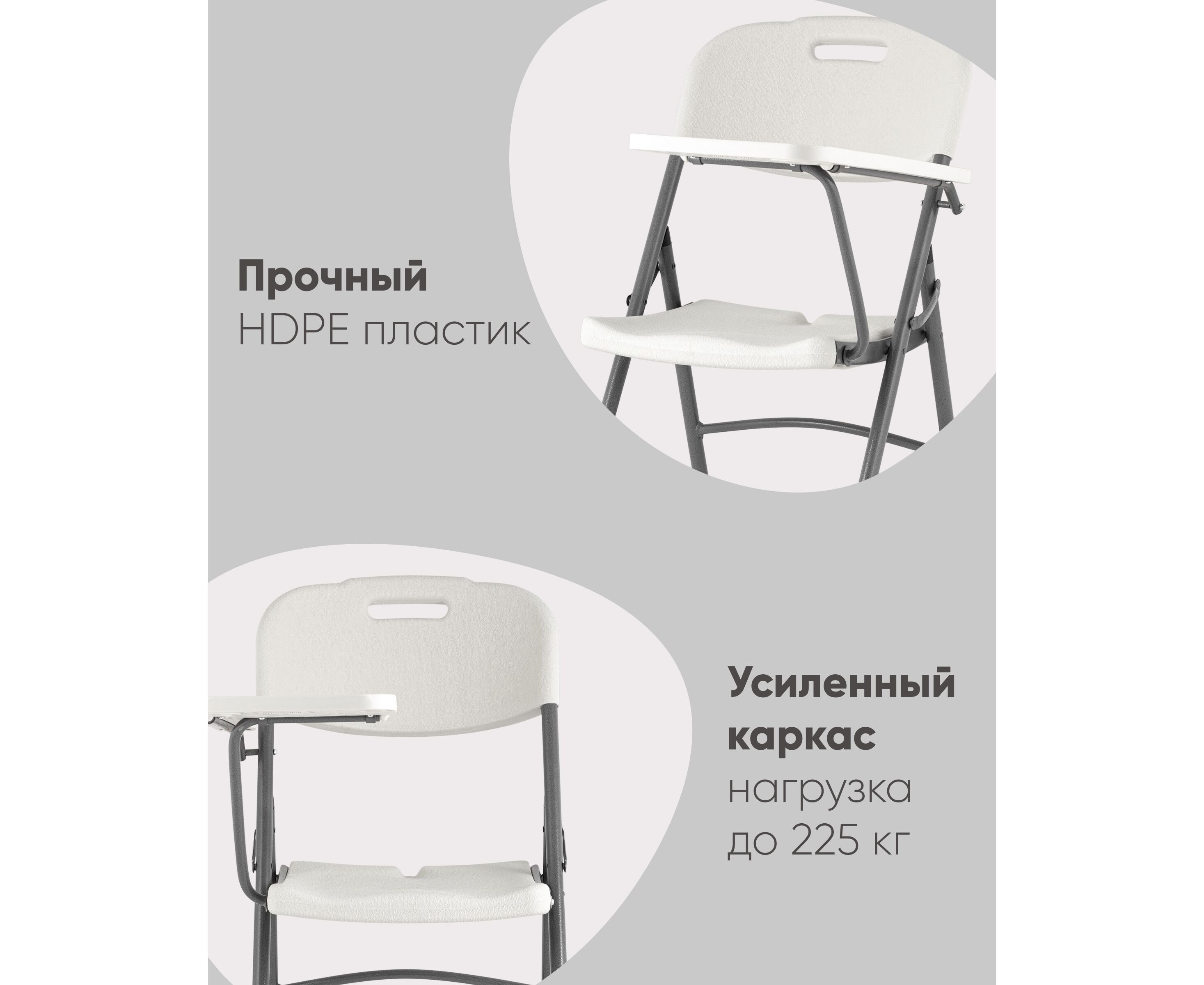Складной пластиковый стул отличается удобной и компактной конструкцией, а также грамотно подобранными материалами. Для каркаса используется стальная труба особой прочности, а сиденье и спинка выполнены из 100% не переработанного полиэтилена HDPE (полиэтилен высокой плотности). Считается одним из более безопасных видов пластика. HDPE пластик выдерживает высокие нагрузки, не трескается при ударной нагрузке, эластичен в диапазоне температур от –70 до +100 °С.