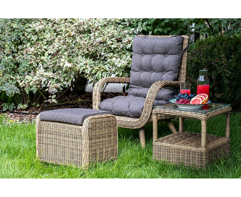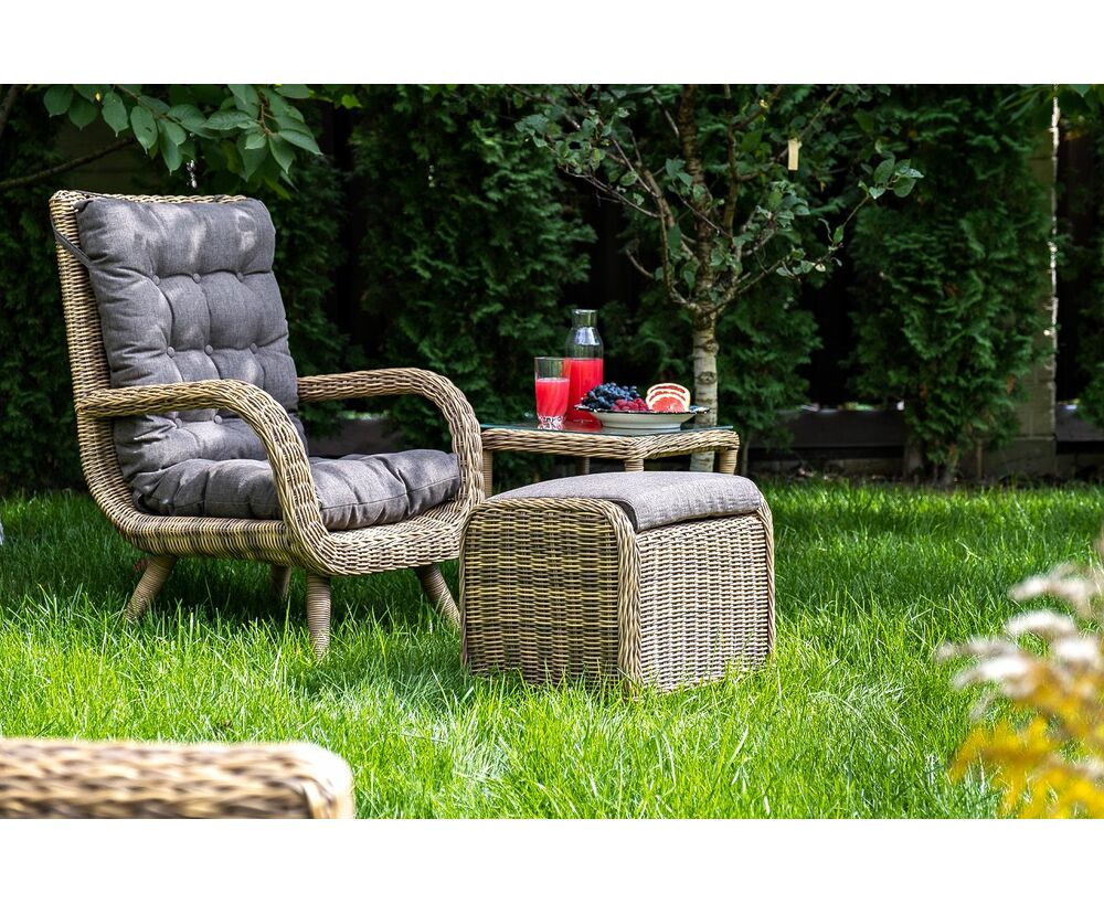 Кресло и пуф укомплектованы подушками со съемными чехлами из влагостойкого 100%-го полиэстера. "Толедо" кресло плетеное с подушками, цвет соломенный 1шт. 690Х810Х990, "Толедо" пуф плетеный, цвет соломенный 1шт. 510Х420Х470, "Форио" столик кофейный из искусственного ротанга, цвет соломенный 1шт. 450Х450Х520,