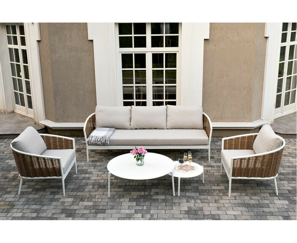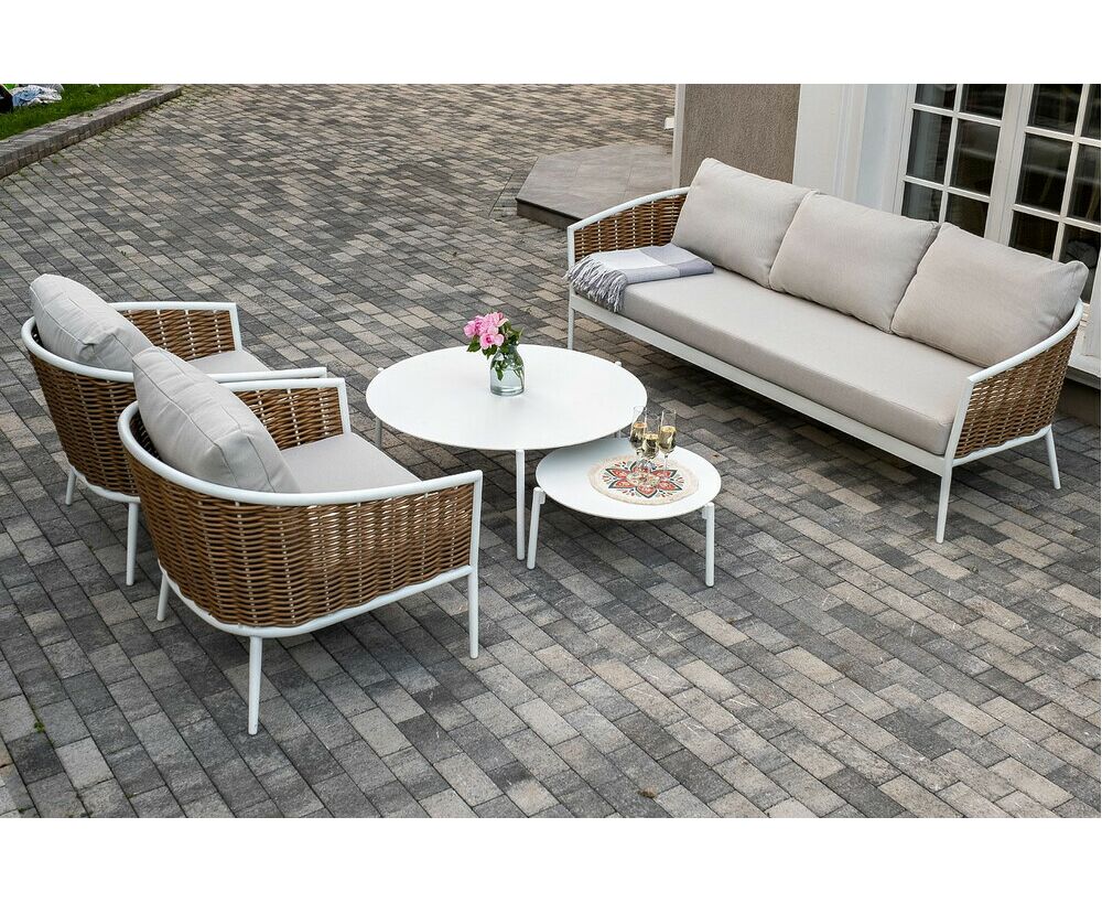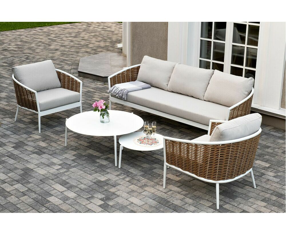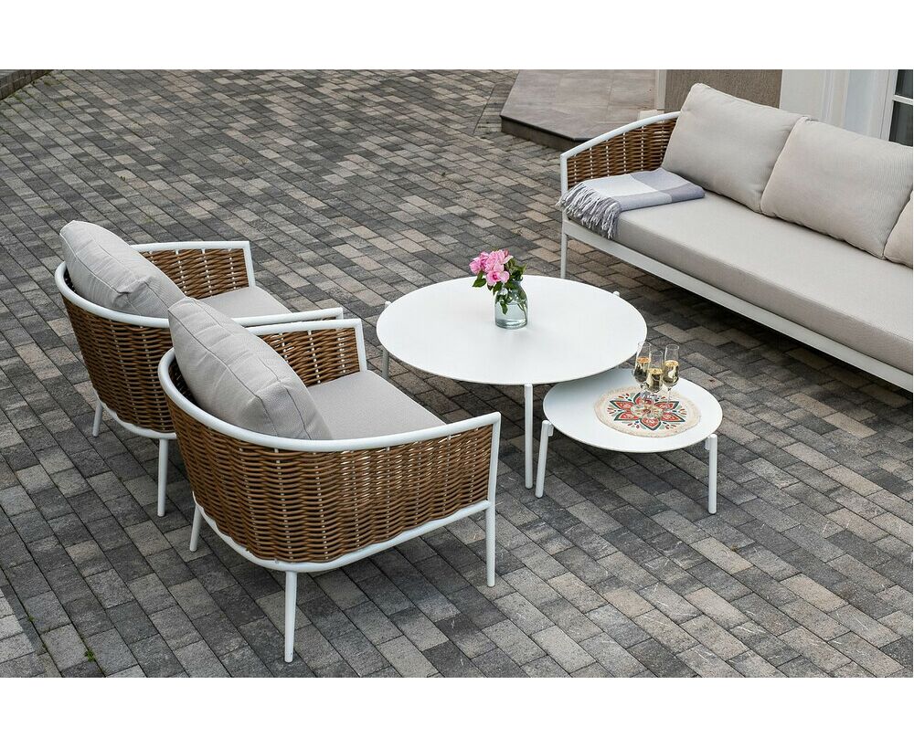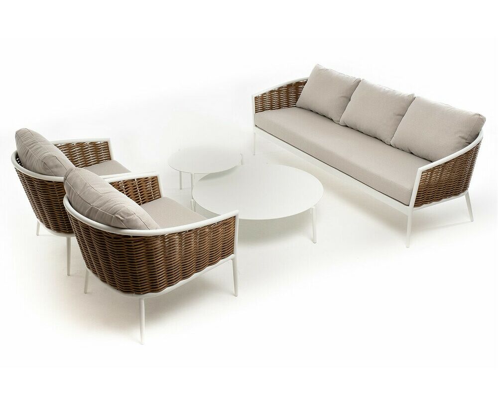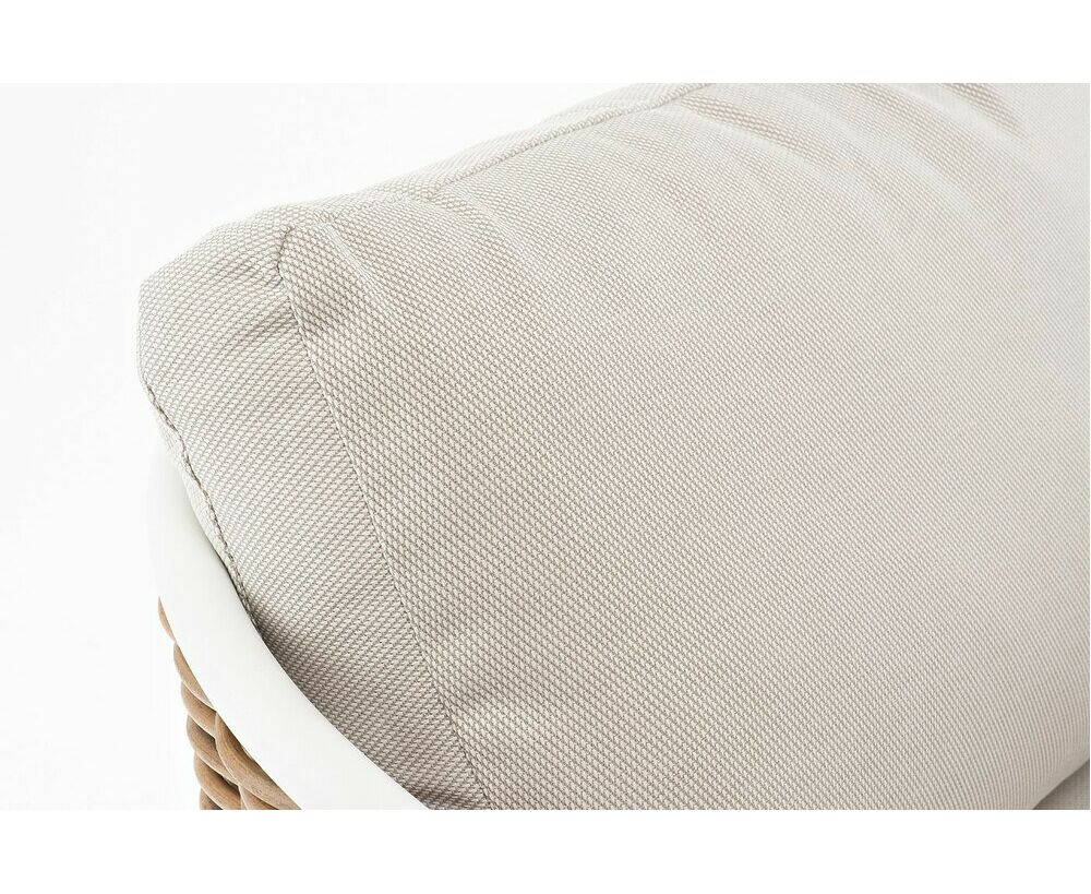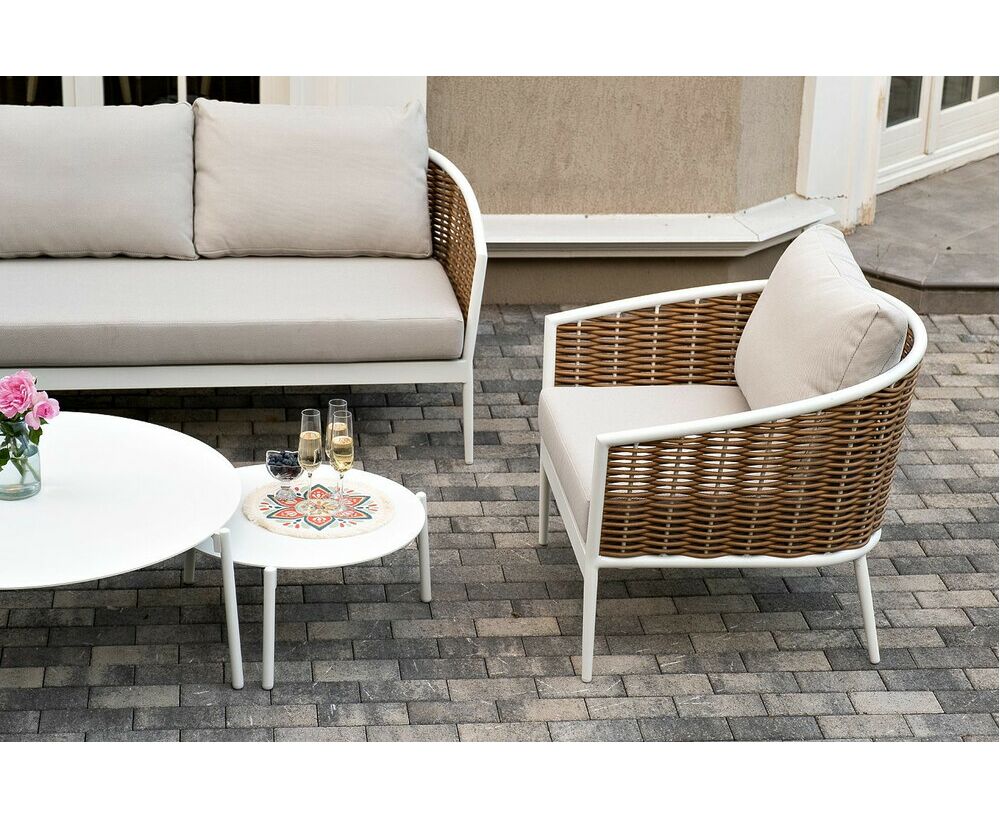 Плетеная мебель дополнена удобными подушками в бежевых чехлах. При их изготовлении используют полиэстер, плотность – 300гр/м2. Он обрабатывается влагоотталкивающей пропиткой для повышения защитных свойств материала. "Тоскана" диван из искусственного ротанга трехместный, цвет соломенный 1шт. 2 260Х815Х750, "Тоскана" кресло из искусственного ротанга, цвет соломенный 2шт. 815Х870Х750, "Тоскана" журнальный столик круглый Ø103, H28,5, цвет белый 1шт. 1 030Х1 030Х285, "Тоскана" журнальный столик круглый Ø65, H38,5, цвет белый 1шт. 650Х650Х385,