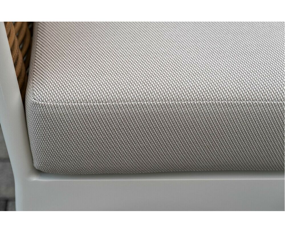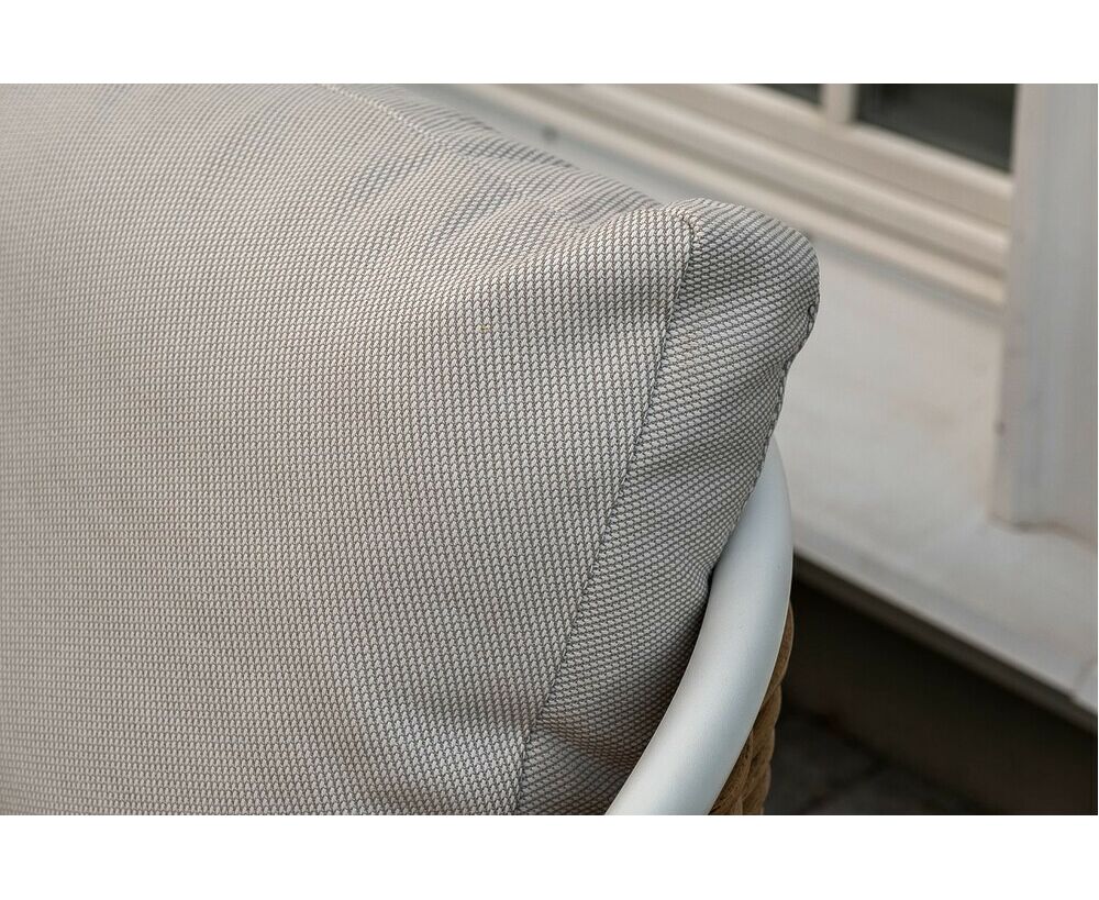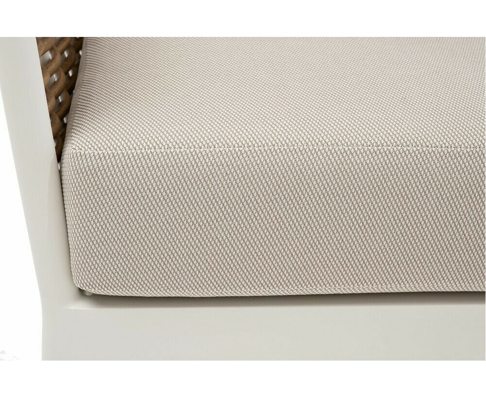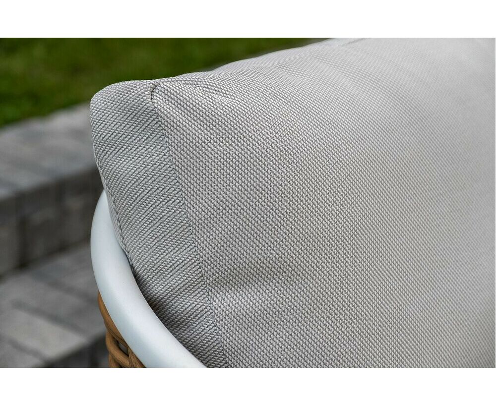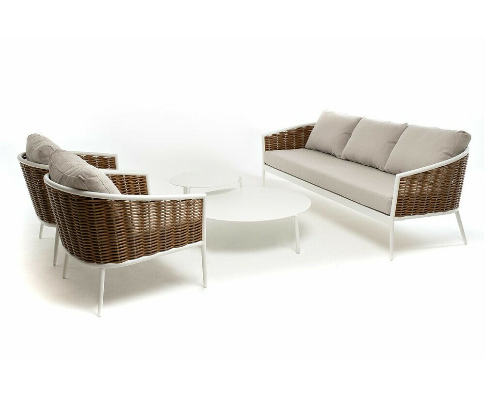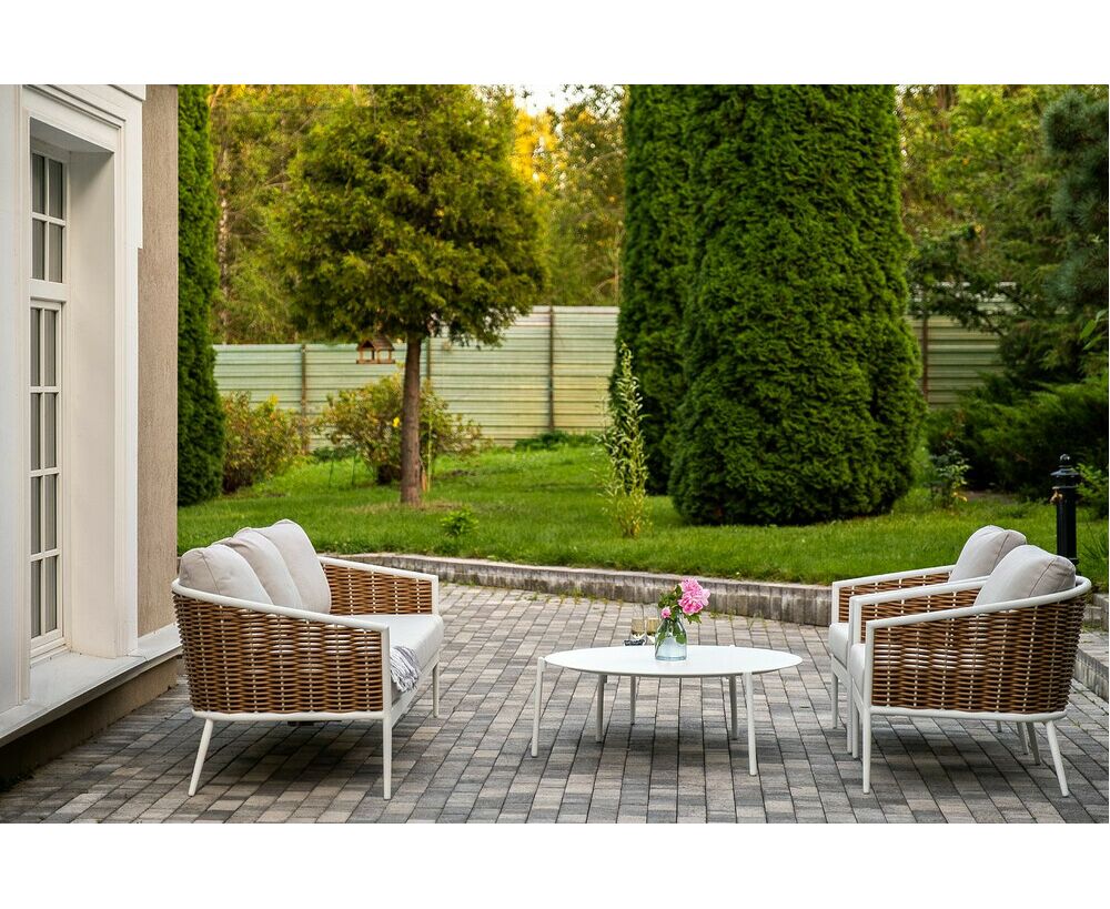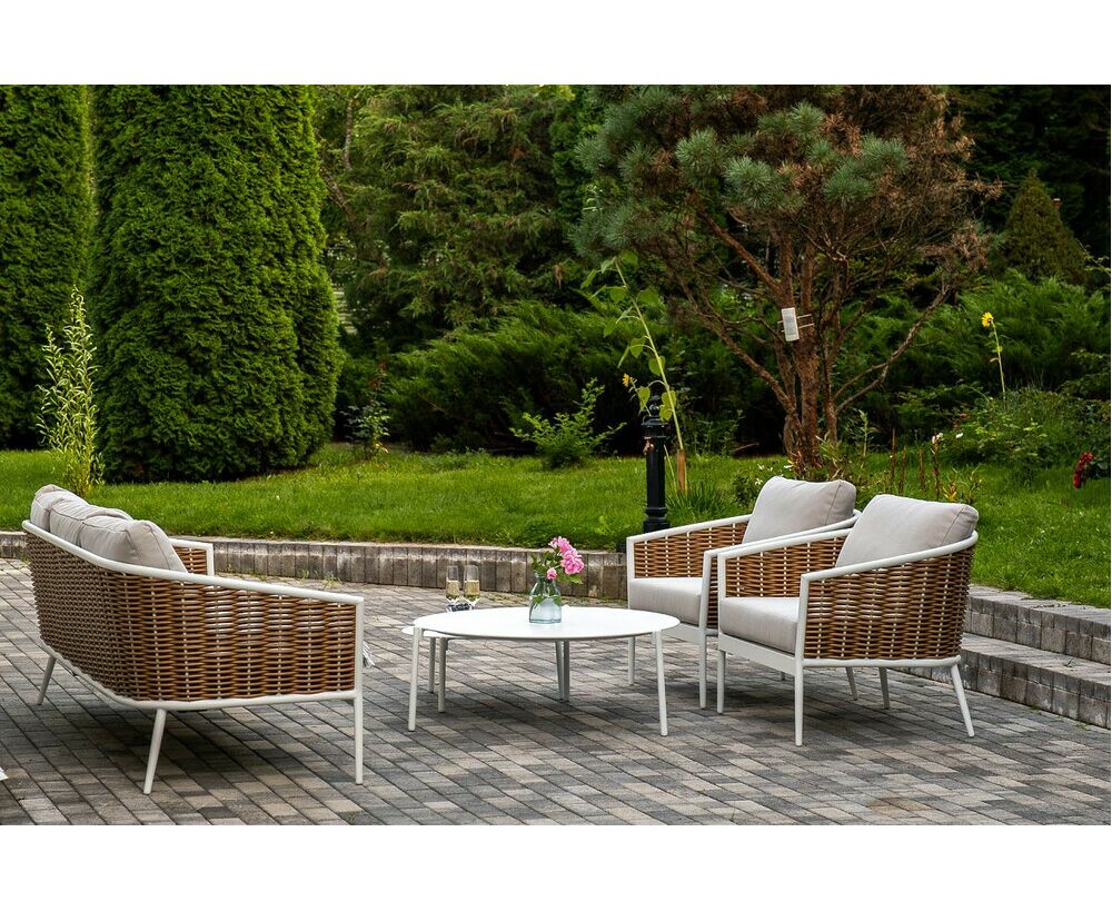 Плетеная мебель дополнена удобными подушками в бежевых чехлах. При их изготовлении используют полиэстер, плотность – 300гр/м2. Он обрабатывается влагоотталкивающей пропиткой для повышения защитных свойств материала. "Тоскана" диван из искусственного ротанга трехместный, цвет соломенный 1шт. 2 260Х815Х750, "Тоскана" кресло из искусственного ротанга, цвет соломенный 2шт. 815Х870Х750, "Тоскана" журнальный столик круглый Ø103, H28,5, цвет белый 1шт. 1 030Х1 030Х285, "Тоскана" журнальный столик круглый Ø65, H38,5, цвет белый 1шт. 650Х650Х385,