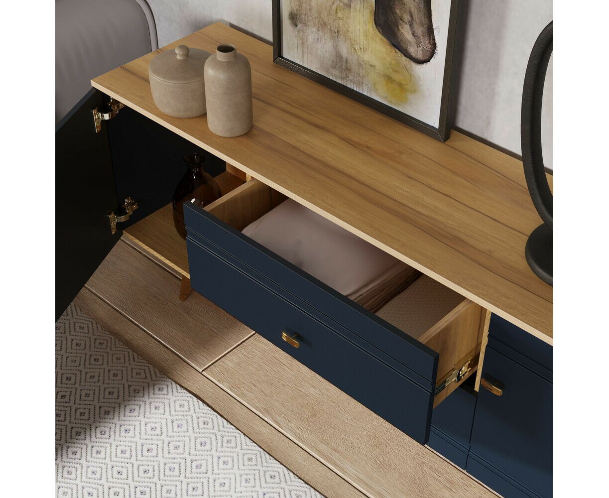 - надежная фурнитура продлит срок службы мебели, выдвижные ящики оснащены качественными шариковыми направляющими, а петли дверцы с доводчиком обеспечивают бесшумное закрытие;