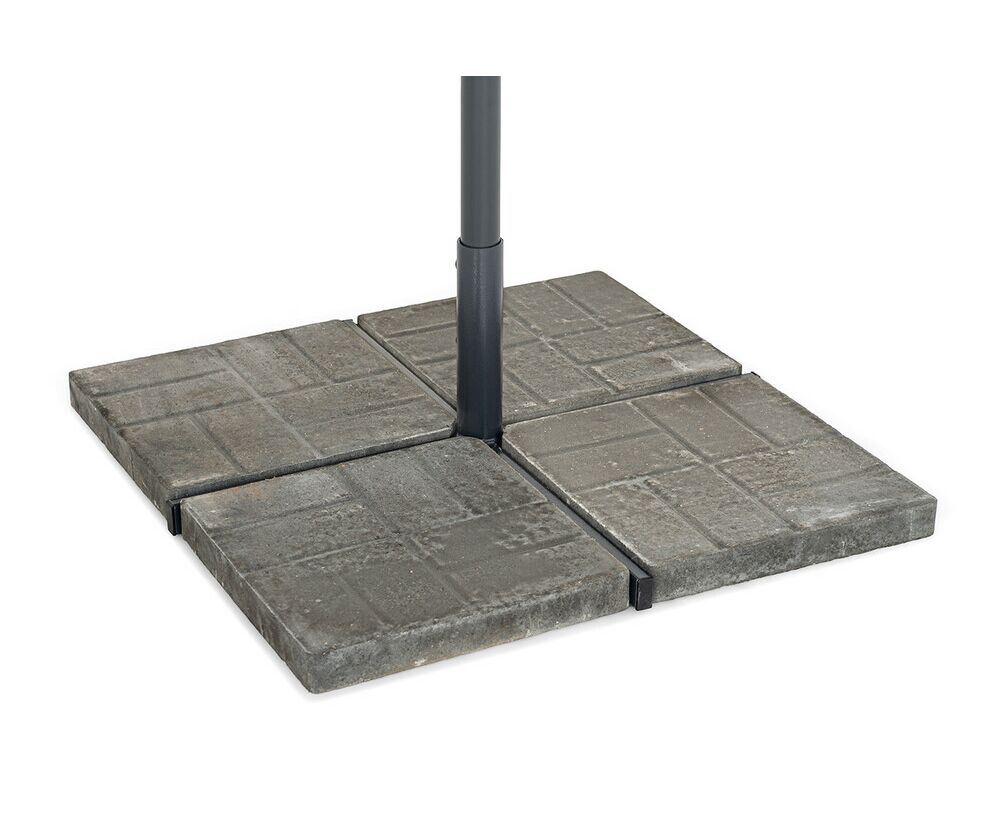 В комплект входят: крестовина, 4 утяжелительных плиты и трубка для зонта. Каждая плита весит не менее 16 кг, габариты — 810×810×50 мм. Общий вес базы с крестовиной составляет 71 кг.