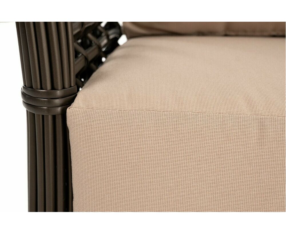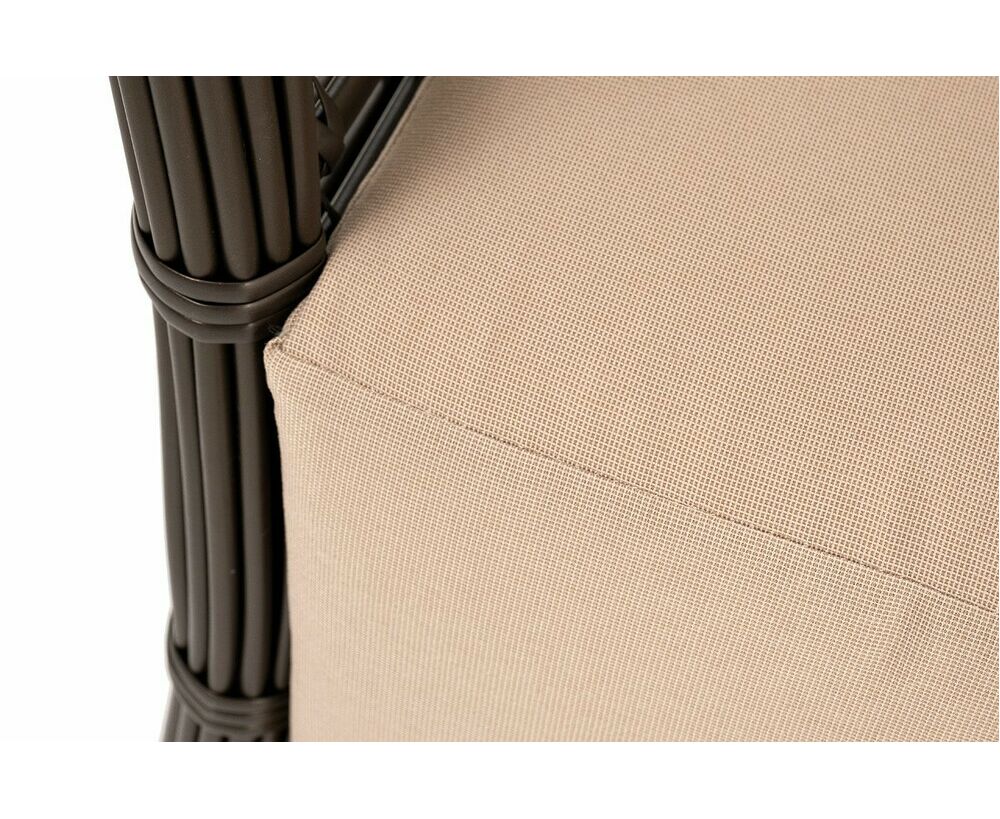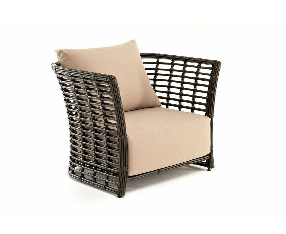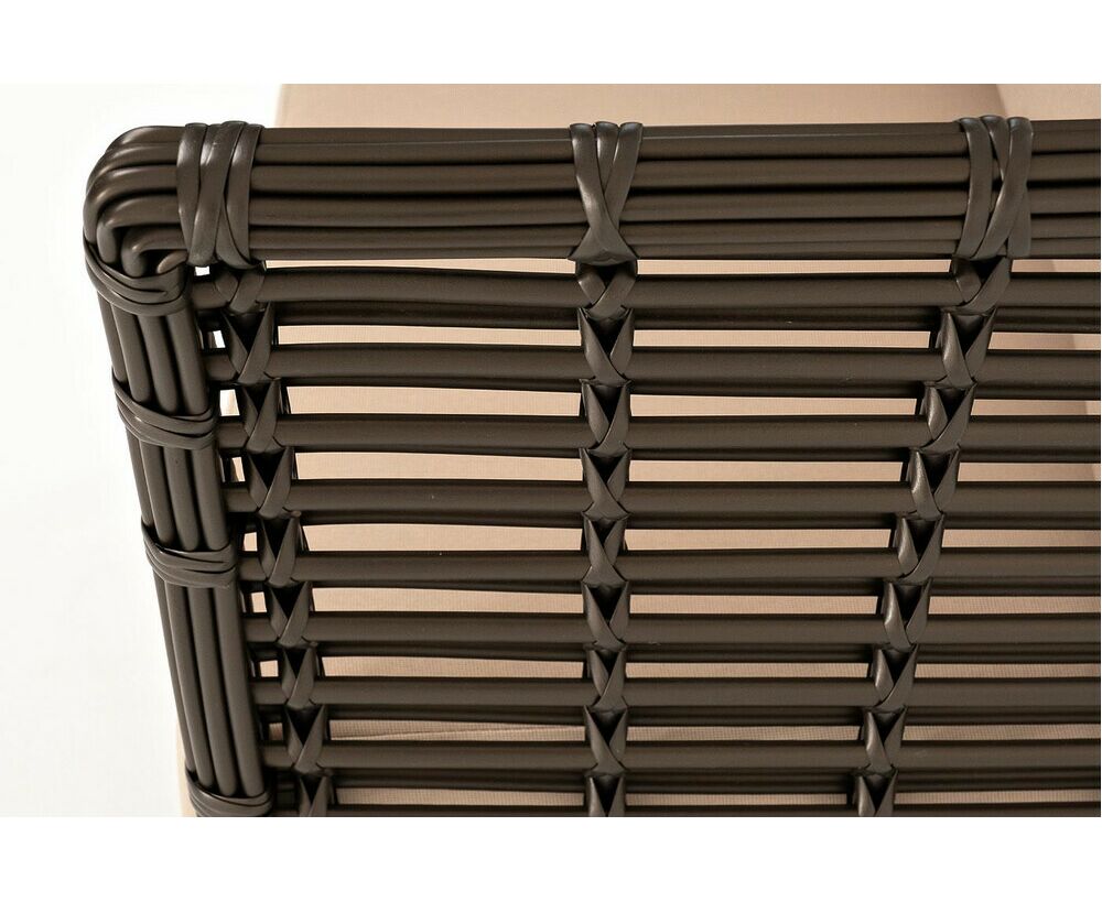 Кресло оснащено каркасом из прочного алюминия, ручное круглое плетение является основным декоративным элементом мебели. Оно выполнено из искусственного ротанга в бронзовом цвете.