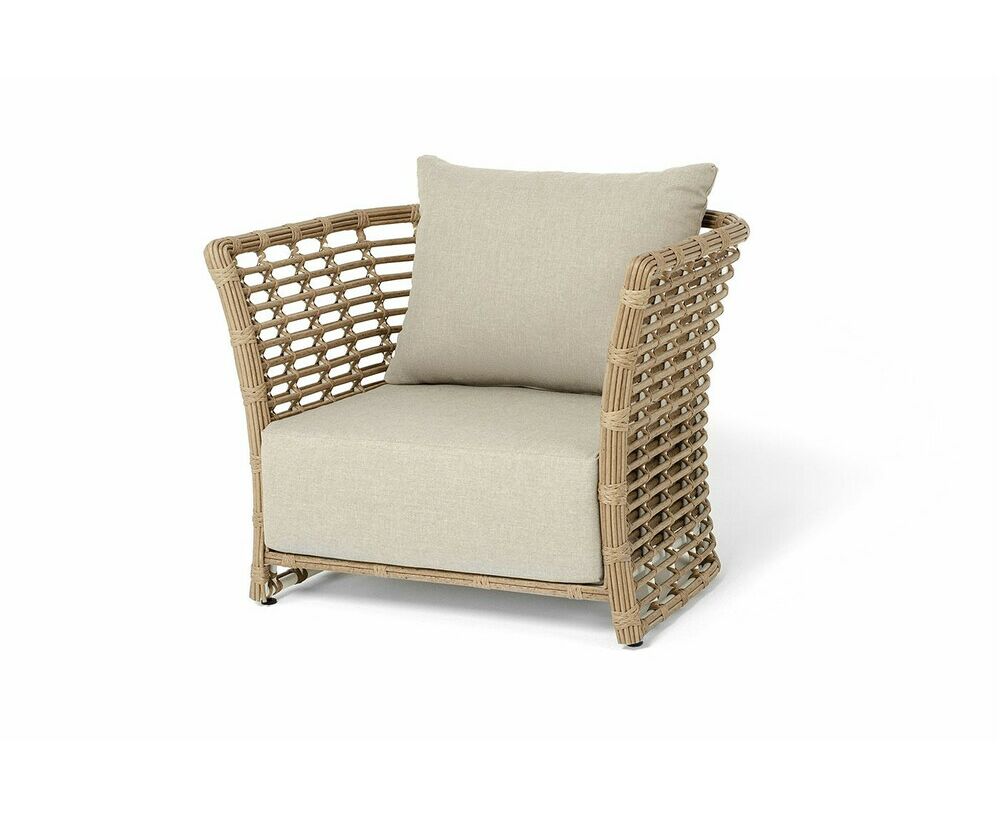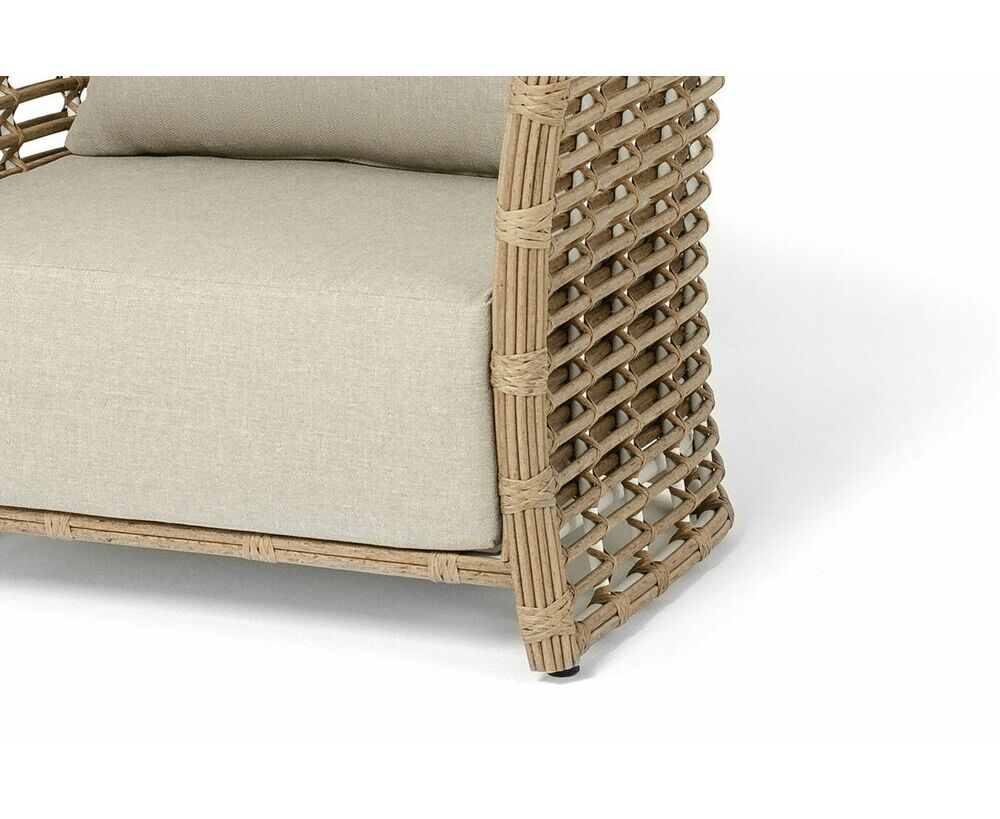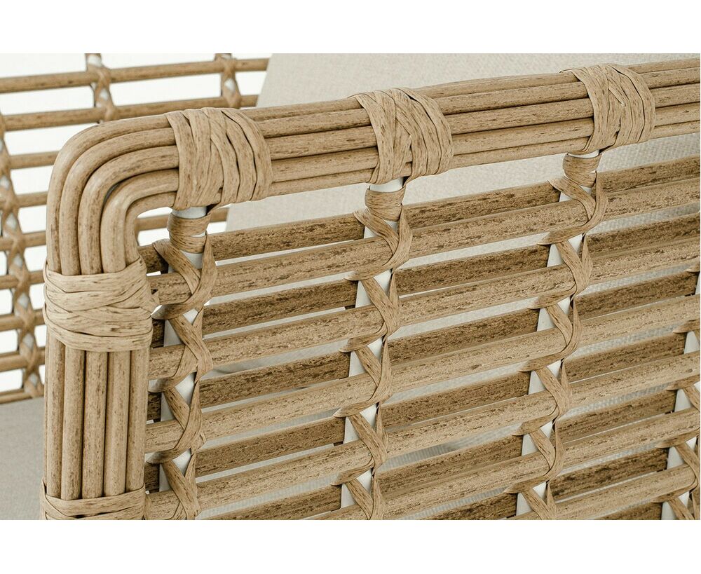 Кресло оснащено каркасом из прочного алюминия, ручное круглое плетение является основным декоративным элементом мебели. Оно выполнено из искусственного ротанга в соломенном цвете.