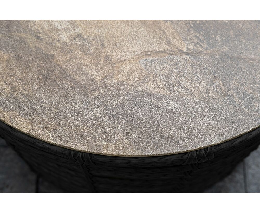 Журнальный столик выполнен из алюминия, вручную оплетенного круглым искусственным ротангом. Столешница из закаленного стекла толщиной 5 мм. Благодаря износостойким материалам, стол пригоден для использования на улице при любой погоде и не требует специальных условий хранения.
