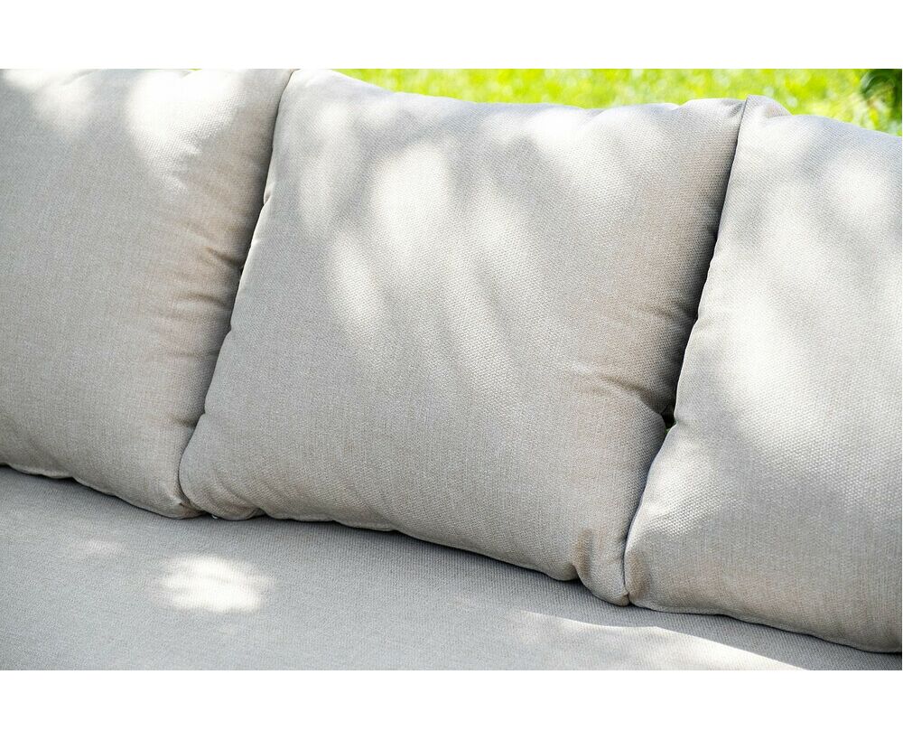Плетеная мебель дополнена удобными подушками в бежевых чехлах. При их изготовлении используют полиэстер, плотность – 300гр/м2. Он обрабатывается влагоотталкивающей пропиткой для повышения защитных свойств материала.