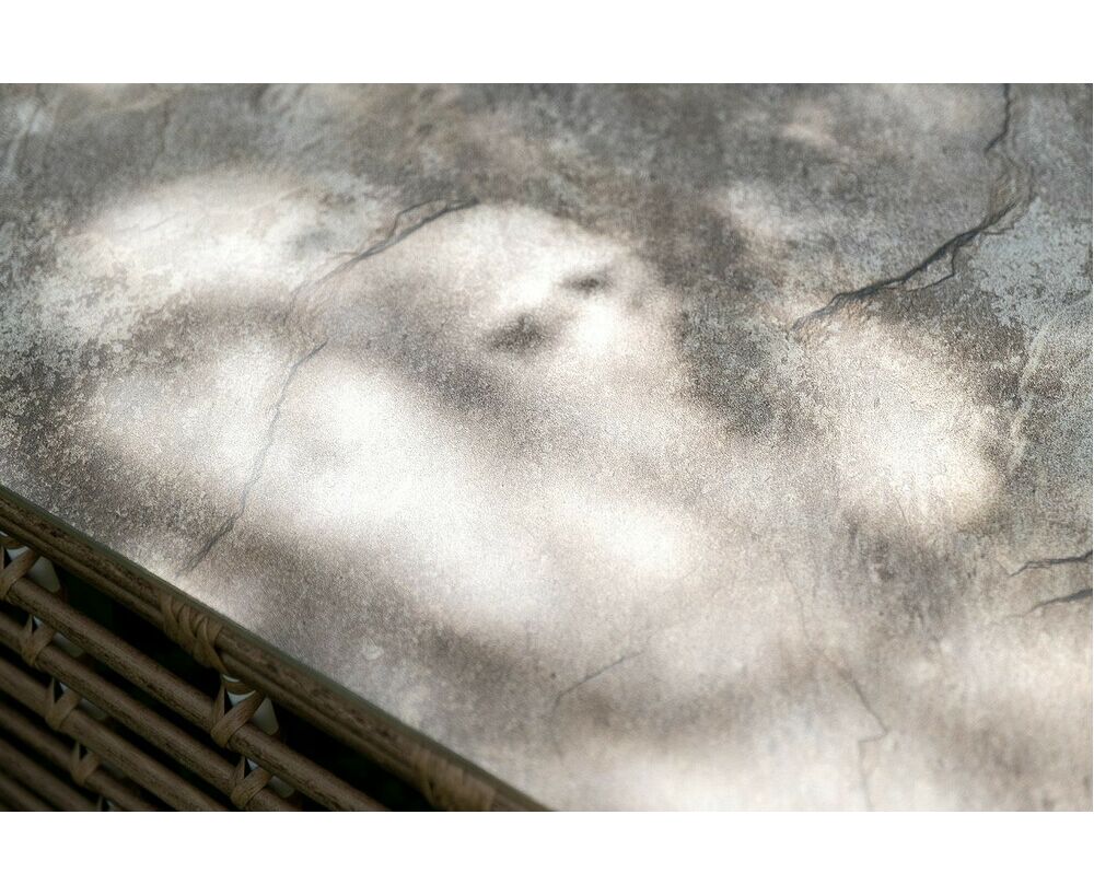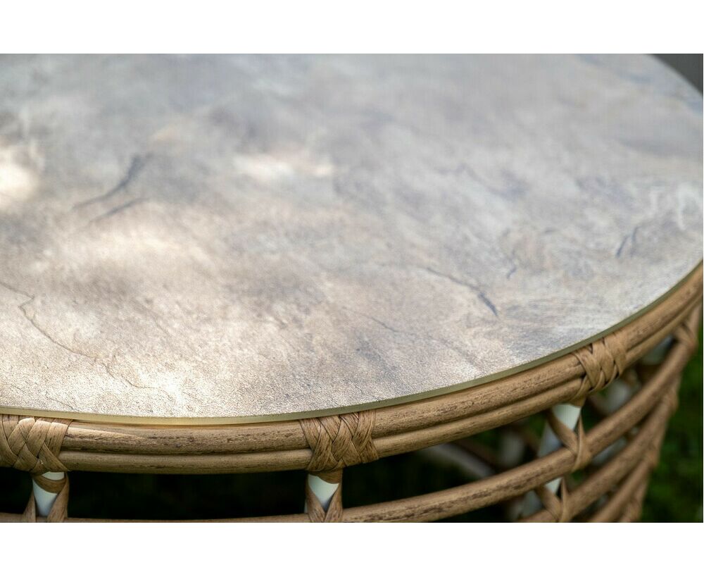 Журнальный столик выполнен из алюминия, вручную оплетенного круглым искусственным ротангом. Столешница из закаленного стекла толщиной 5 мм. Благодаря износостойким материалам, стол пригоден для использования на улице при любой погоде и не требует специальных условий хранения.