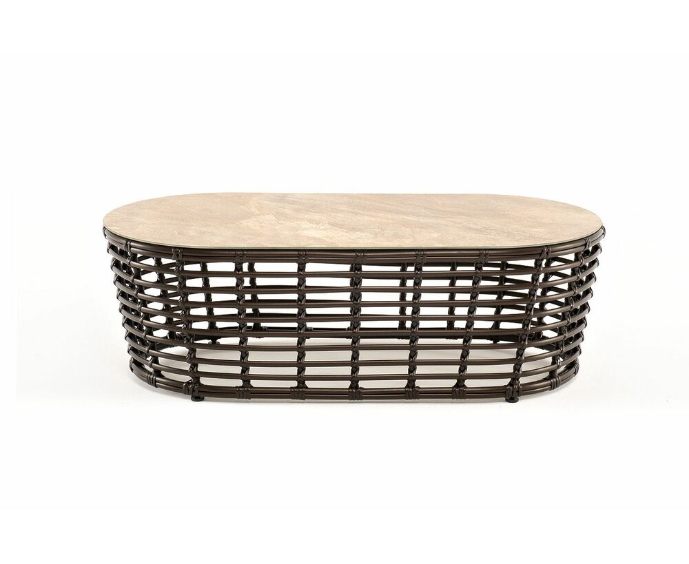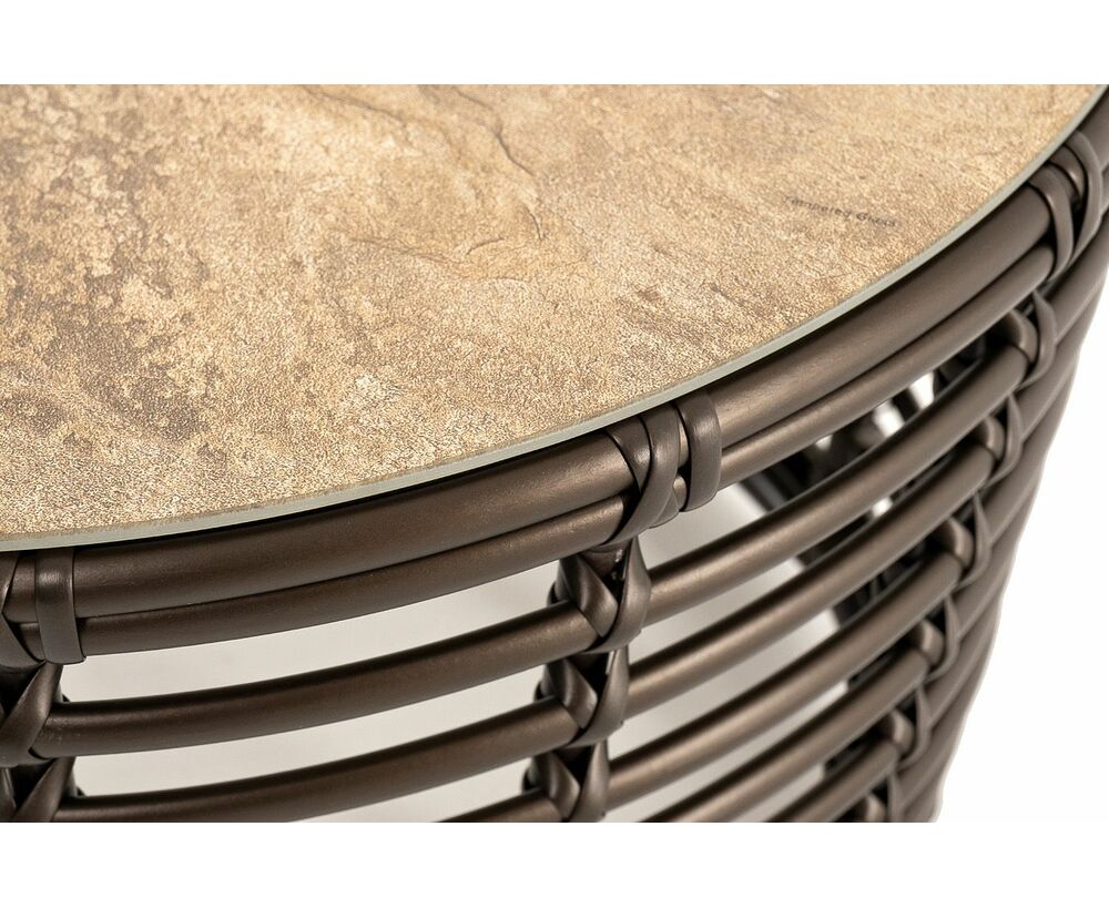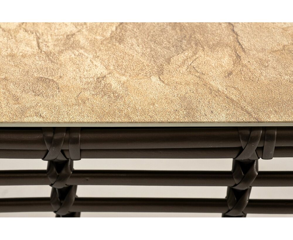 Каркас столика изготовлен из алюминия, вручную оплетенного круглым искусственным ротангом.