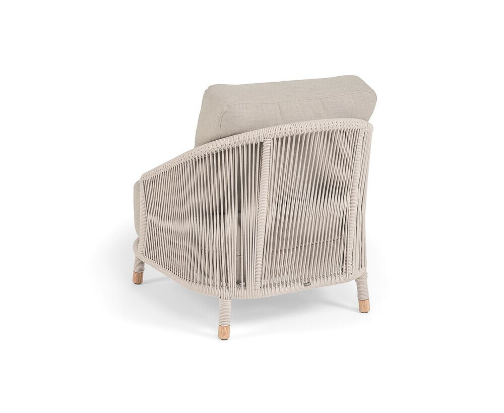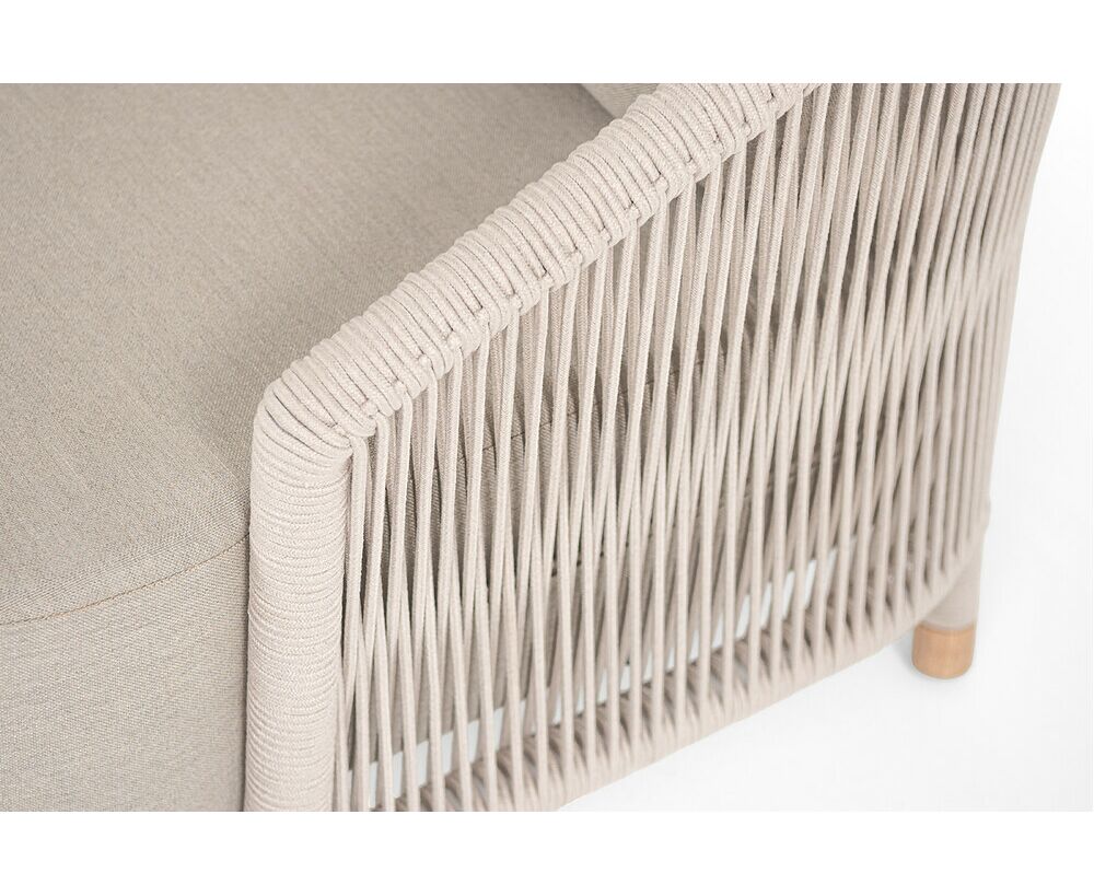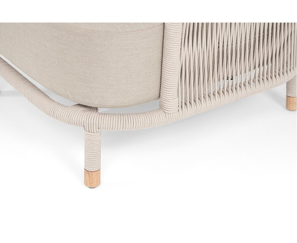 Кресло имеет алюминиевый каркас, окрашенный порошковой краской в белый цвет. Боковины каркаса вручную оплетены роупом - эластичными синтетическими лентами, изготовленными из высокопрочных полиэфирных волокон. Цвет оплетки - бежевый. На ножках кресла идут дубовые наконечники (заглушки).