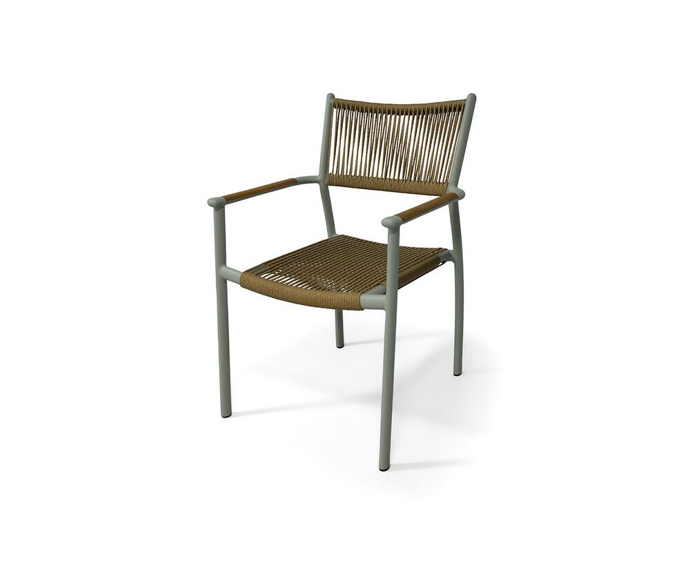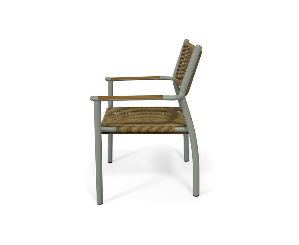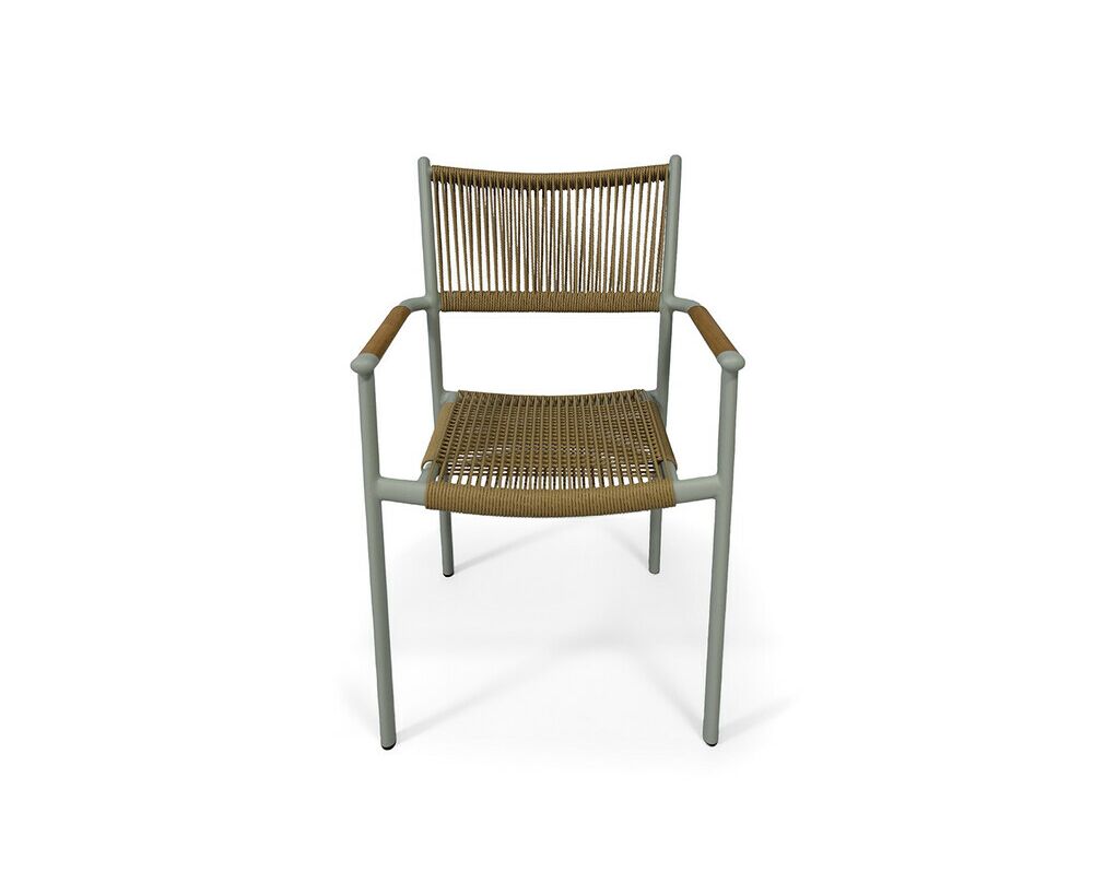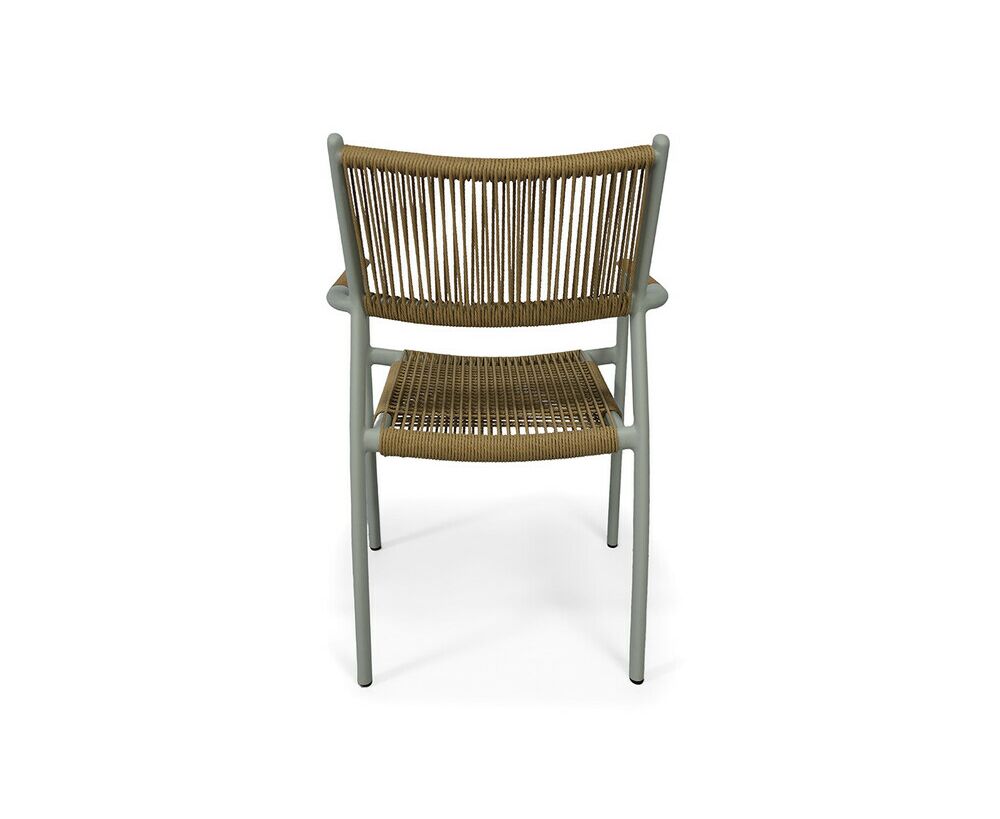 Каркас стула выполнен из легкого, но прочного алюминия, обработанного порошковым покрытием в нежном светло-сером оттенке. Это покрытие не только придает стулу элегантный вид, но и обеспечивает устойчивость к воздействию окружающей среды, делая его идеальным выбором для использования на открытом воздухе.