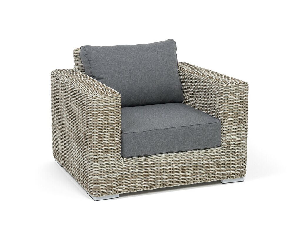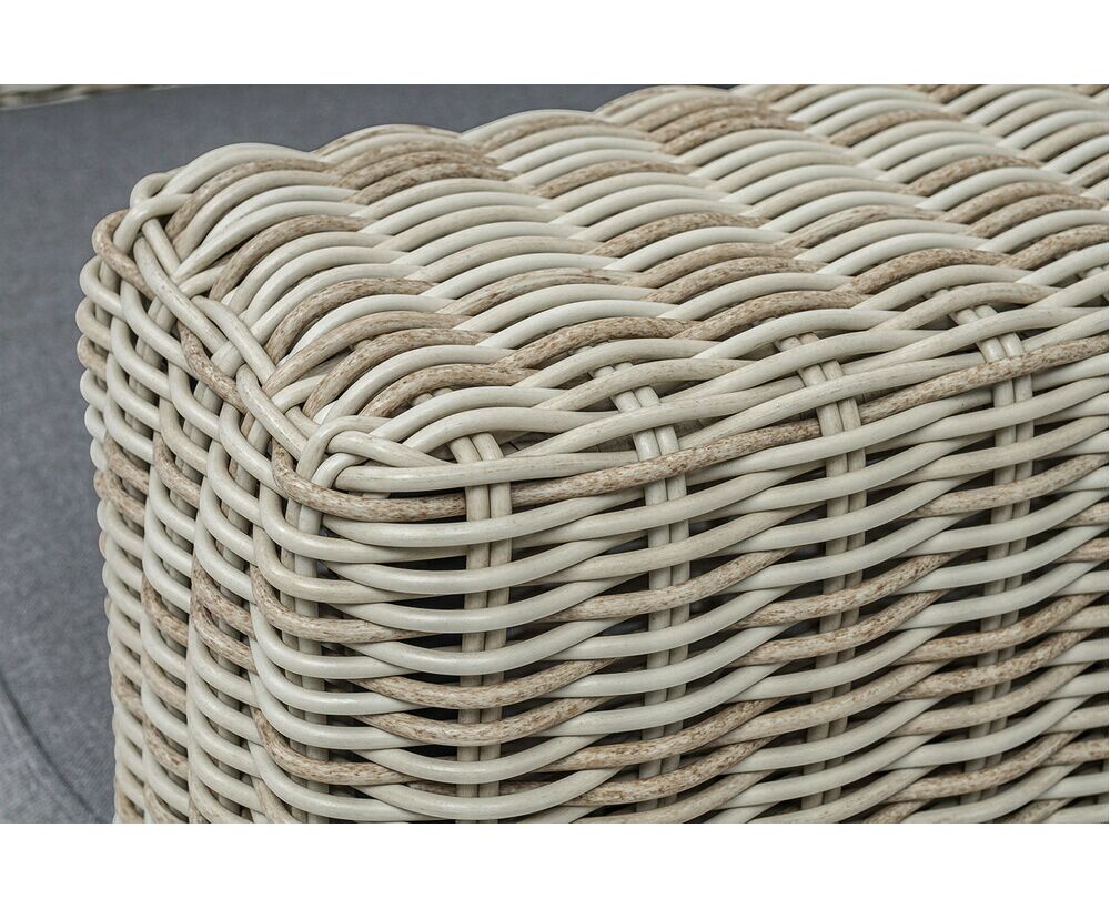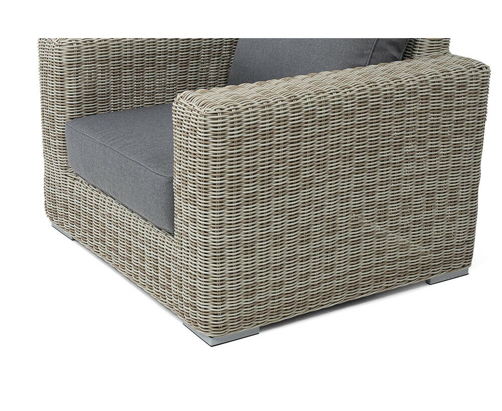 Кресло оснащено каркасом из прочного алюминия, ручное круглое плетение является основным декоративным элементом мебели. Оно выполнено из искусственного ротанга в бежевом цвете.