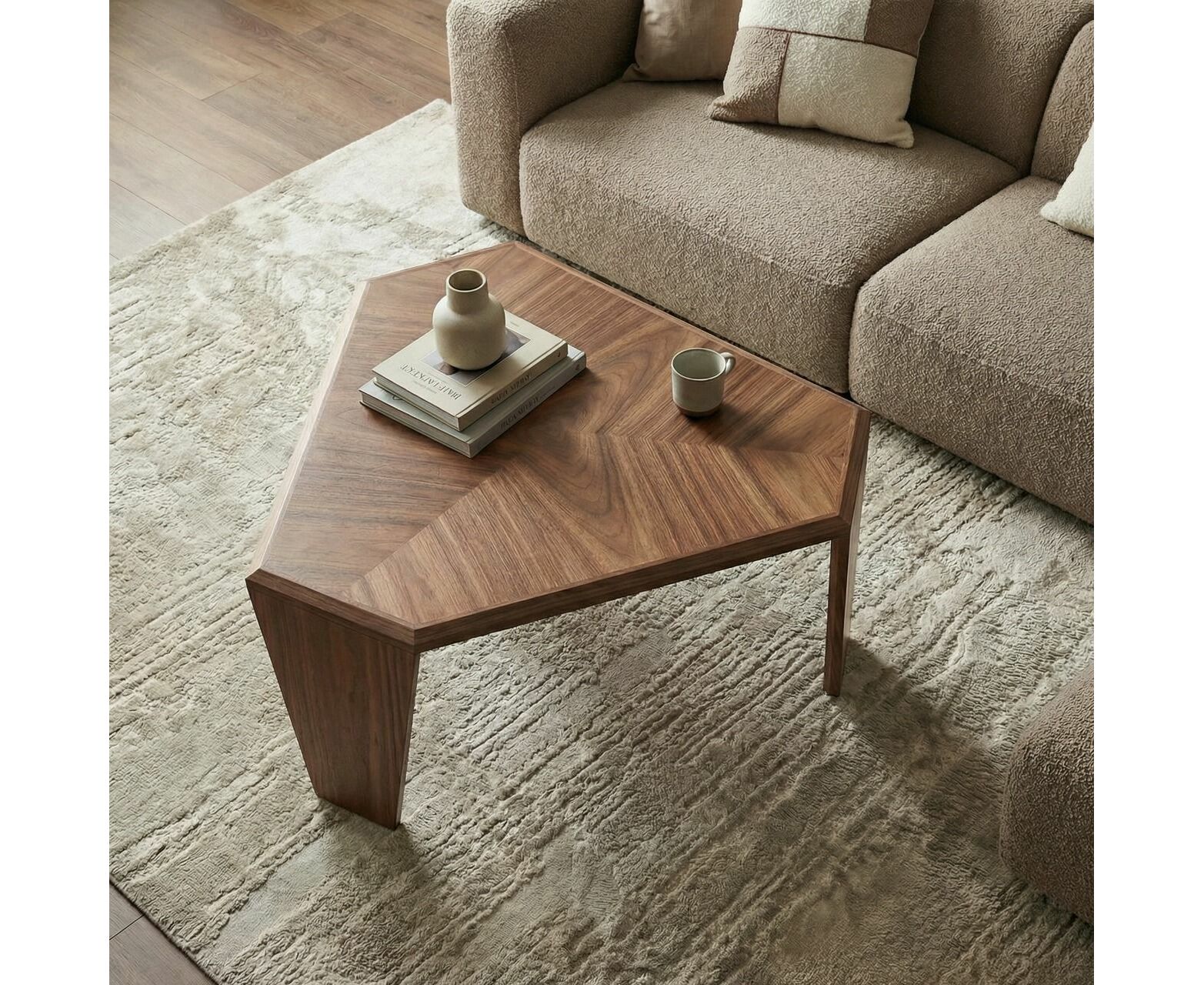 Треугольник — самая динамичная фигура в дизайне. В журнальном столике Nidji его энергия смягчена усеченными углами, превращающими строгую форму в элегантный гексагон (шестиугольник). Это акцент, который невозможно не заметить. Благодаря идеальным пропорциям и живой текстуре дерева, этот стол будет естественным центром притяжения для зон отдыха, шоурумах или просторных гостиных.