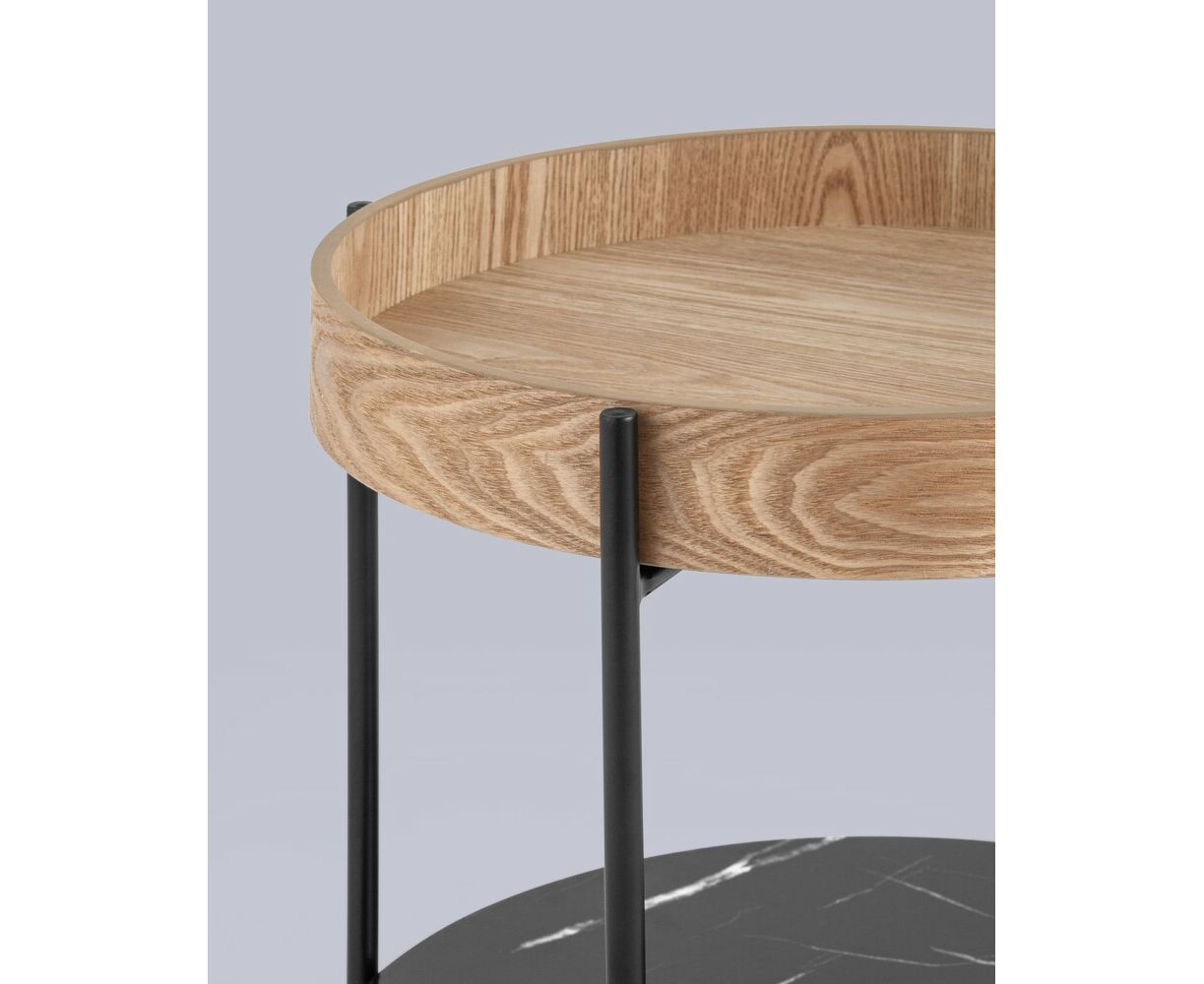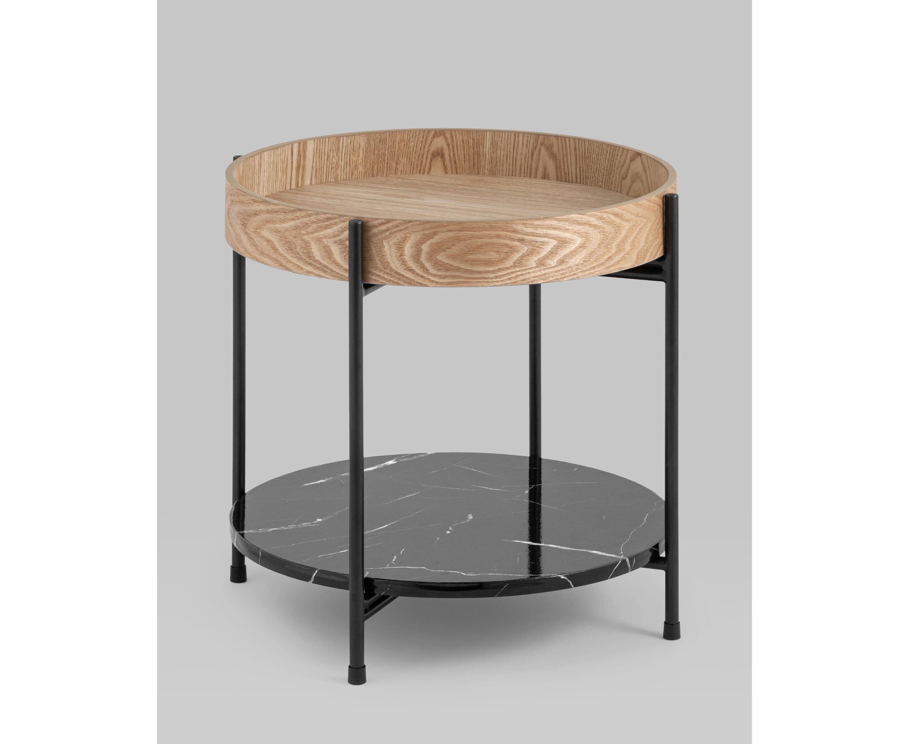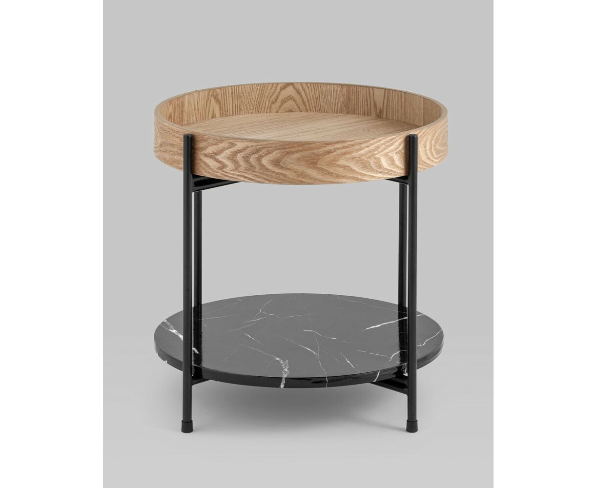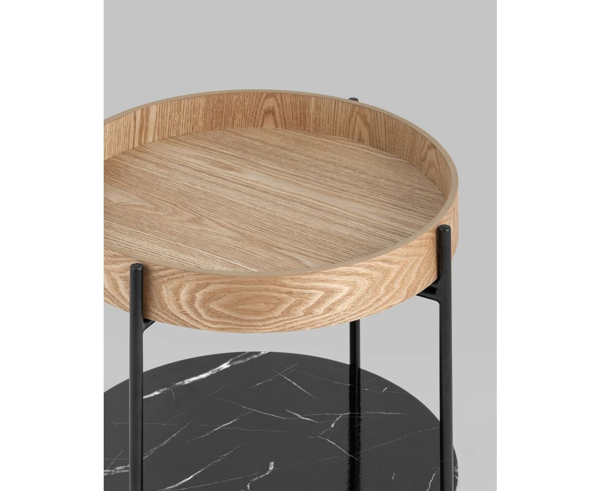 Круглый журнальный столик в современном минималистичном дизайне впишется в любой интерьер. Столешница выполнена из МДФ и покрыта шпоном из ясеня. Высокие бортики по краям предотвращают падение предметов со столика. Нижняя полка из МДФ с рисунком под мрамор идеально подойдет для хранения книг или журналов. Черный металлический каркас выдерживает нагрузку до 50 кг. Пластиковые подпятники в основании ножек защищают напольные покрытия от царапин и предотвращают скольжение.