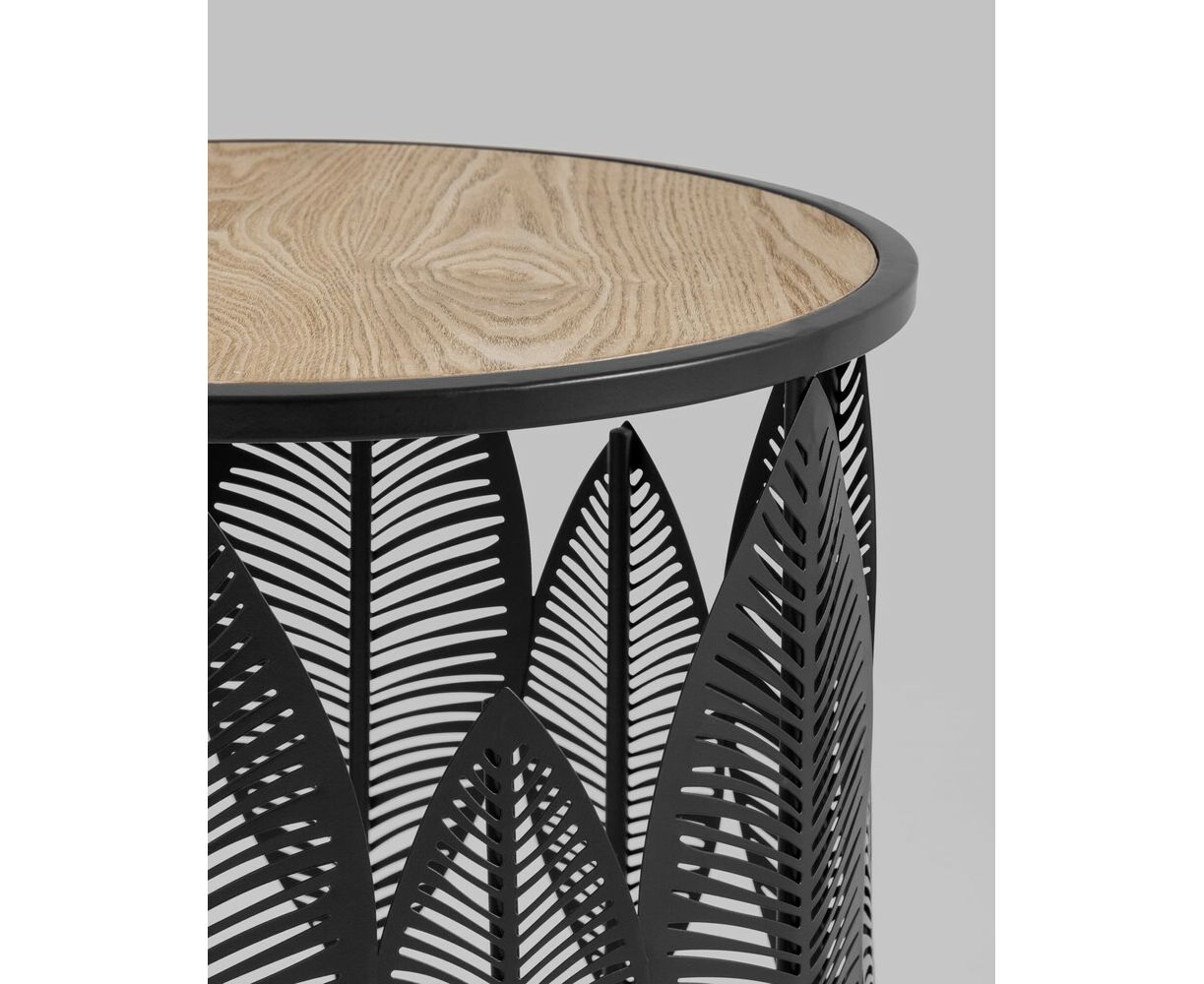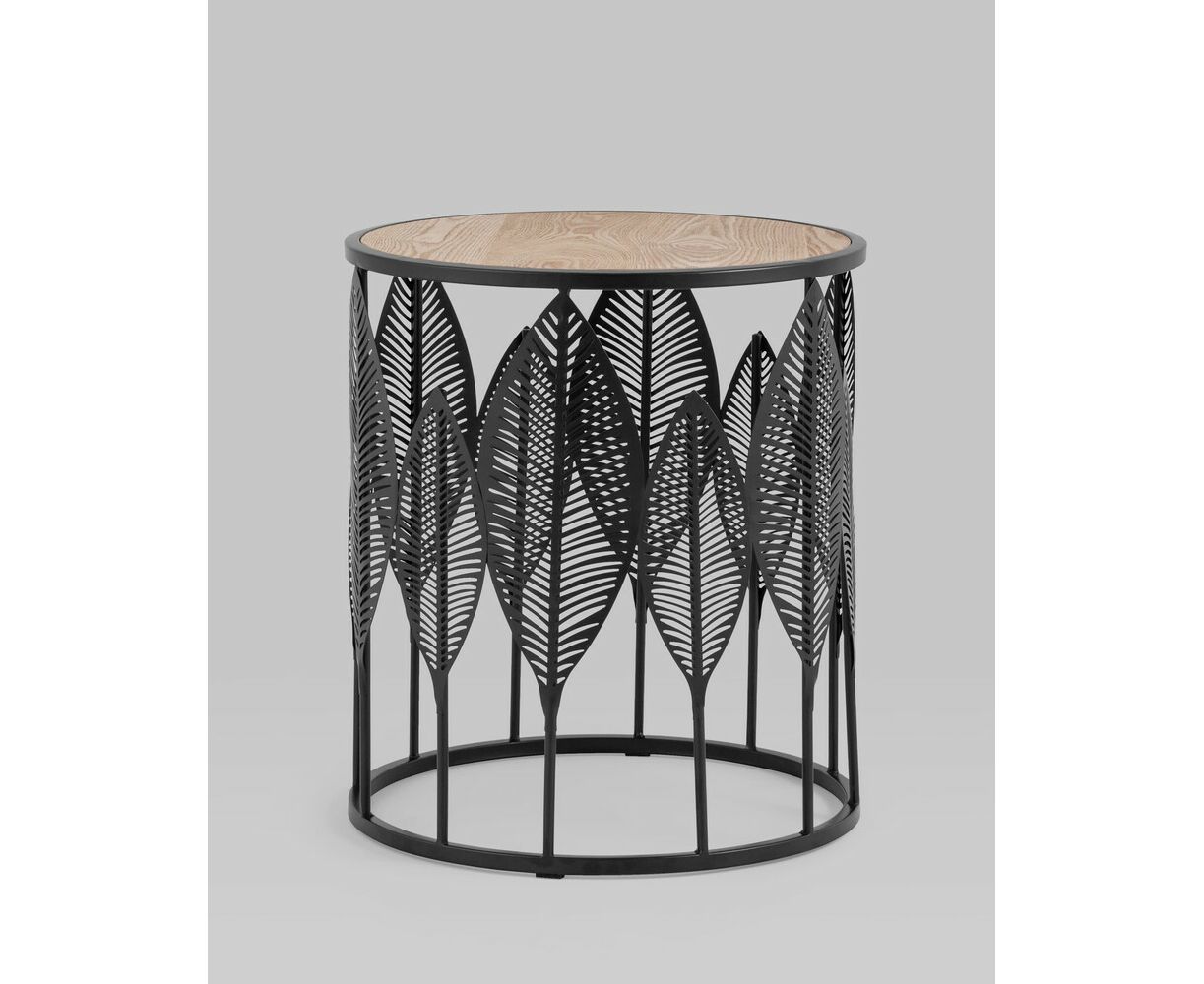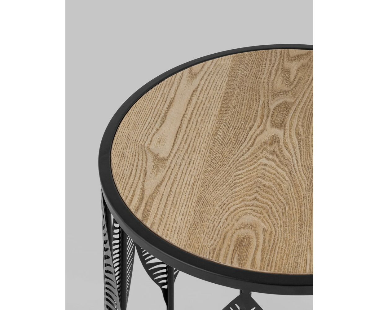 Круглый журнальный столик с черным каркасом. Столешница выполнена из МДФ и покрыта шпоном светлого дерева, гармонично сочетается с природными мотивами основания столика. Металлический каркас черного цвета выдерживает нагрузку до 50 кг. Журнальный столик поможет дополнить интерьер в эко-стиле и добавить уюта.