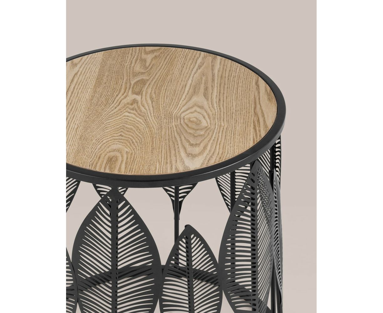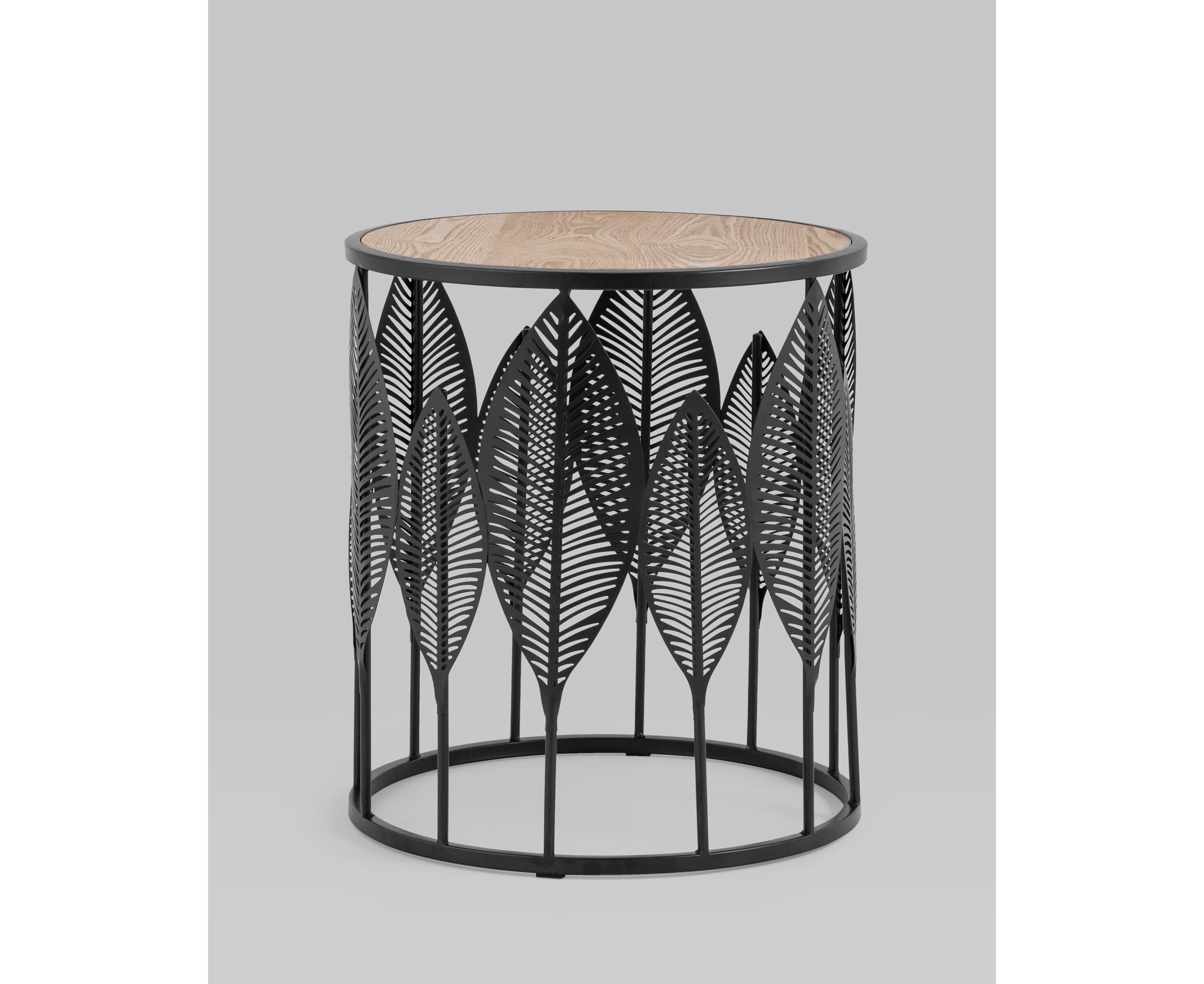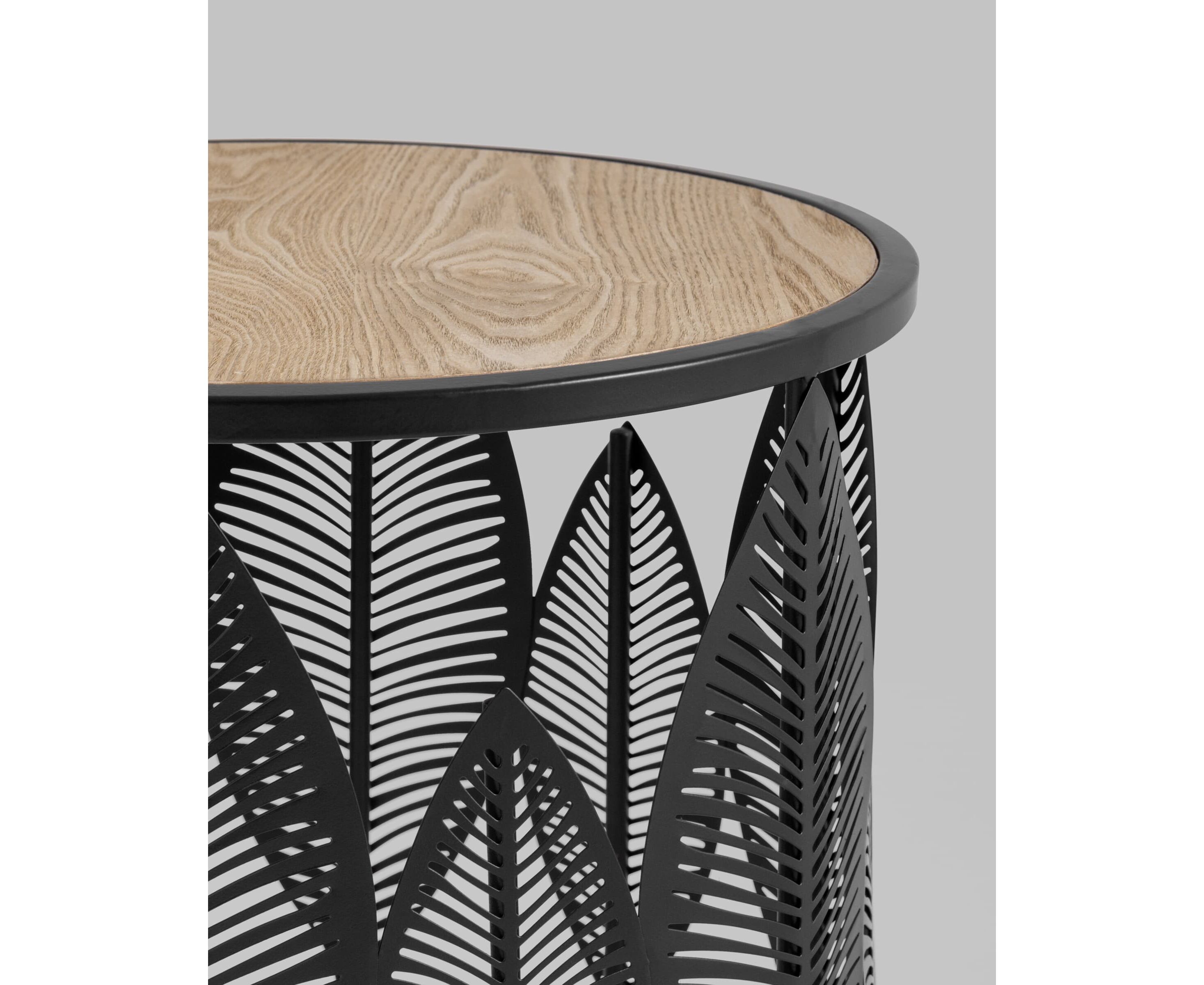 Круглый журнальный столик с черным каркасом. Столешница выполнена из МДФ и покрыта шпоном светлого дерева, гармонично сочетается с природными мотивами основания столика. Металлический каркас черного цвета выдерживает нагрузку до 50 кг. Журнальный столик поможет дополнить интерьер в эко-стиле и добавить уюта.